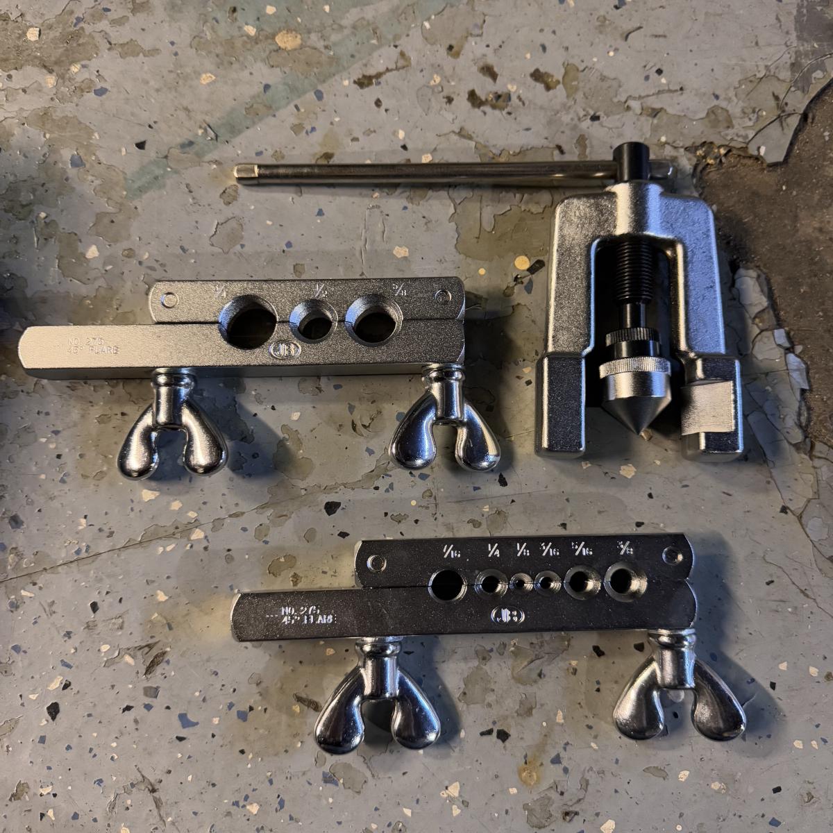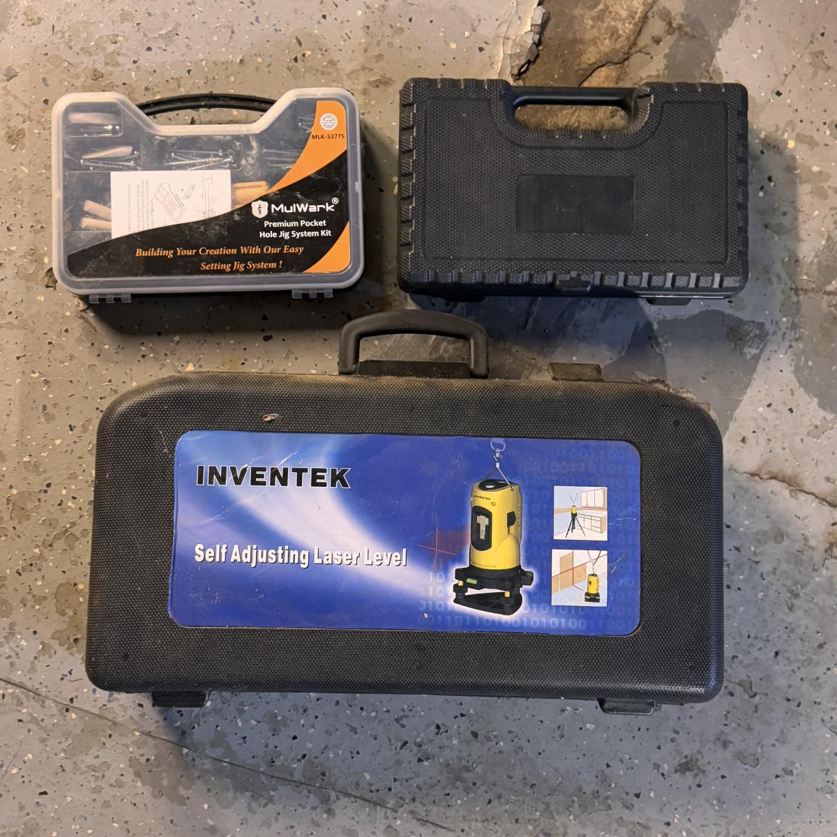 Lot includes one Inventek self-adjusting laser level with accessories in its original case, one MulWark premium pocket hole jig system kit, and one set of JB Industries flare tools. The Inventek self-adjusting laser level powered on - see picture included. It takes two AA batteries to operate. The case of the laser level is the largest item that measures 19” x 9” x 5”H. Shipping available.