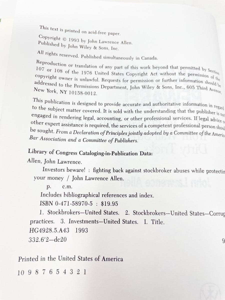 “INVESTOR BEWARE!” BY JOHN LAWRENCE ALLEN HARDBACK BOOK
