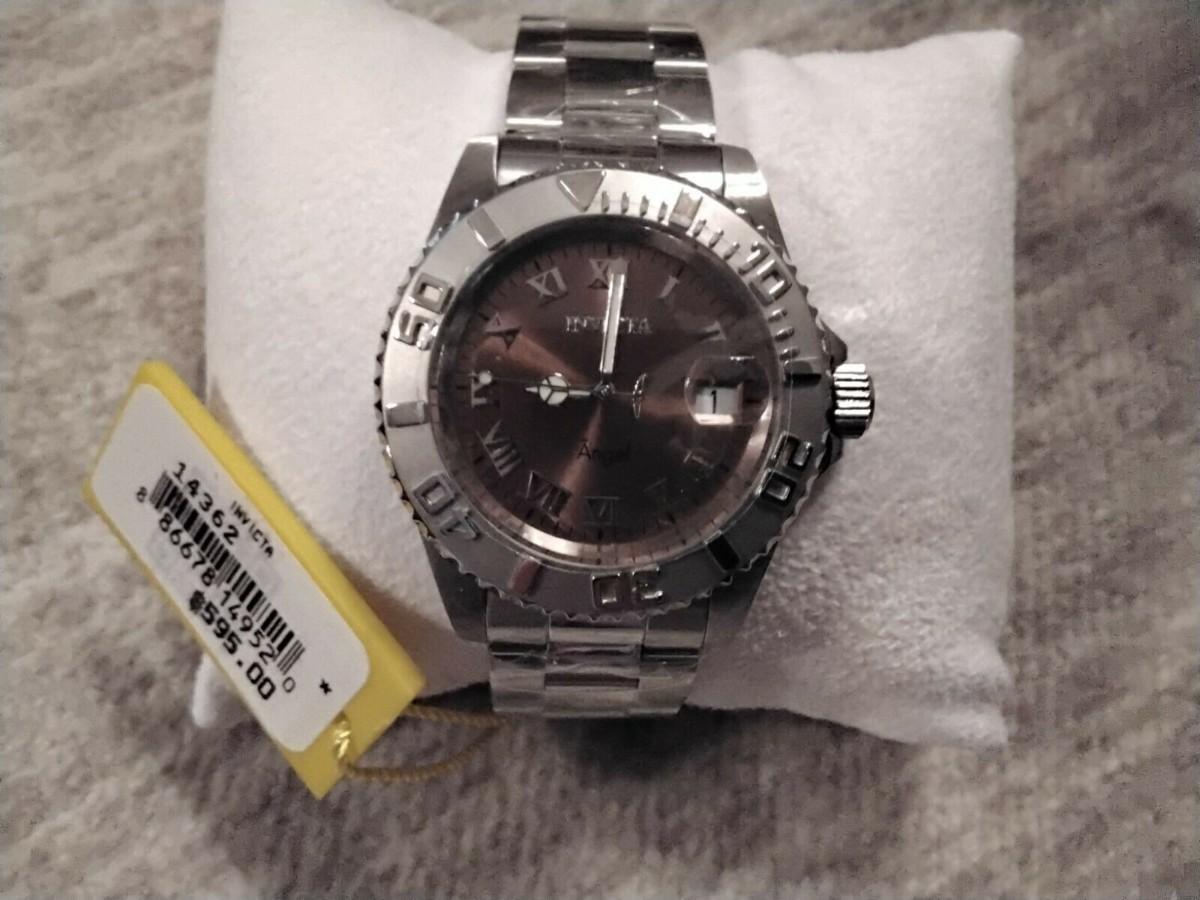 Condition New Gender Female Lifestage All Ages Brand Invicta Invicta Angel 14362 Women's Round Brown Analog Date Roman Numeral Watch Brand, Seller, or Collection Name Invicta Angel Model Number 14362 Part Number 14362 Item Shape Round Dial Window Material Type Mineral Display Type Analog Clasp Fold Over Clasp with Safety Catch Case Material Stainless Steel Case Diameter 40 millimeters Case Thickness 9 millimeters Band Material Stainless Steel Band Length Women's Standard Band Width 20 millimeters Band Color Silver Tone Dial Color Brown with Silver Tone and Black Detail Bezel Material Stainless Steel Bezel Function Unidirectional Special Features Luminous Hour and Minute Hands Luminous Seconds Hand Date Window with Bubble Lens Screwdown Crown Movement Swiss Parts Movement Water Resistance Depth up to 200 Meters