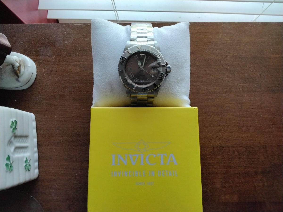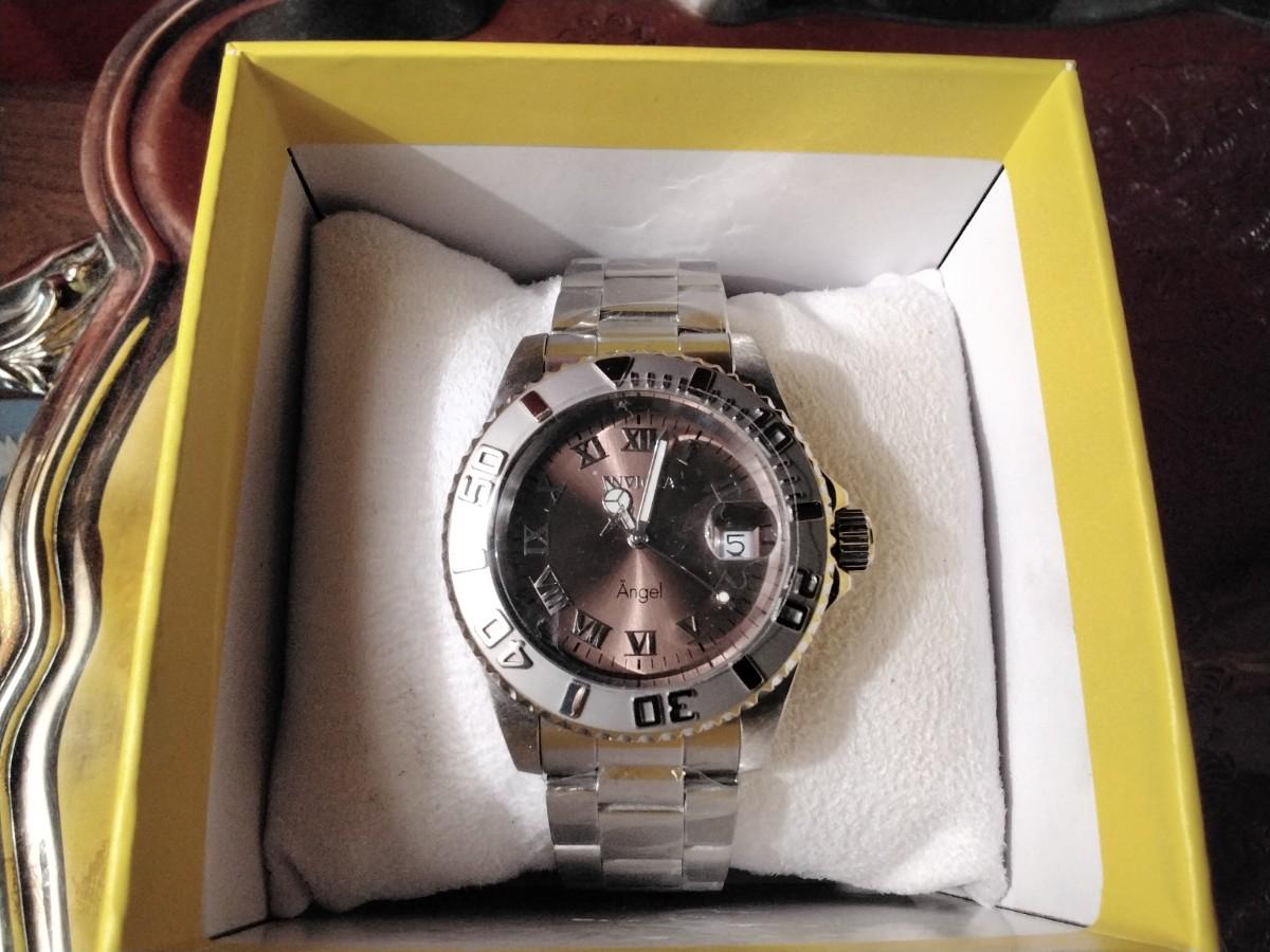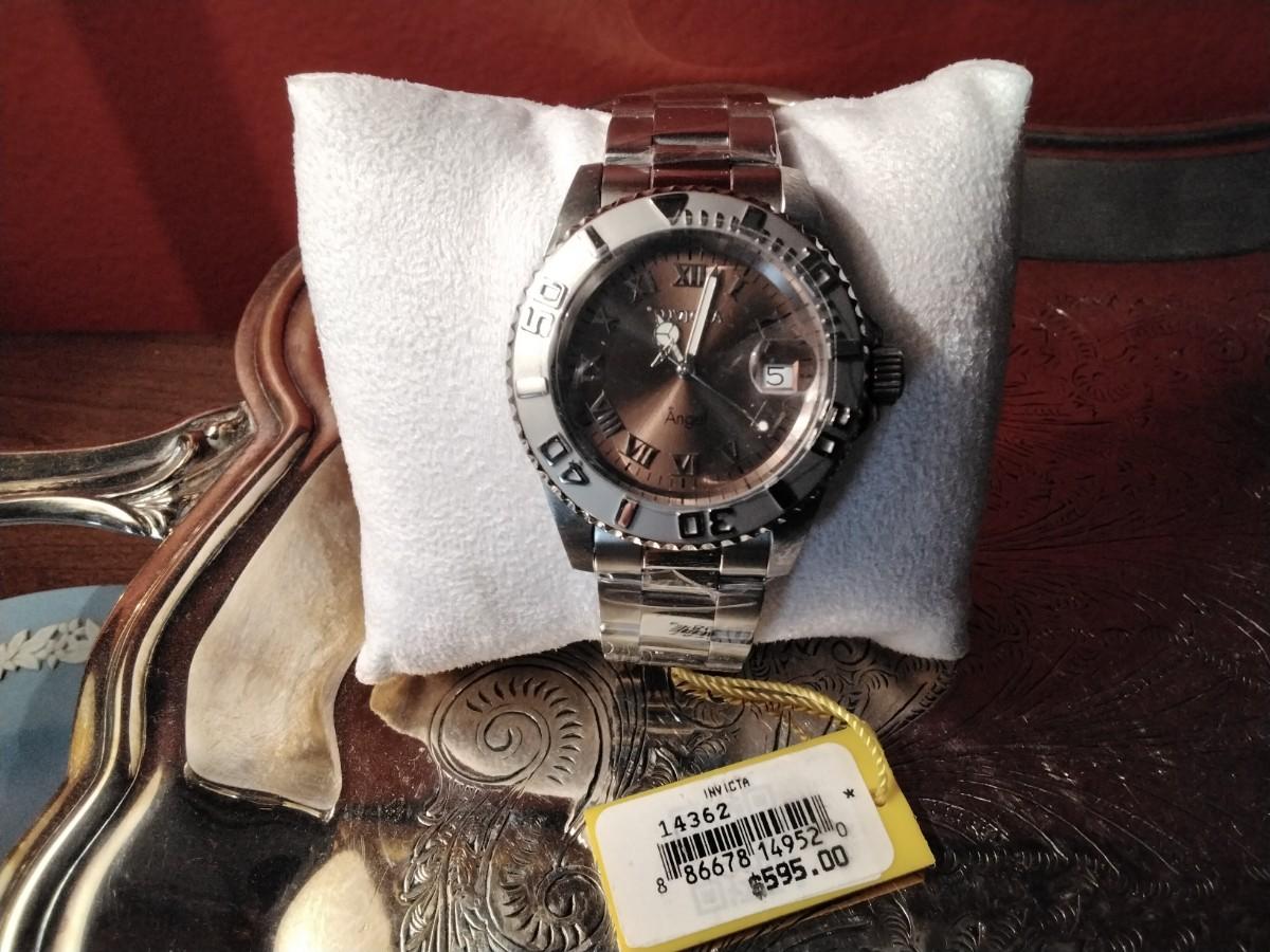 Invicta Invicta Angel 14362 Women's Round Brown Analog Date Roman Numeral Watch Brand, Seller, or Collection Name Invicta Angel Model Number 14362 Part Number 14362 Item Shape Round Dial Window Material Type Mineral Display Type Analog Clasp Fold Over Clasp with Safety Catch Case Material Stainless Steel Case Diameter 40 millimeters Case Thickness 9 millimeters Band Material Stainless Steel Band Length Women's Standard Band Width 20 millimeters Band Color Silver Tone Dial Color Brown with Silver Tone and Black Detail Bezel Material Stainless Steel Bezel Function Unidirectional Special Features Luminous Hour and Minute Hands Luminous Seconds Hand Date Window with Bubble Lens Screwdown Crown Movement Swiss Parts Movement Water Resistance Depth up to 200 Meters