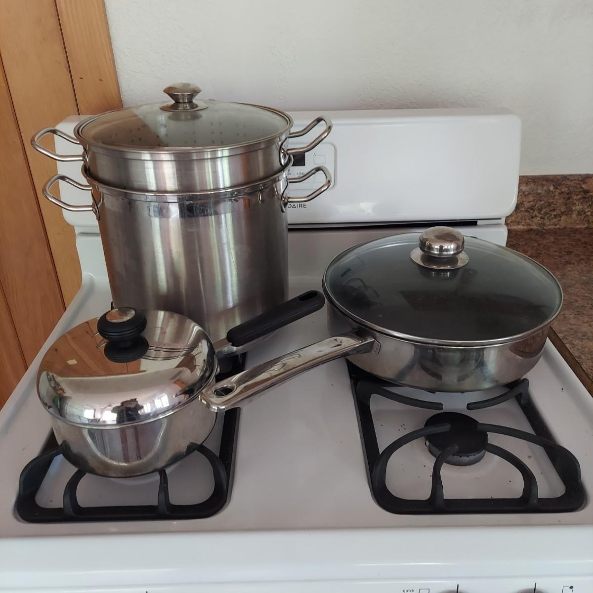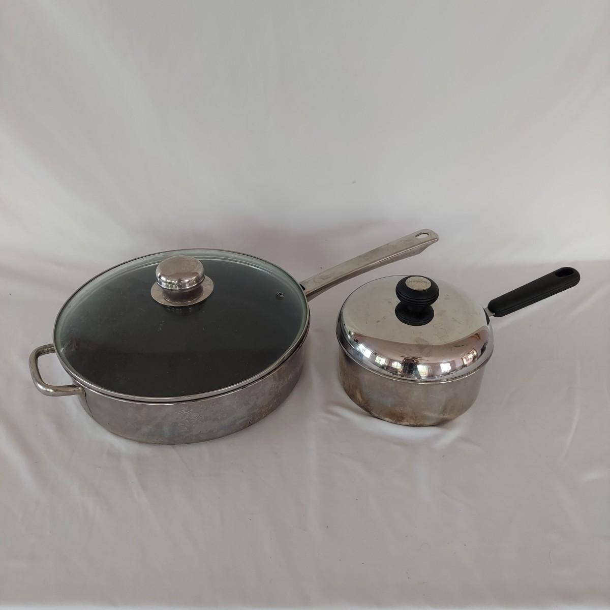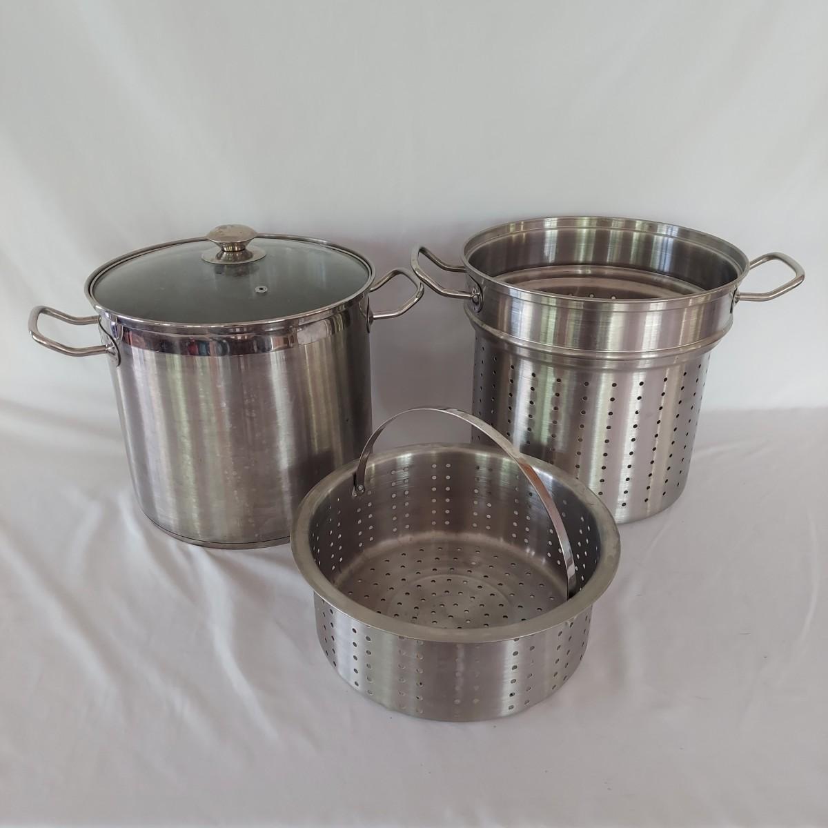 Invitations brand stainless steel stock pot with lid, pasta insert and steamer is 12" tall with 11" diameter. Also included are a Morgan Ware 12" stainless steel pan with nonstick coating and lid. Plus a Circulon stainless steel 7" pot. Items show some wear; please see photos. Local pickup only.