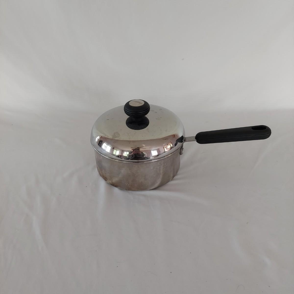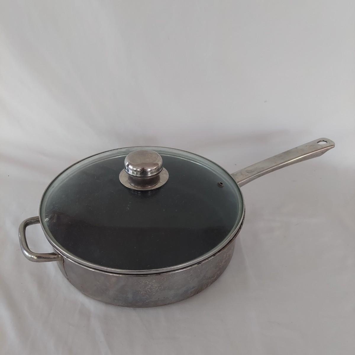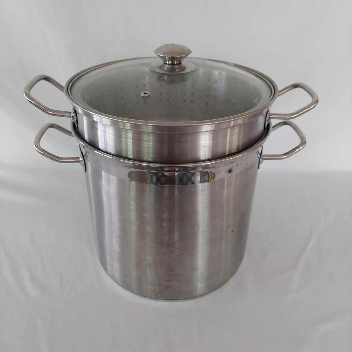 Invitations brand stainless steel stock pot with lid, pasta insert and steamer is 12" tall with 11" diameter. Also included are a Morgan Ware 12" stainless steel pan with nonstick coating and lid. Plus a Circulon stainless steel 7" pot. Items show some wear; please see photos. Local pickup only.