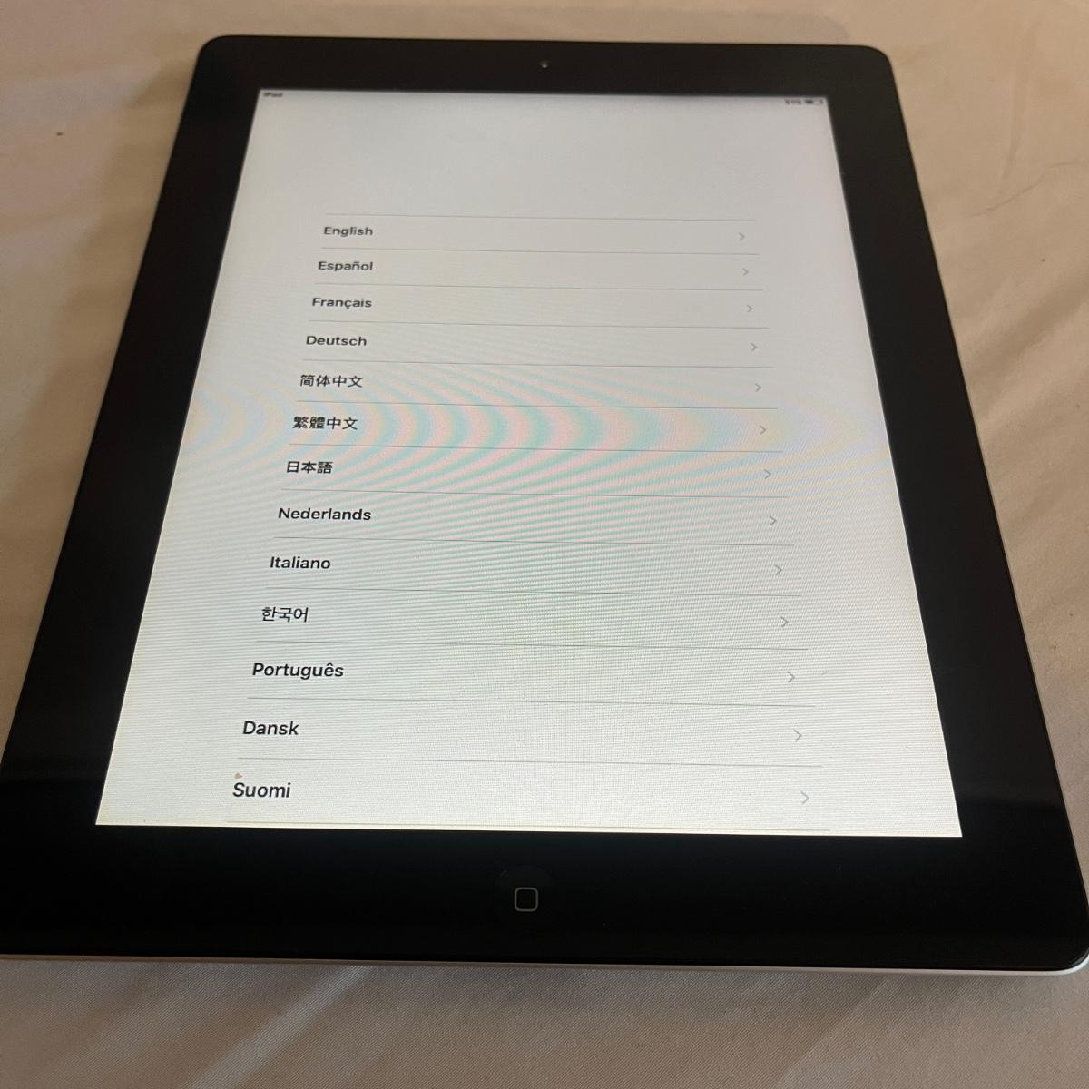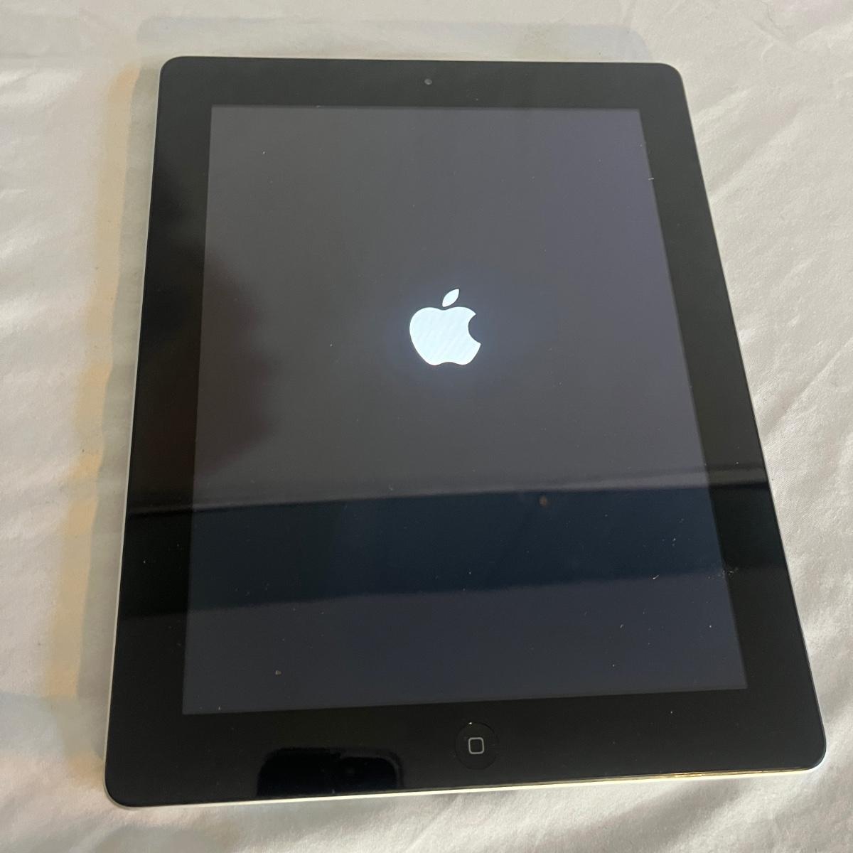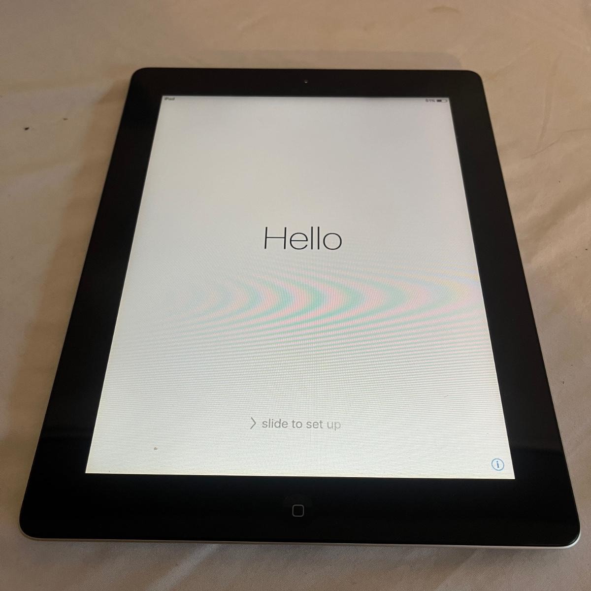 This iPad powered on when plugged in and has been reset. Also includes 30 pin charging cable.