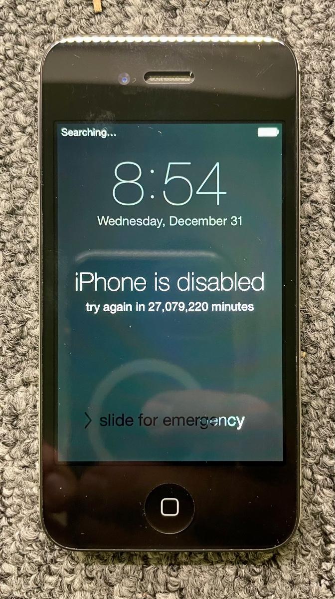 In original box, includes charging cord, soft rubberized phone case, and users guide. Good physical condition, phone charges up but screen is locked. Password is unknown.