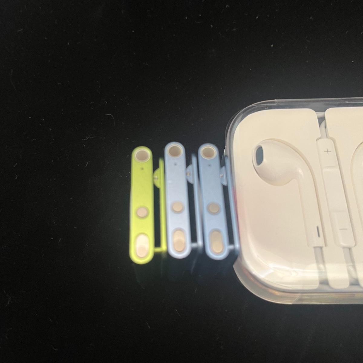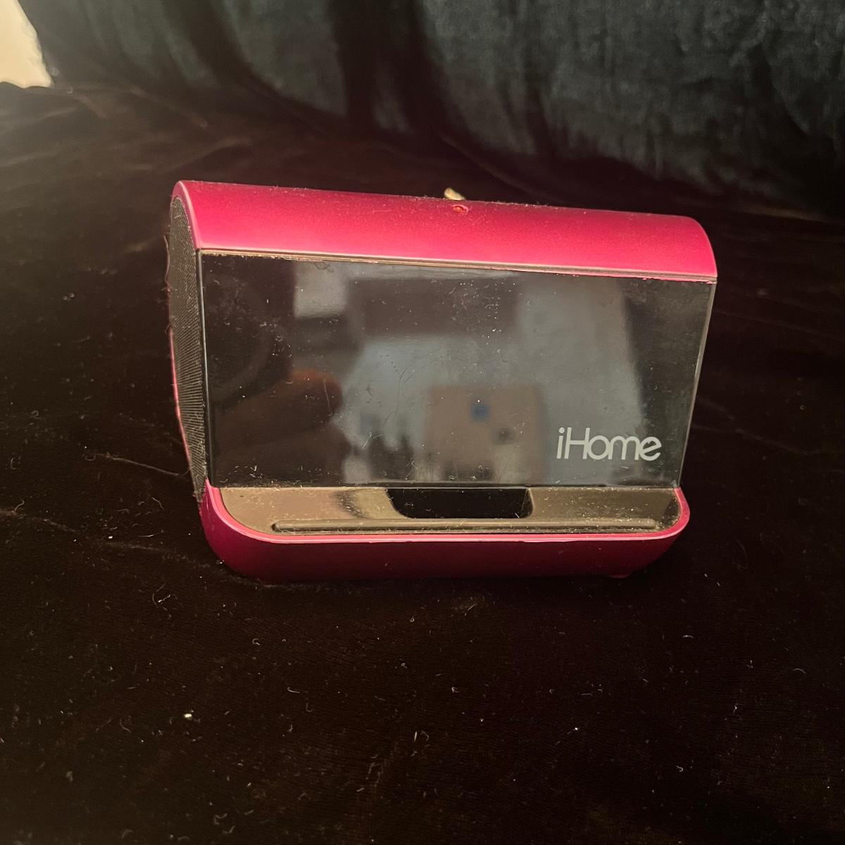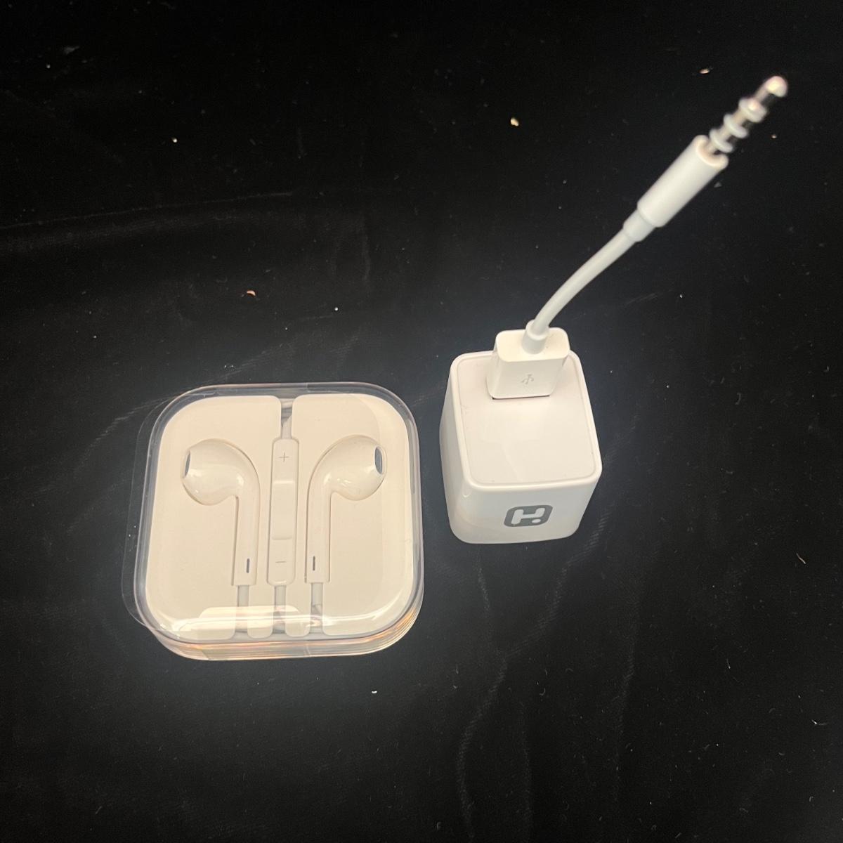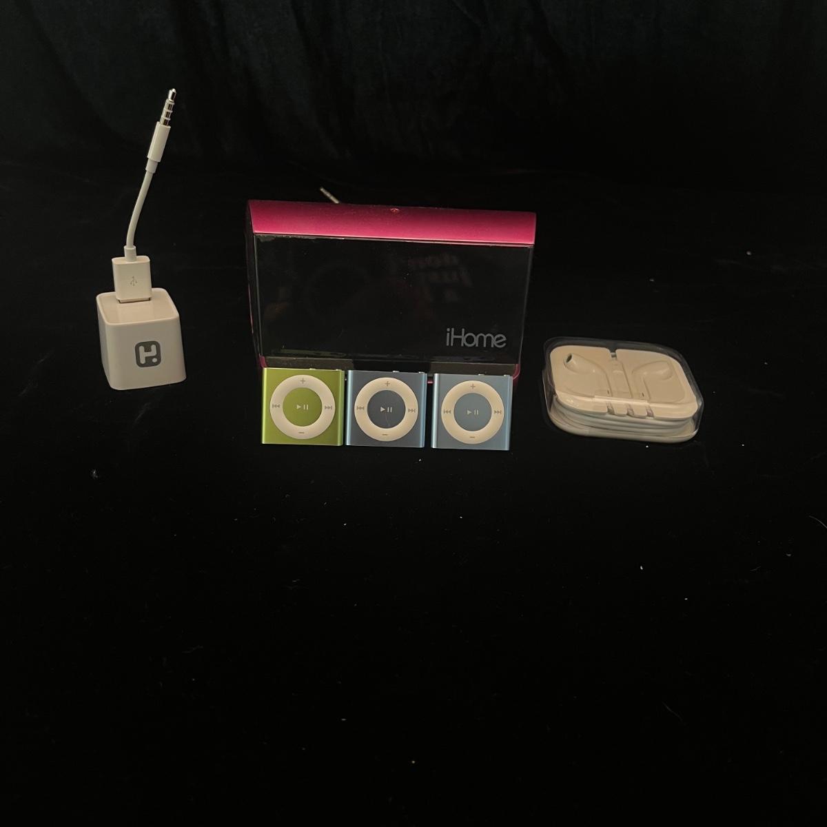 Lot includes an iHome speaker, Apple Headphones, three iPod Shuffles and charger. Speaker and iPods powered on.