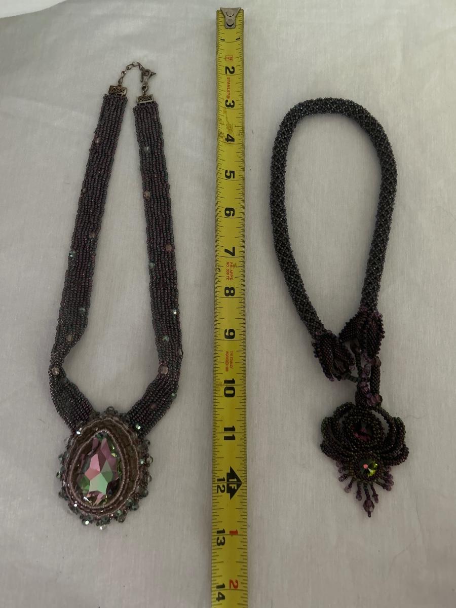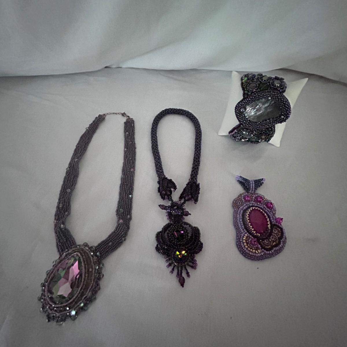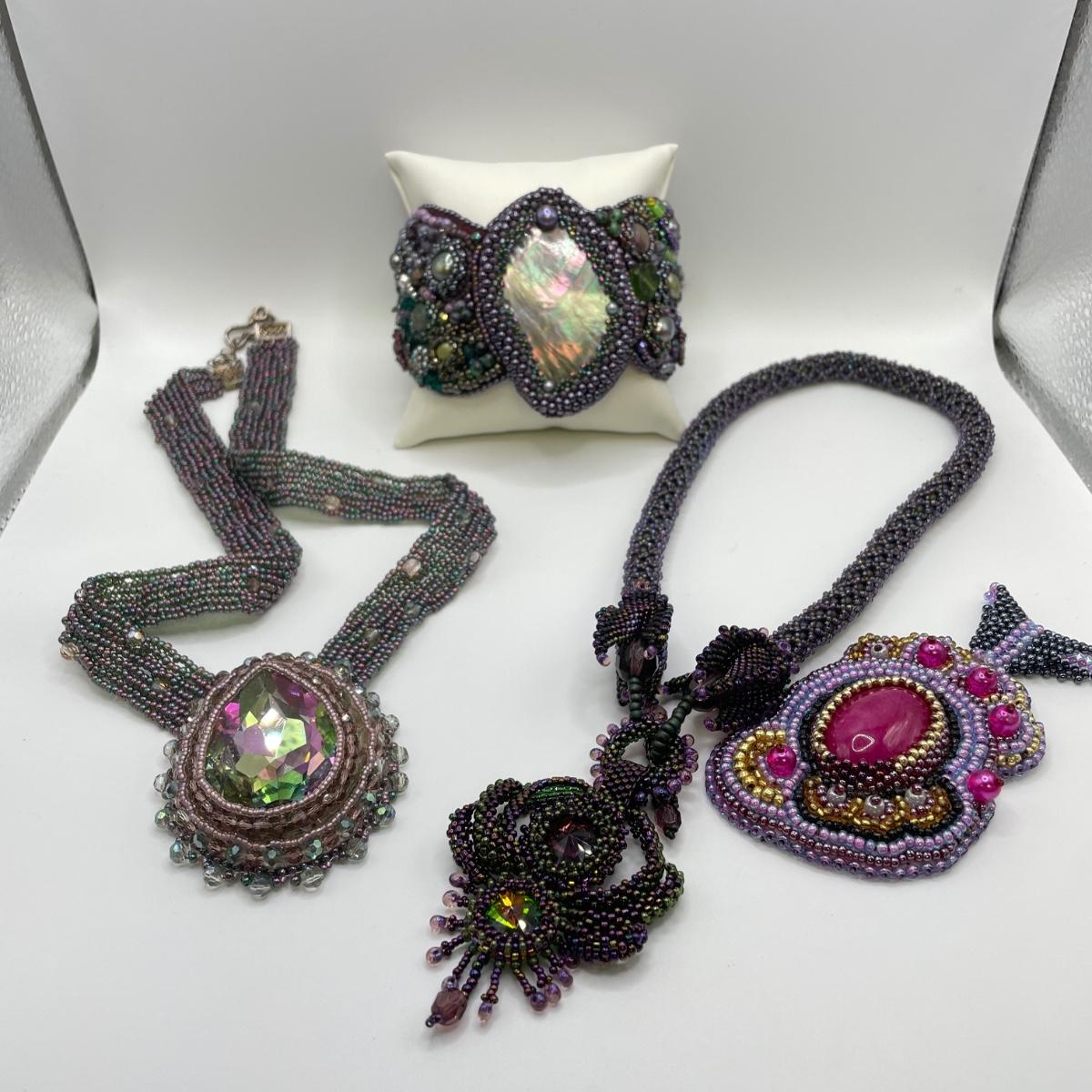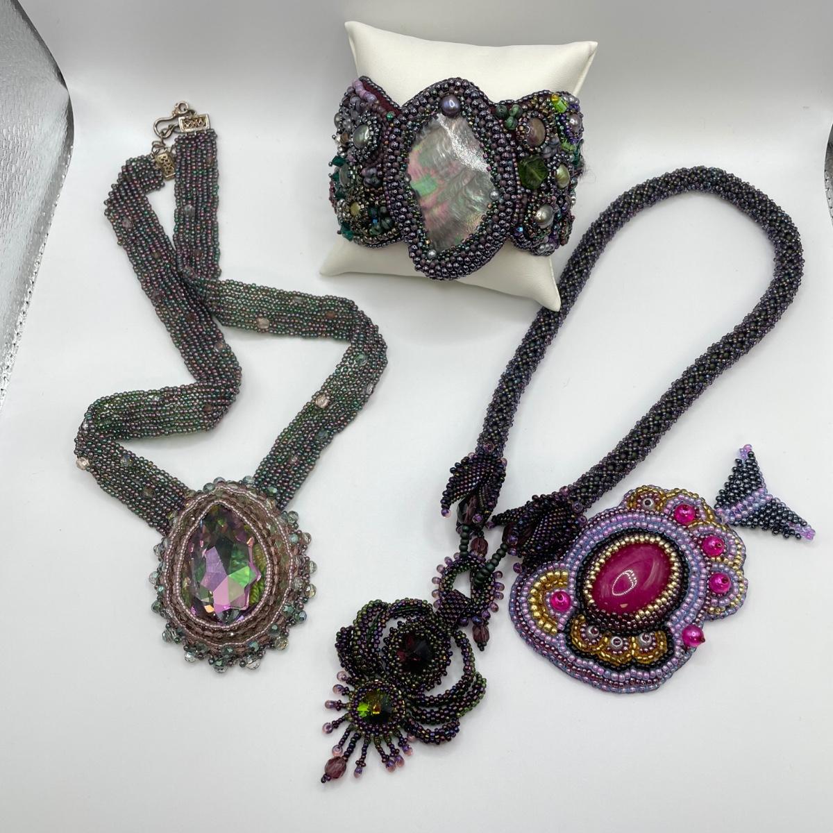 Lot includes two necklaces, a bracelet and a pendant, all in a similar style and made of a purple iridescent beads with ornate beading. The backs of most pieces are leather or felting. No makers marks found. Shipping available. All sales are final. No returns or refunds. Please bid accordingly.