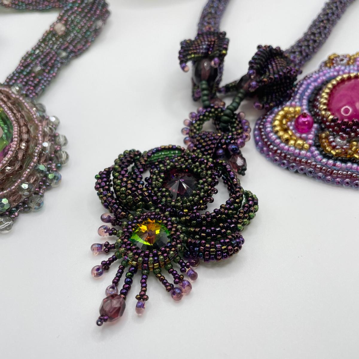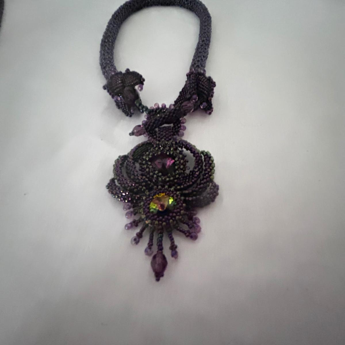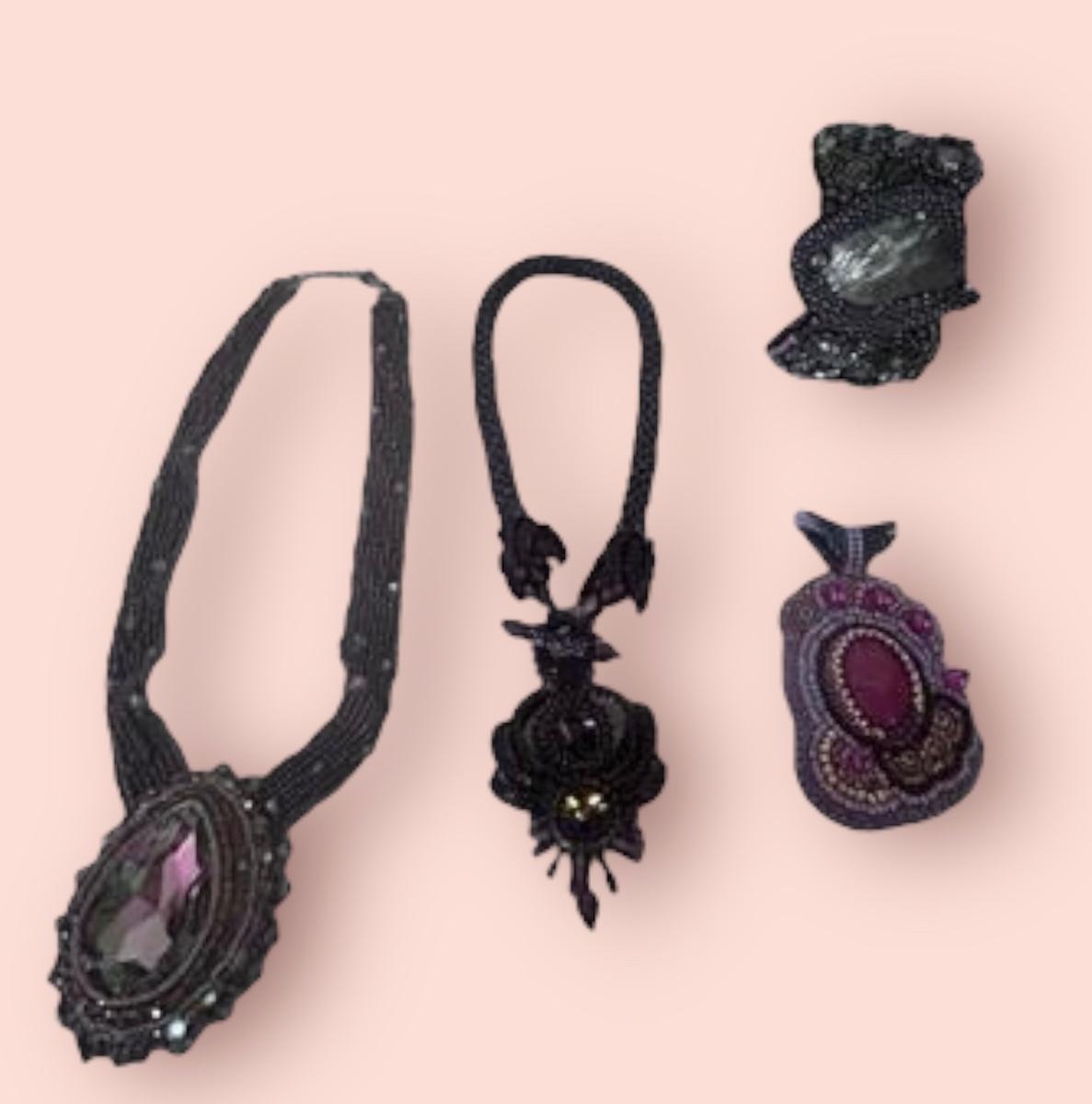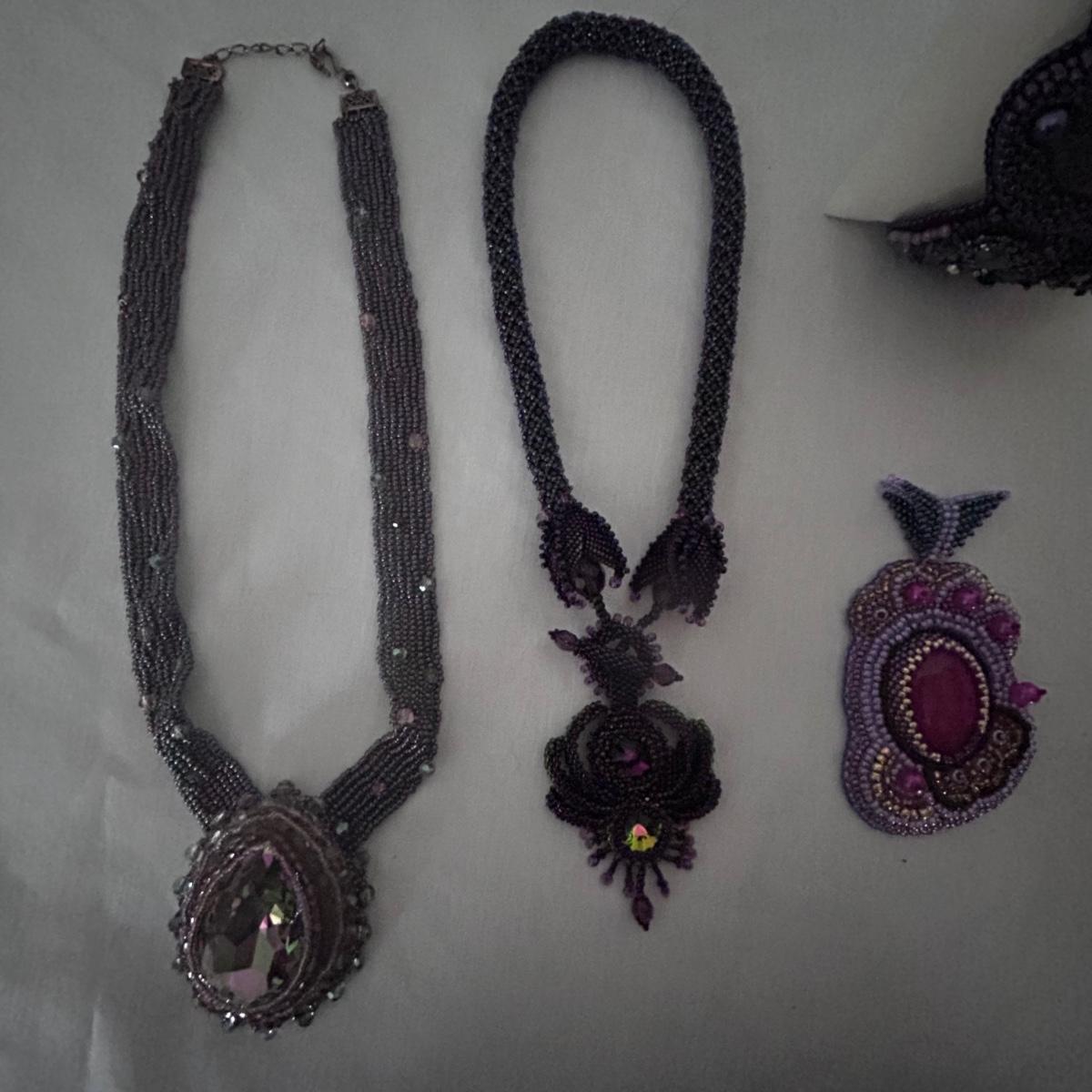 Lot includes two necklaces, a bracelet and a pendant, all in a similar style and made of a purple iridescent beads with ornate beading. The backs of most pieces are leather or felting. No makers marks found. Shipping available. All sales are final. No returns or refunds. Please bid accordingly.