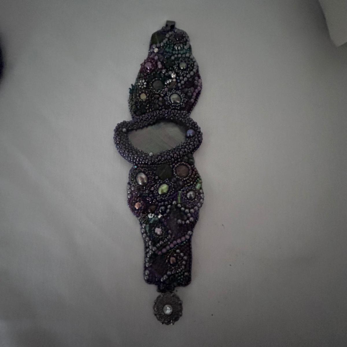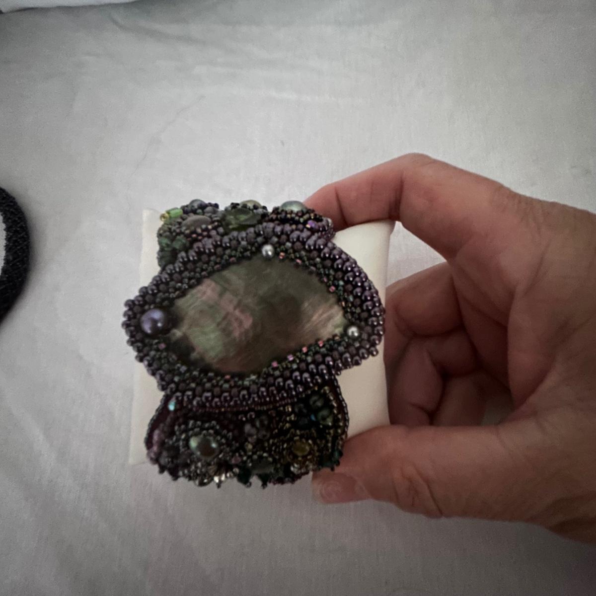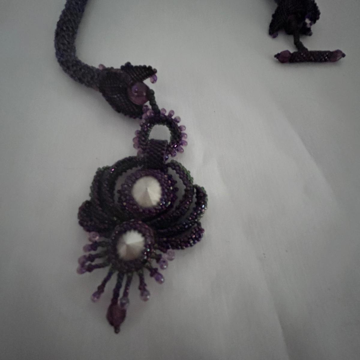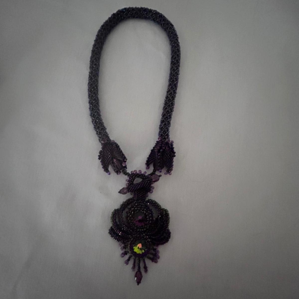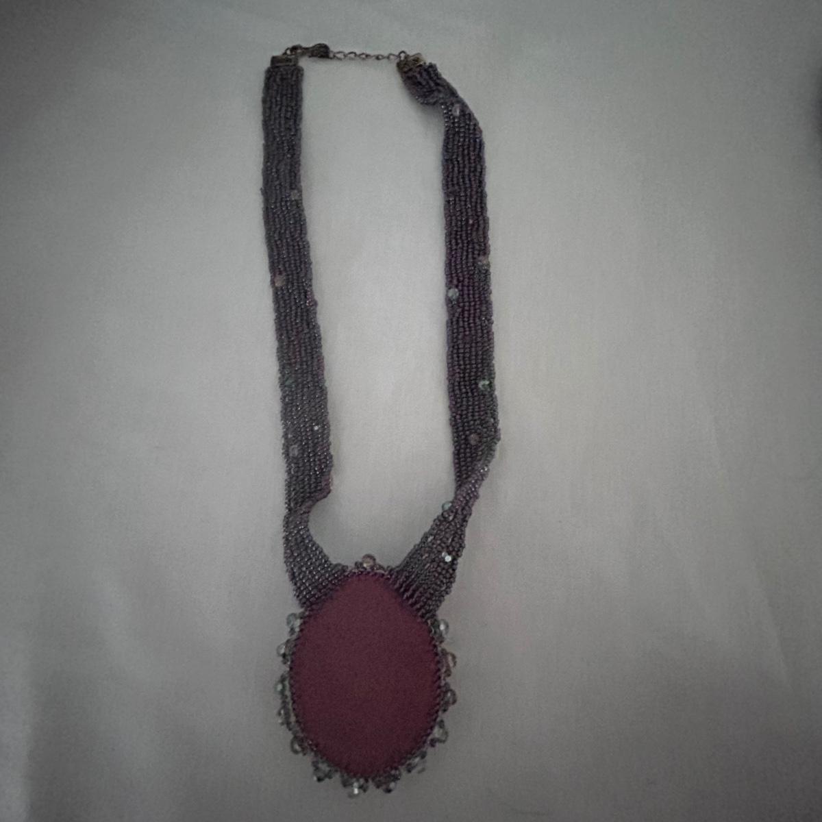 Lot includes two necklaces, a bracelet and a pendant, all in a similar style and made of a purple iridescent beads with ornate beading. The backs of most pieces are leather or felting. No makers marks found. Shipping available. All sales are final. No returns or refunds. Please bid accordingly.