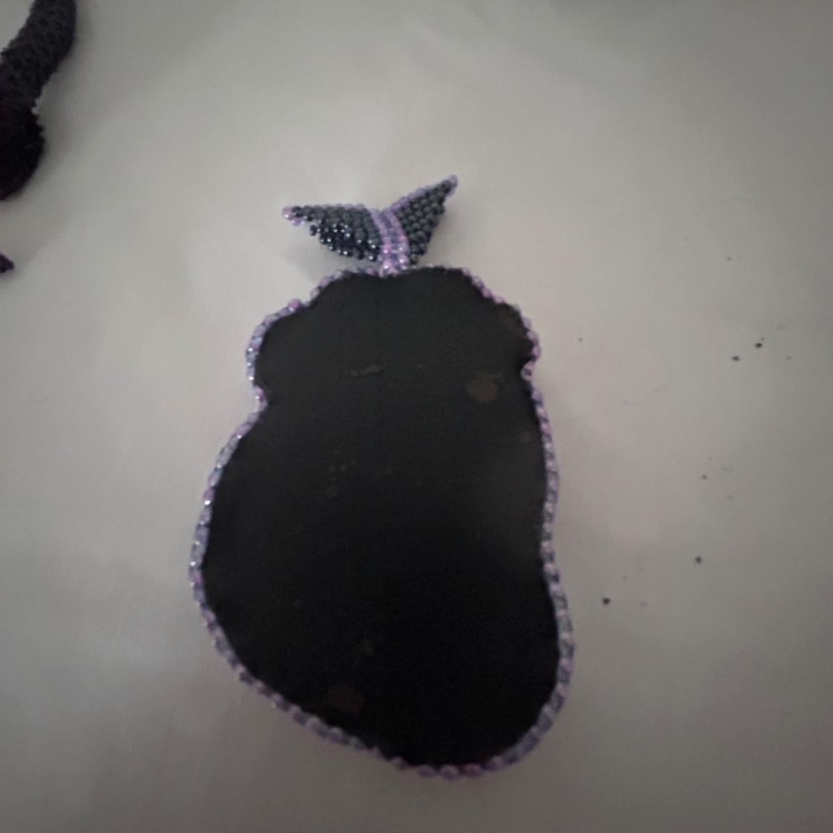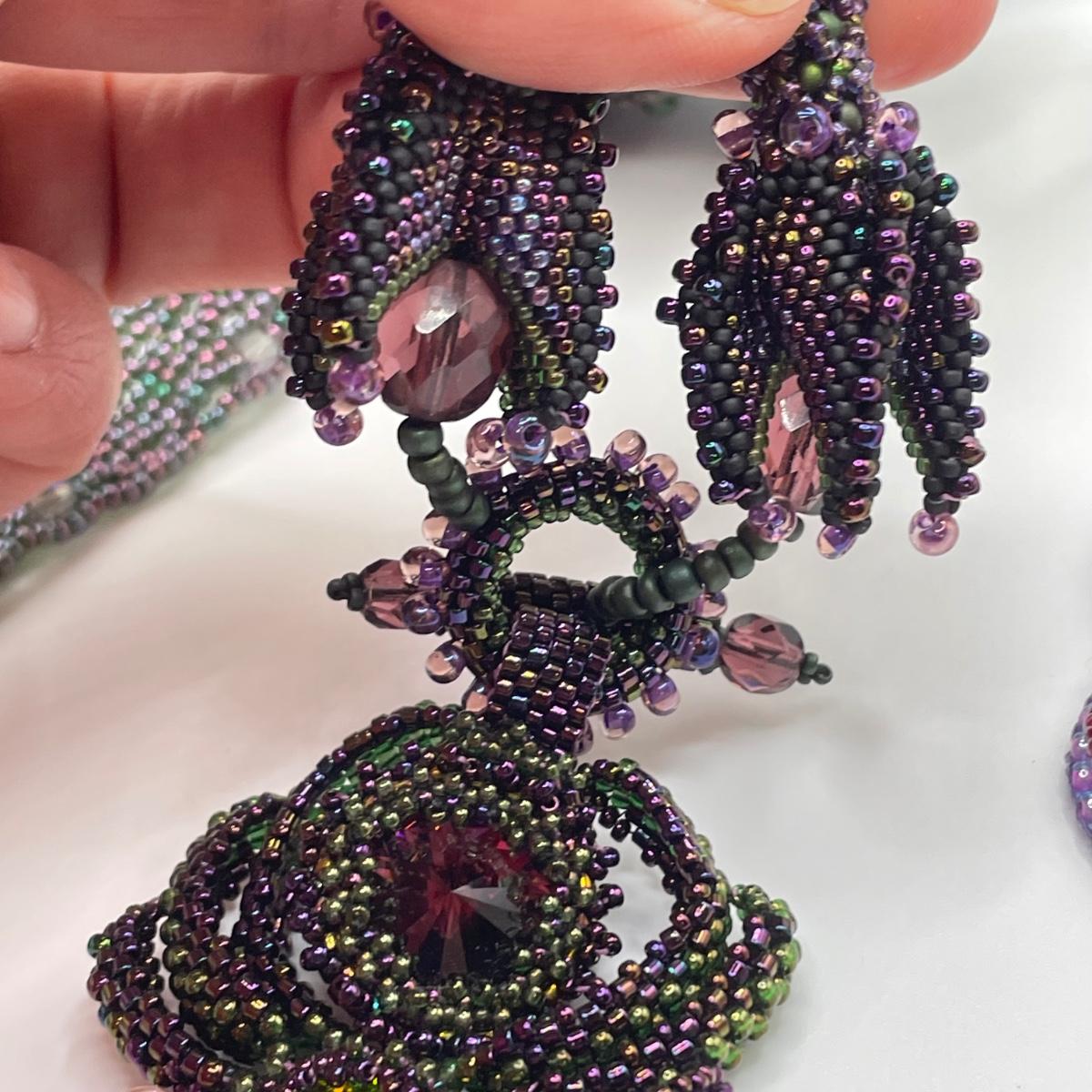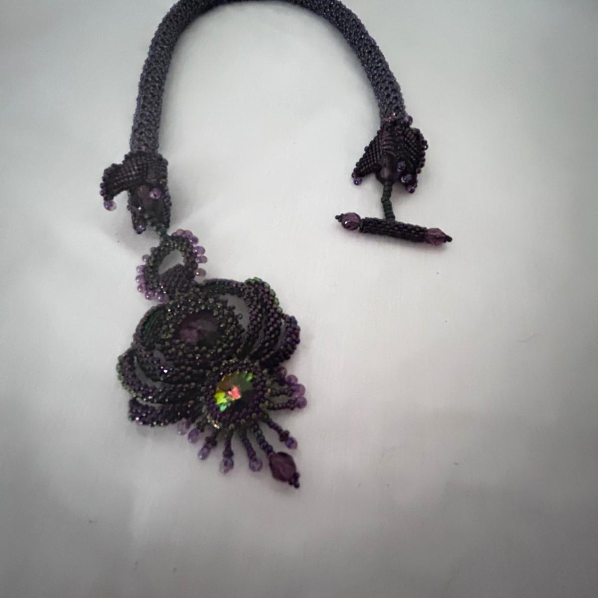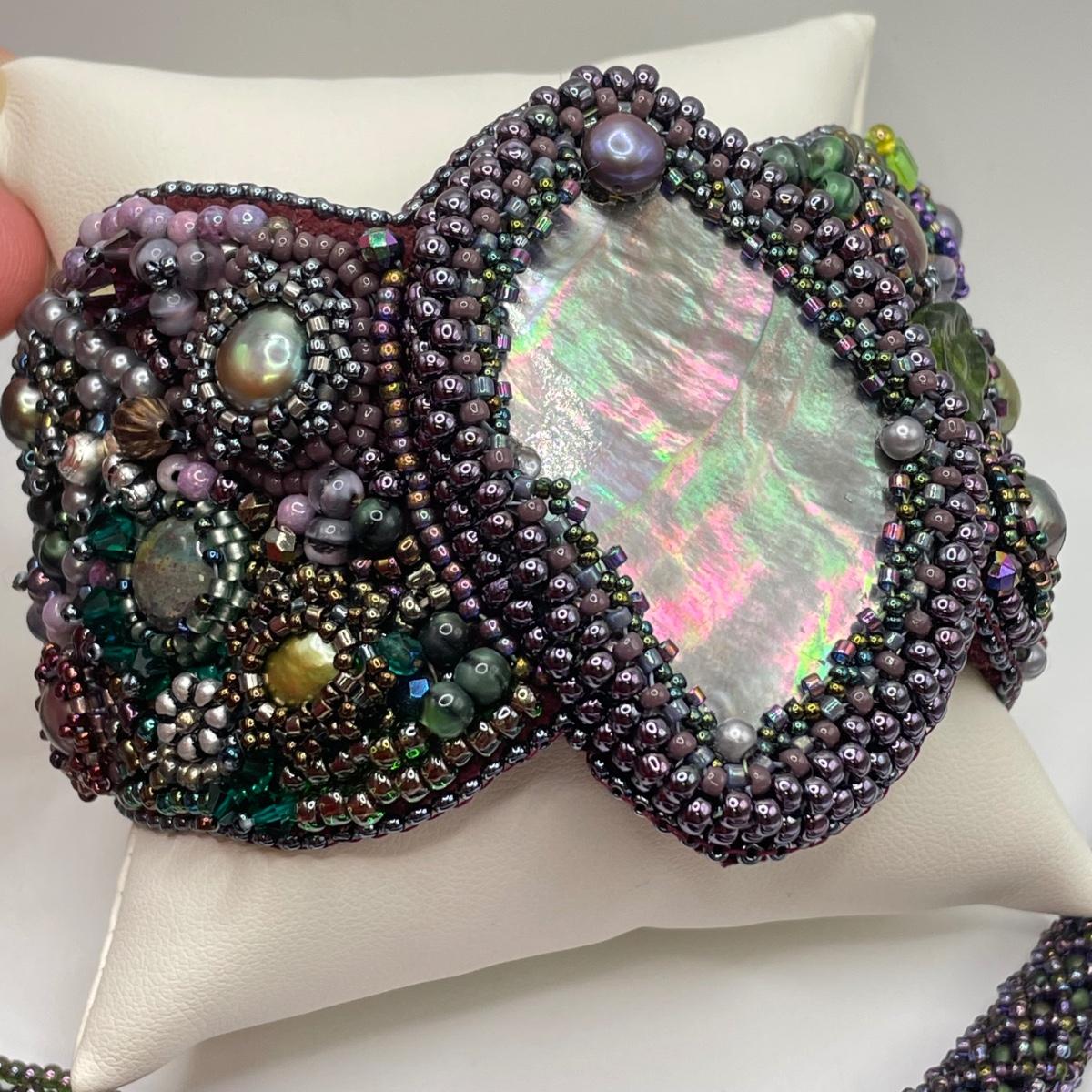 Lot includes two necklaces, a bracelet and a pendant, all in a similar style and made of a purple iridescent beads with ornate beading. The backs of most pieces are leather or felting. No makers marks found. Shipping available. All sales are final. No returns or refunds. Please bid accordingly.