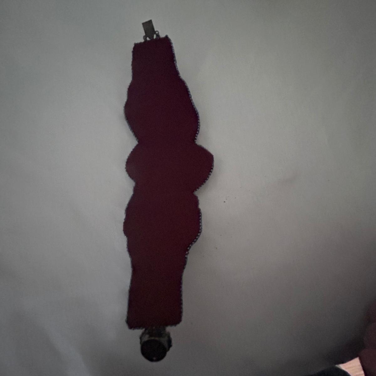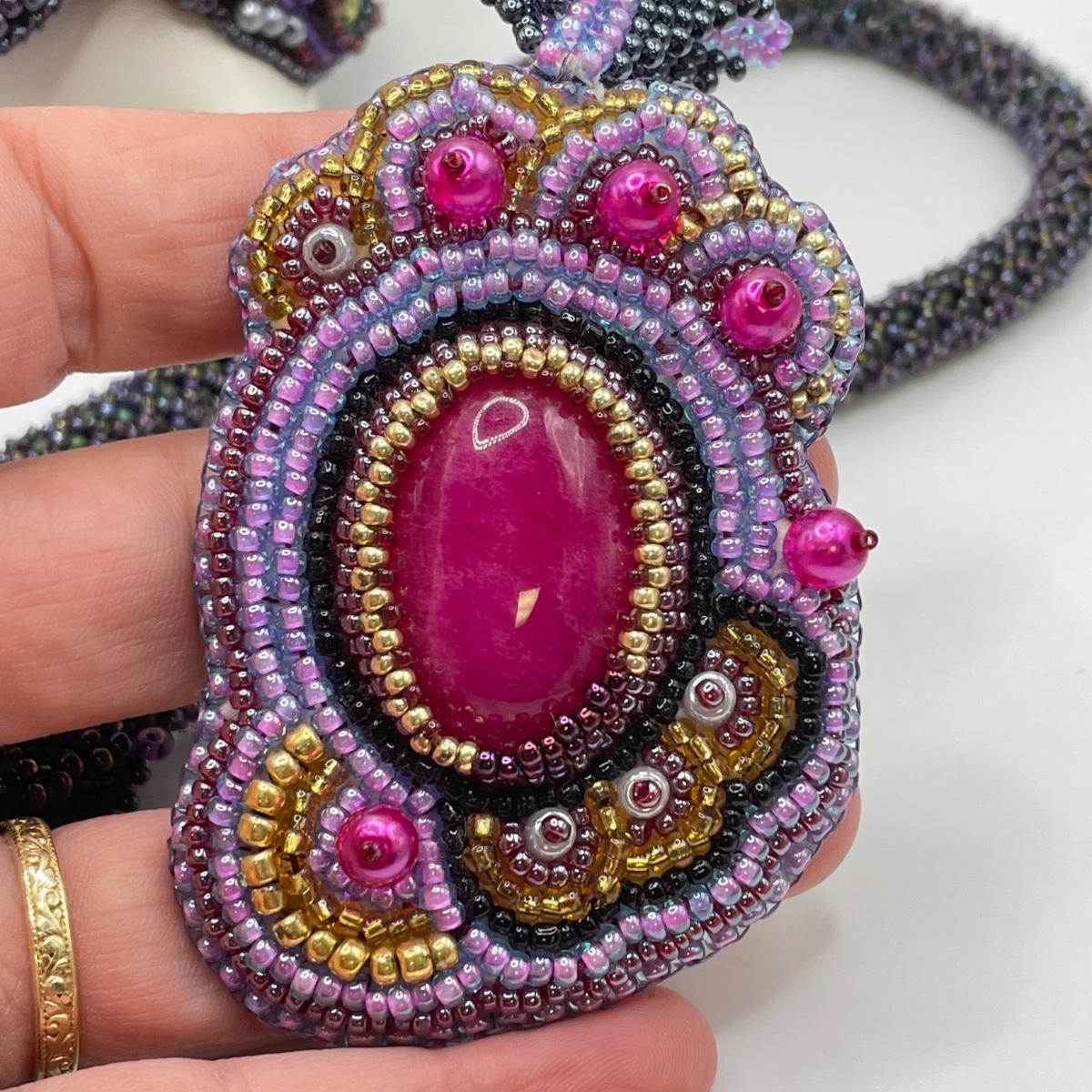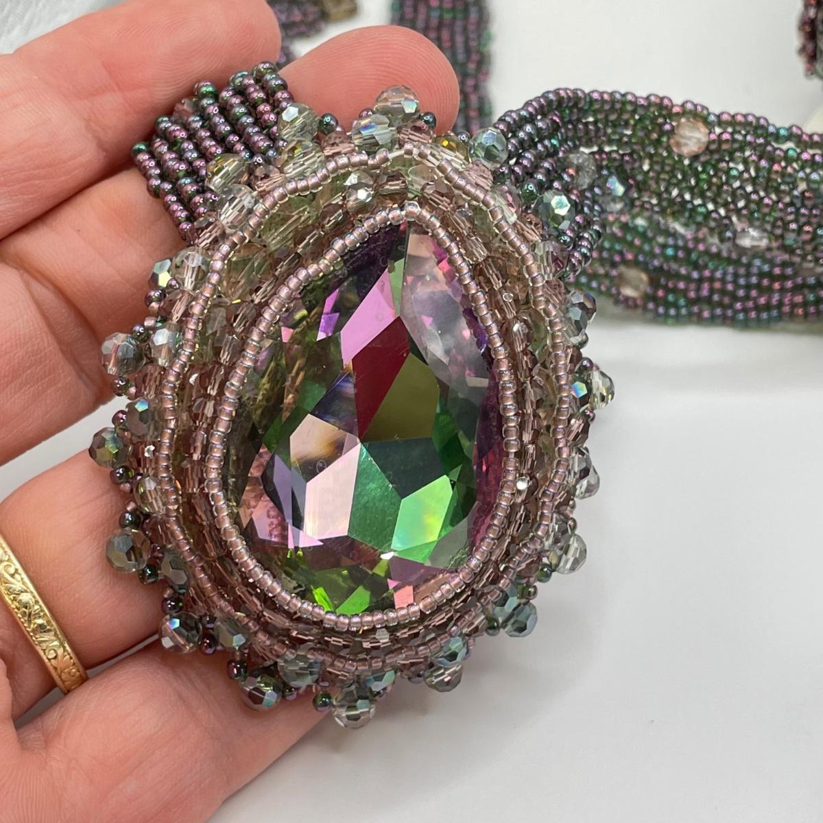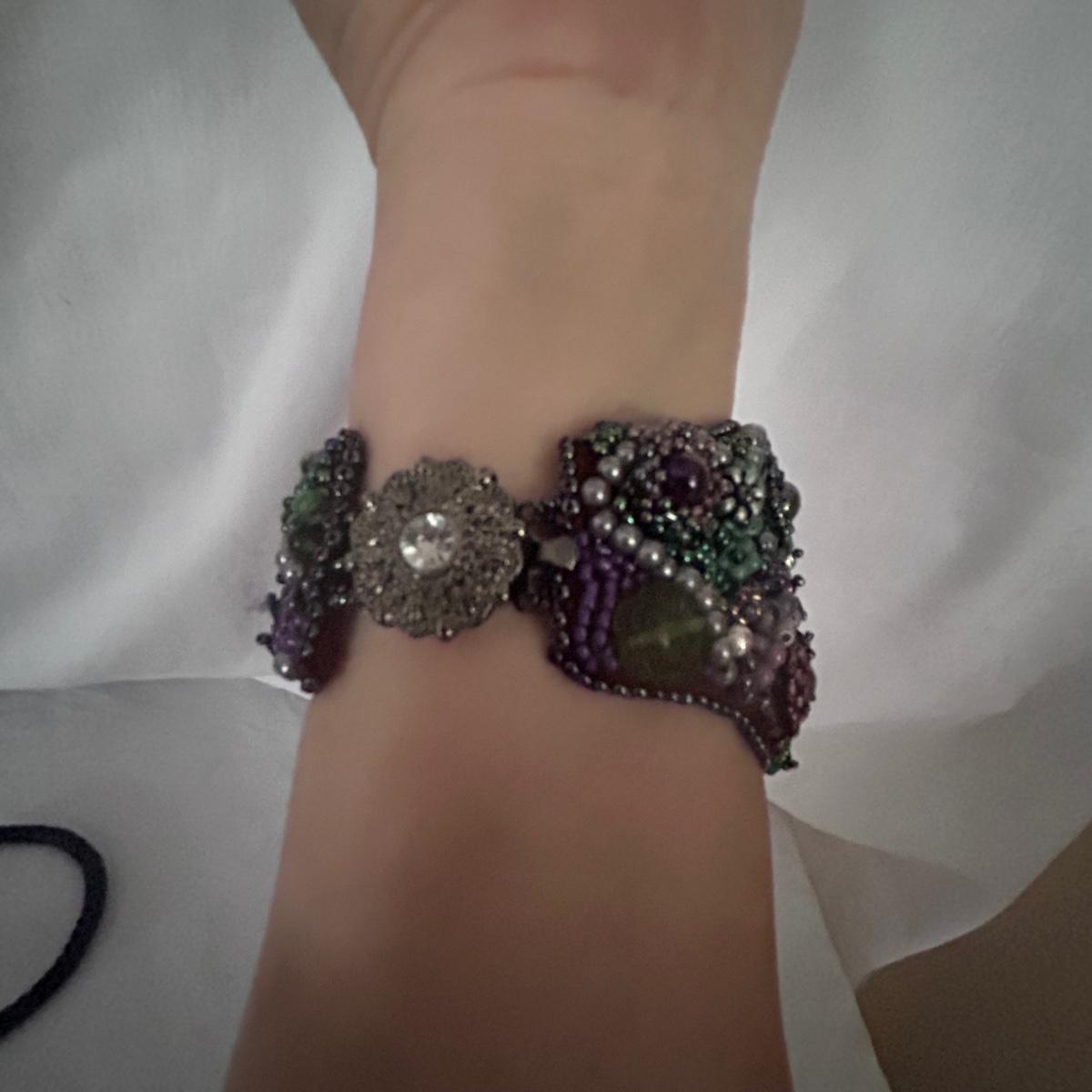 Lot includes two necklaces, a bracelet and a pendant, all in a similar style and made of a purple iridescent beads with ornate beading. The backs of most pieces are leather or felting. No makers marks found. Shipping available. All sales are final. No returns or refunds. Please bid accordingly.