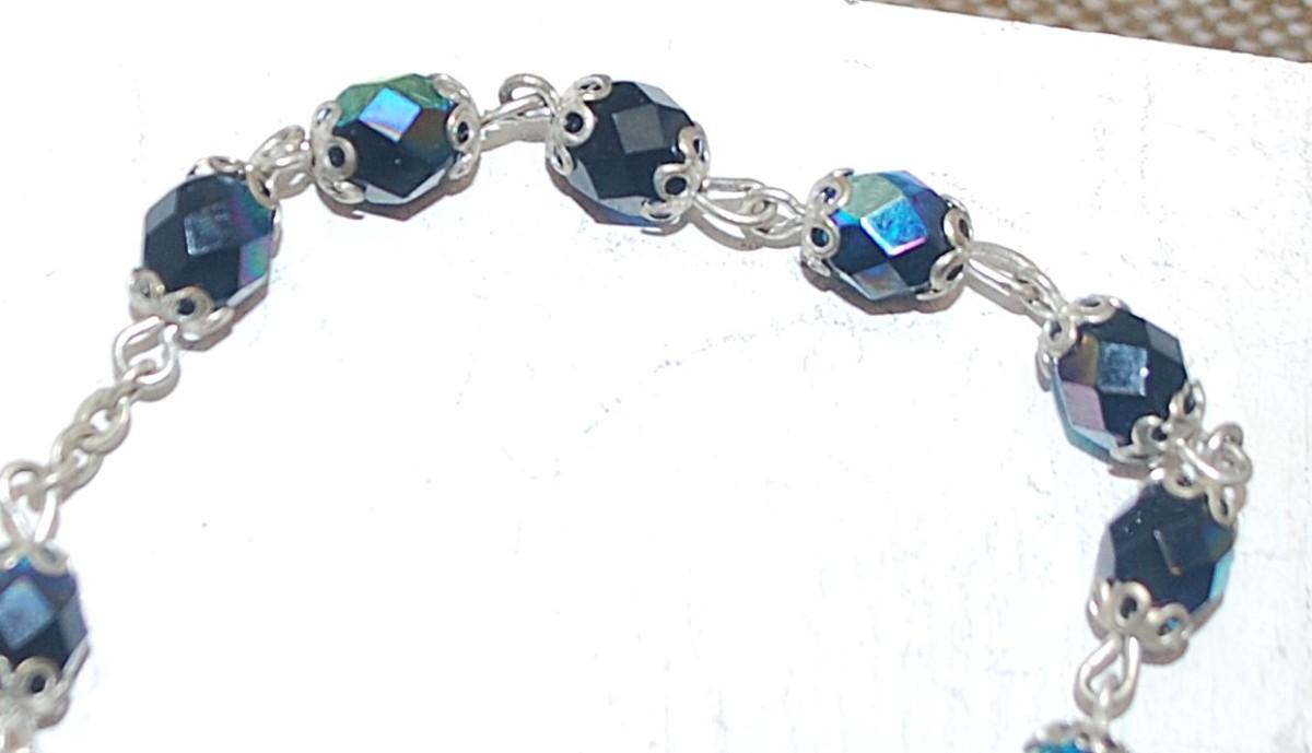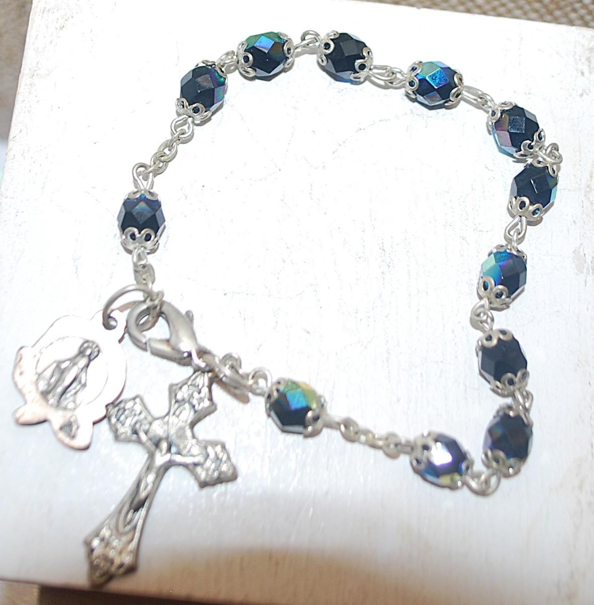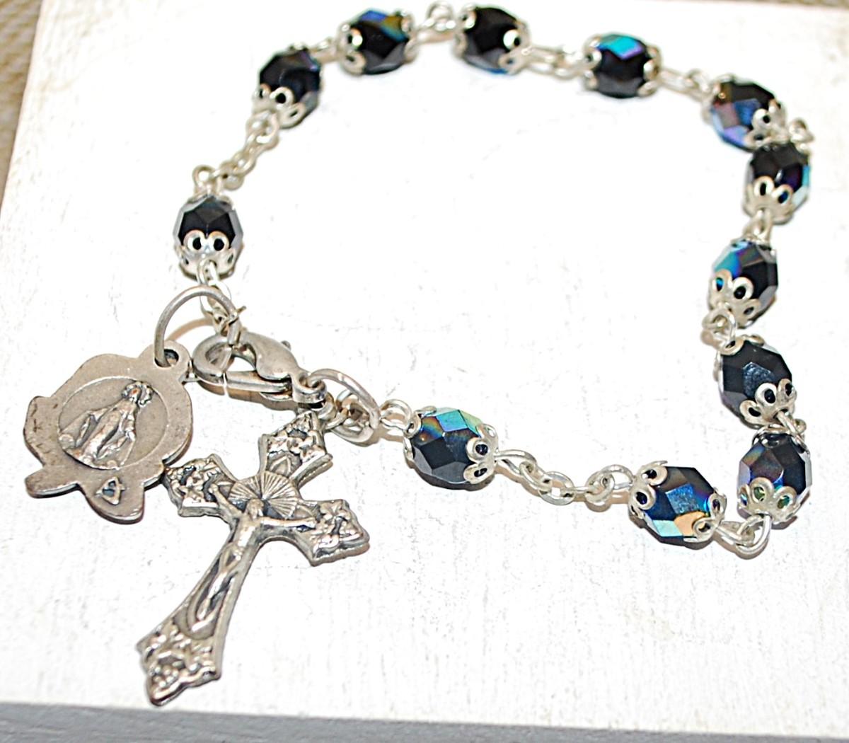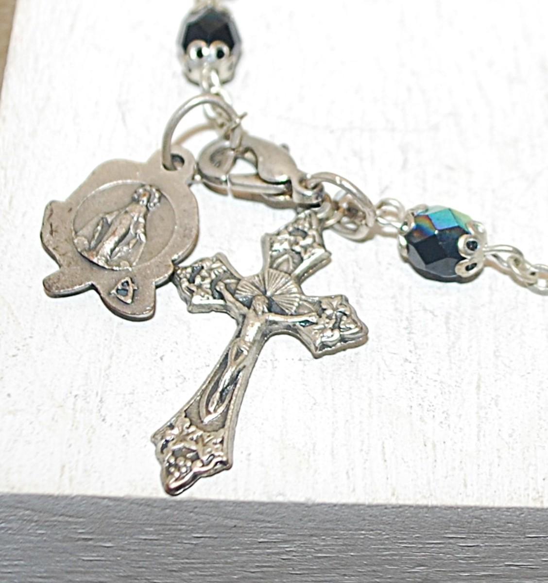 Iridescent Blue & Green Stones BRACELET (6" End-to-End) with Marked Italian CROSS & Rose Medal and a Lobster Style Clasp
