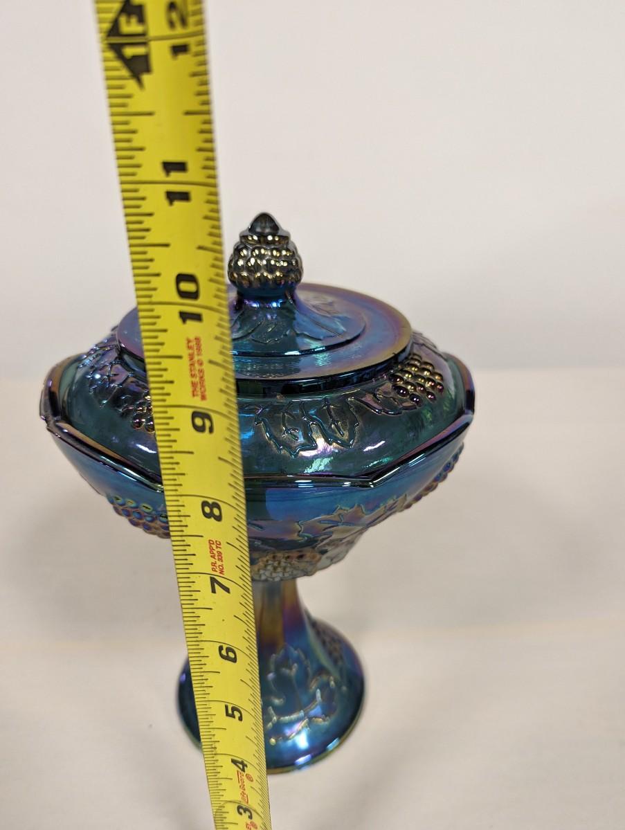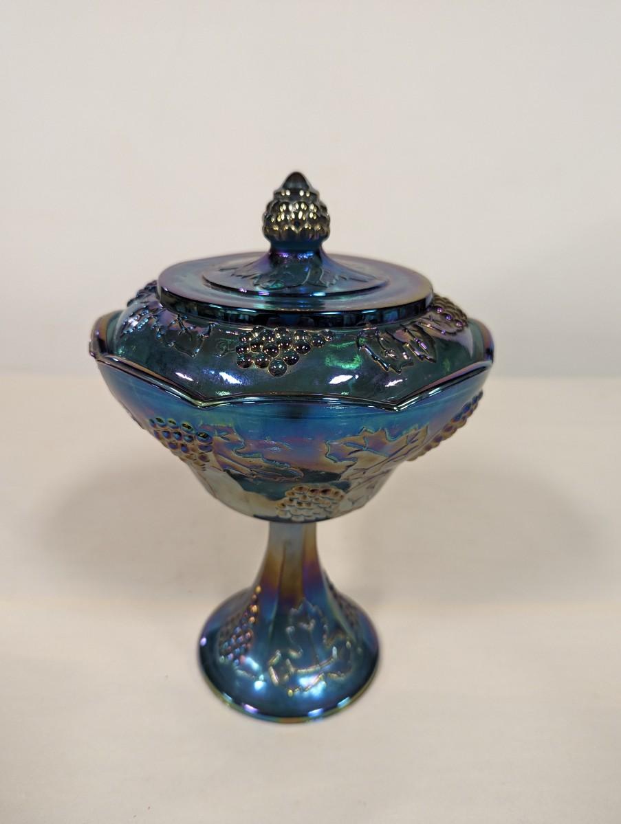 Iridescent Blue "Harvest Grape" Carnival Glass Candy Dish