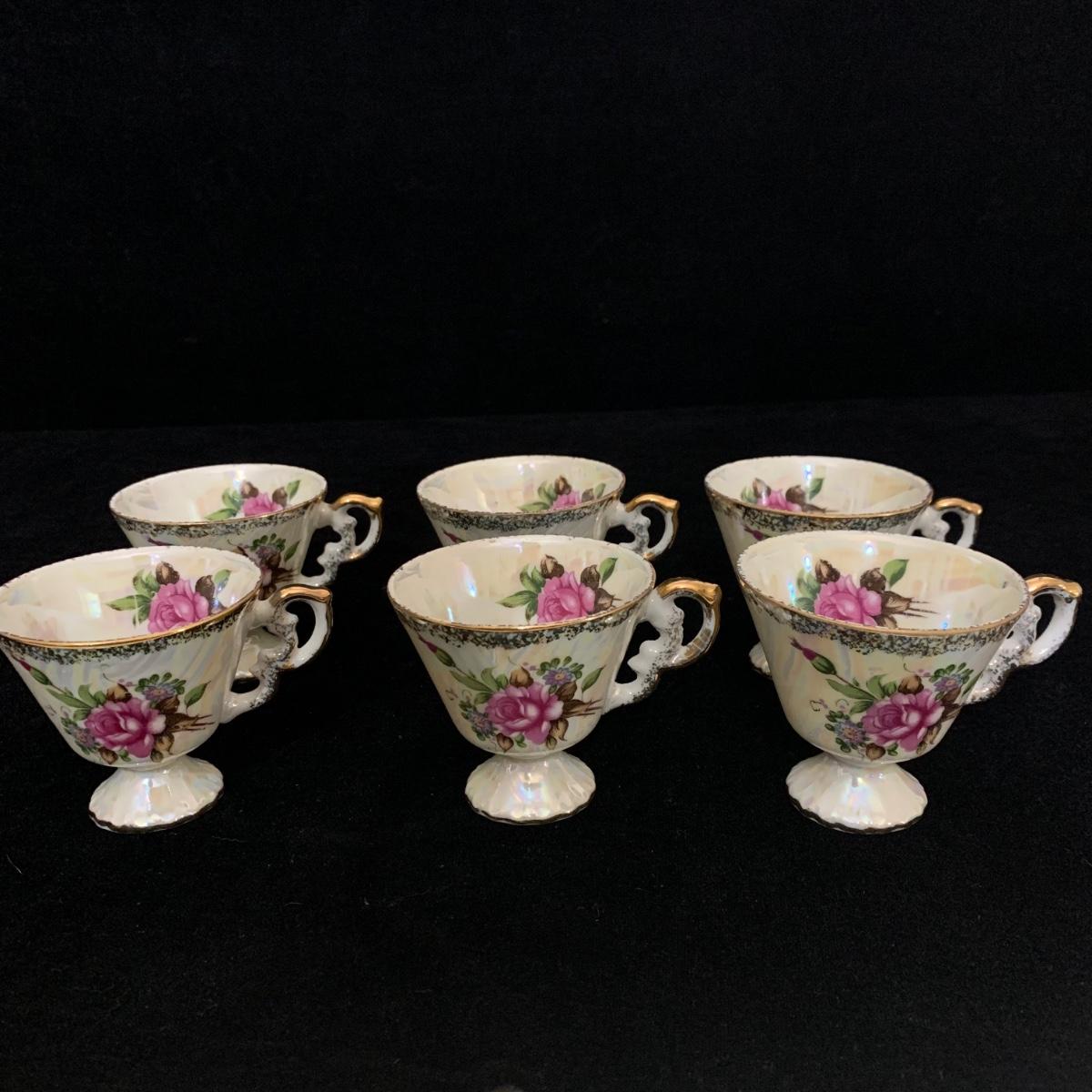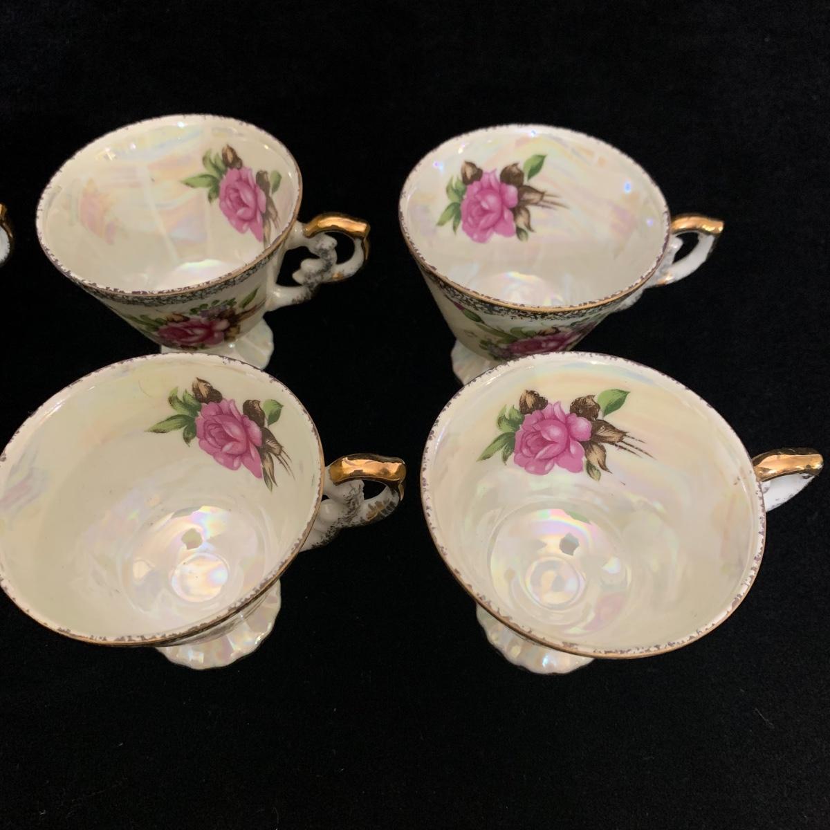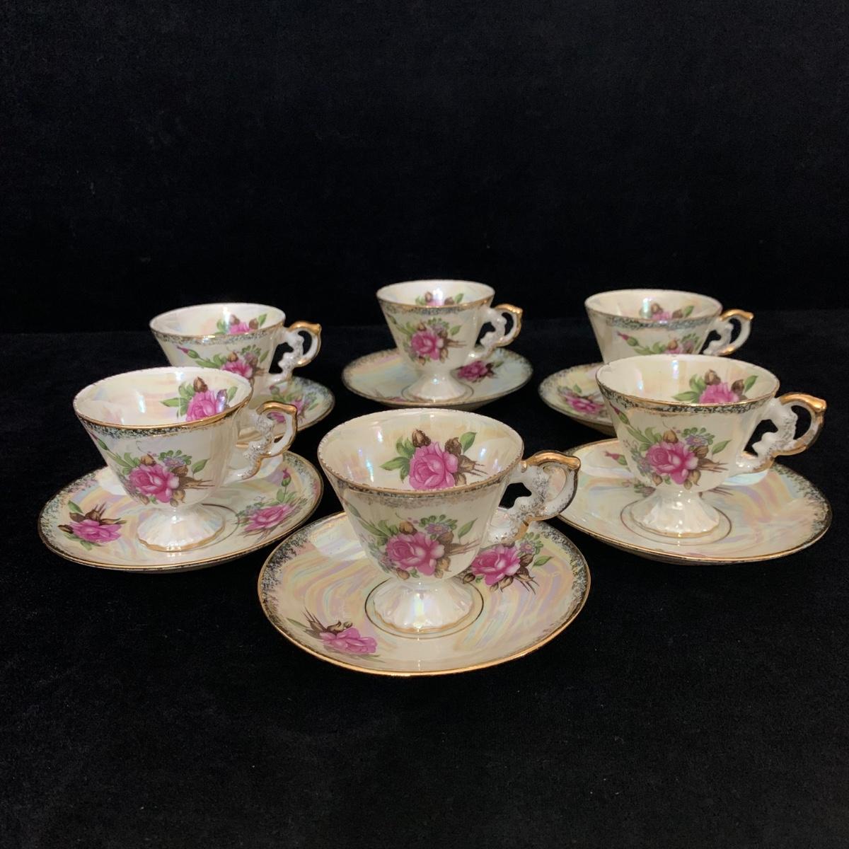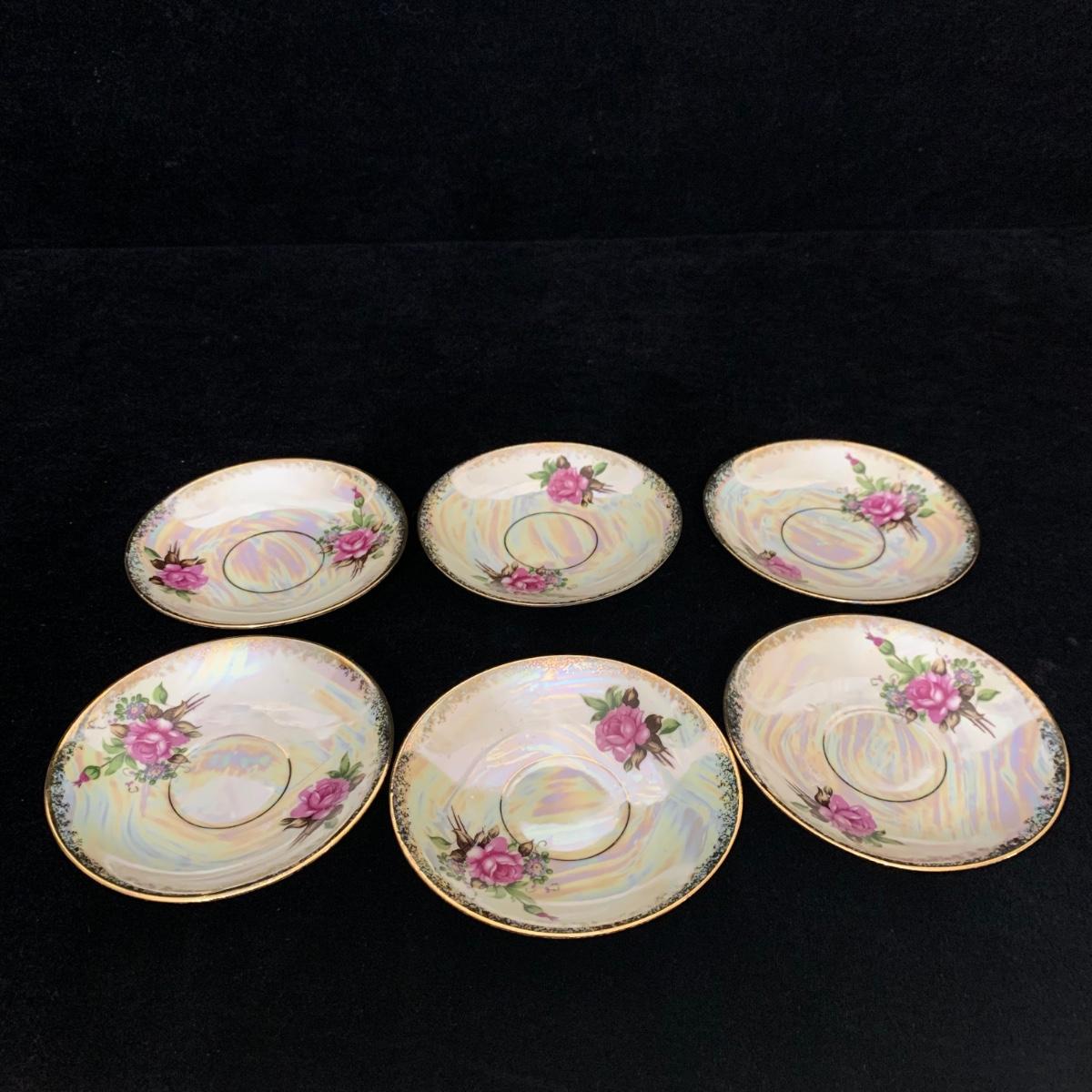 Set of six teacups and saucers with a rose motif on top of an iridescent background and gold rim accents. Saucers are just under 5”d. Set is in good condition. There is gentle wear on the design on just a couple of the cups and saucers. There is no maker’s mark or brand name.