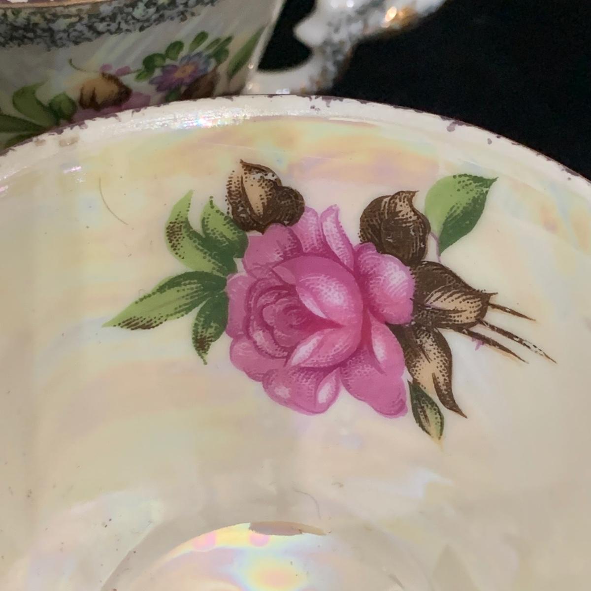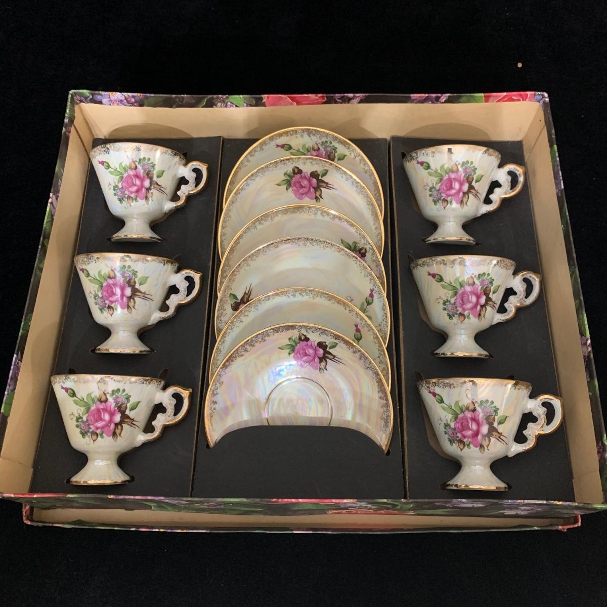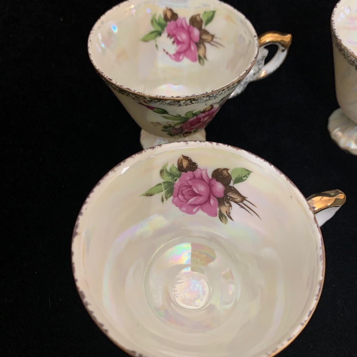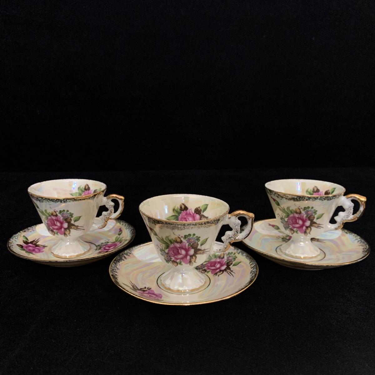 Set of six teacups and saucers with a rose motif on top of an iridescent background and gold rim accents. Saucers are just under 5”d. Set is in good condition. There is gentle wear on the design on just a couple of the cups and saucers. There is no maker’s mark or brand name.