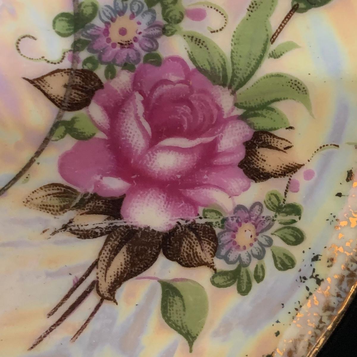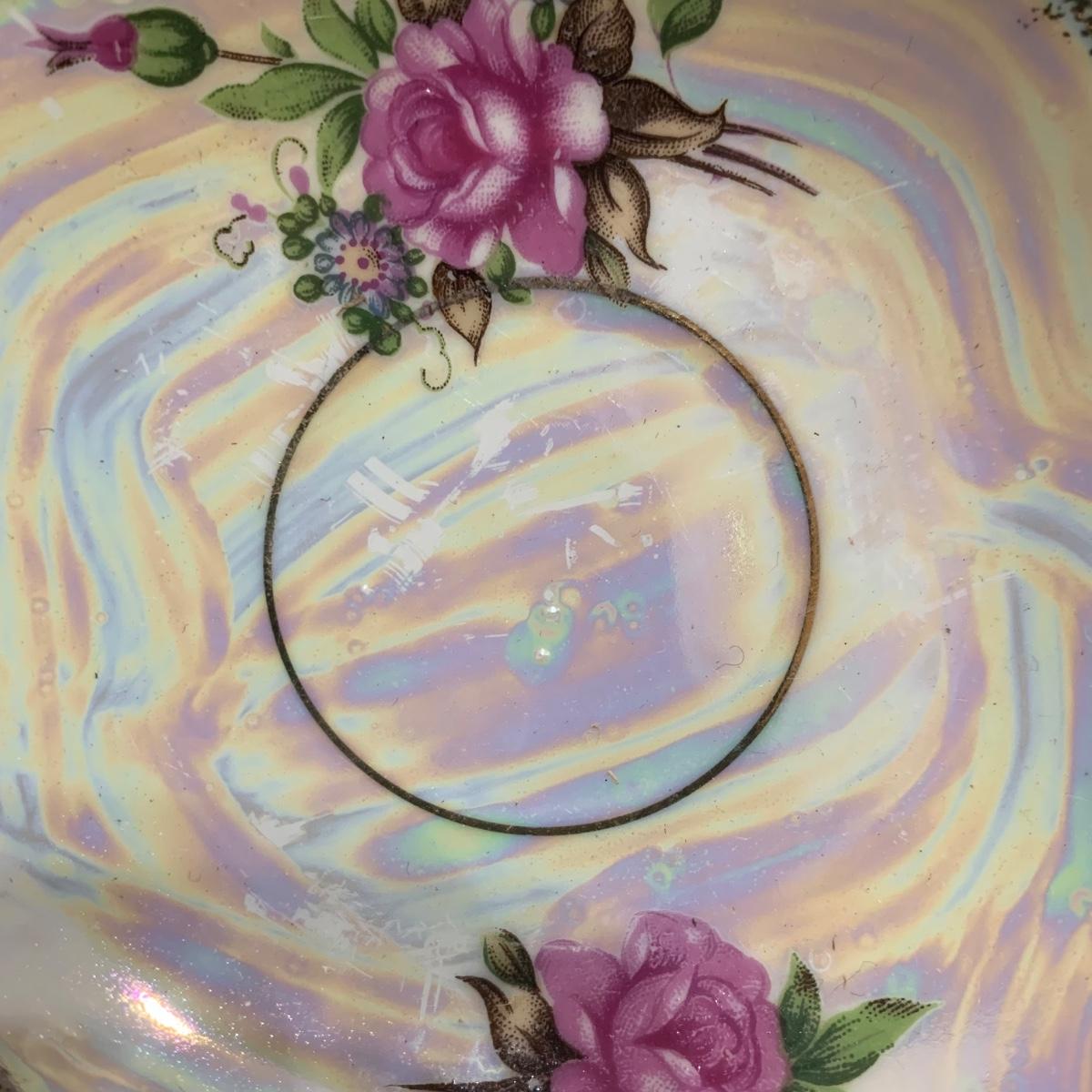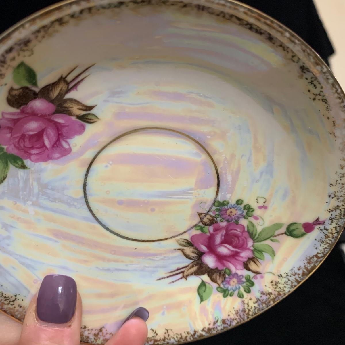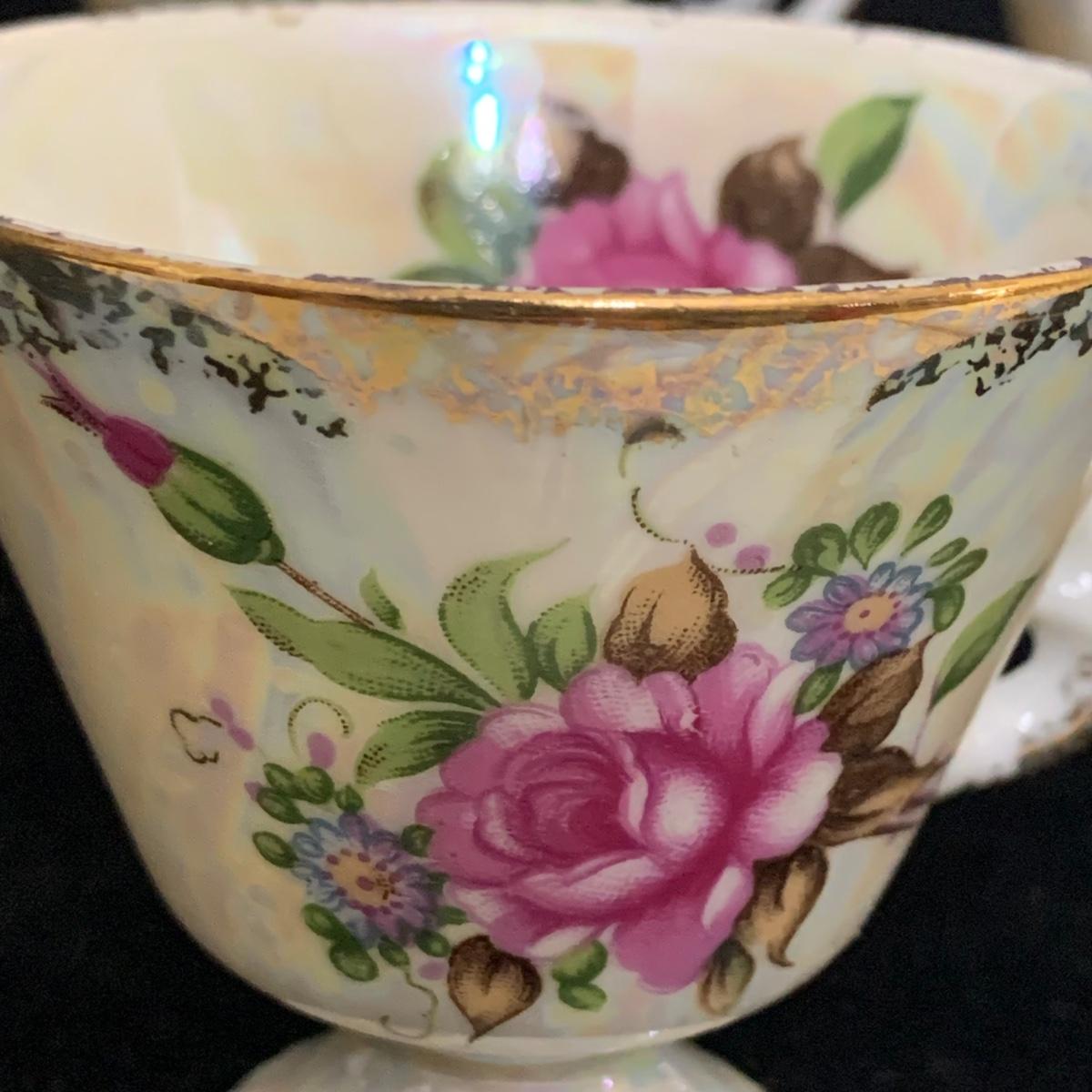 Set of six teacups and saucers with a rose motif on top of an iridescent background and gold rim accents. Saucers are just under 5”d. Set is in good condition. There is gentle wear on the design on just a couple of the cups and saucers. There is no maker’s mark or brand name.