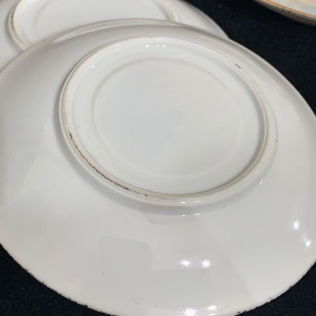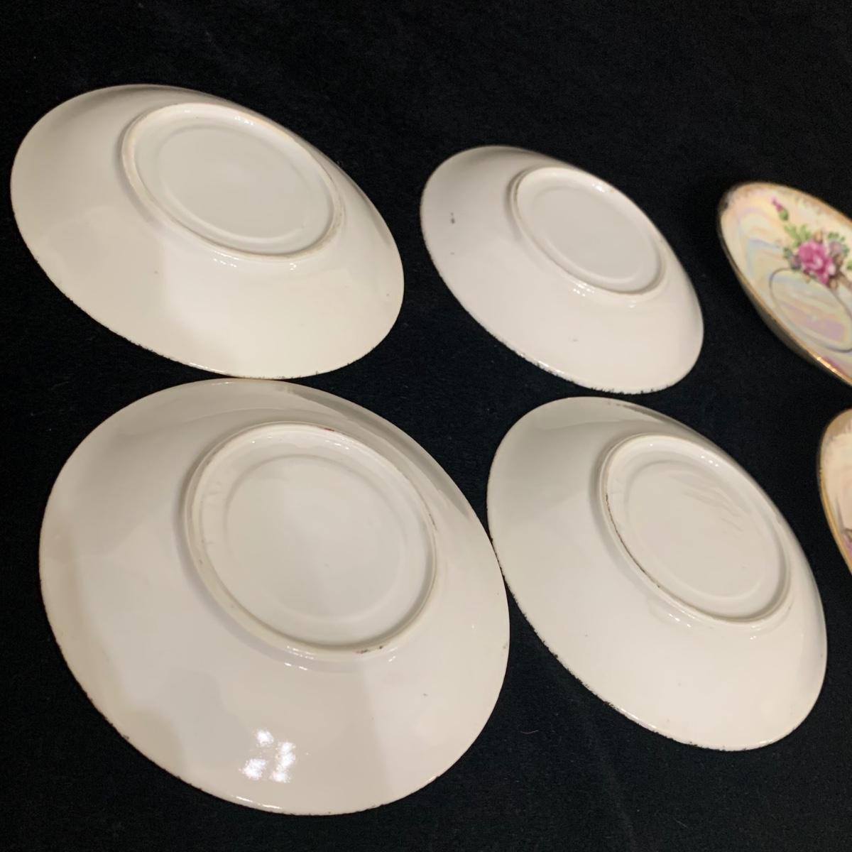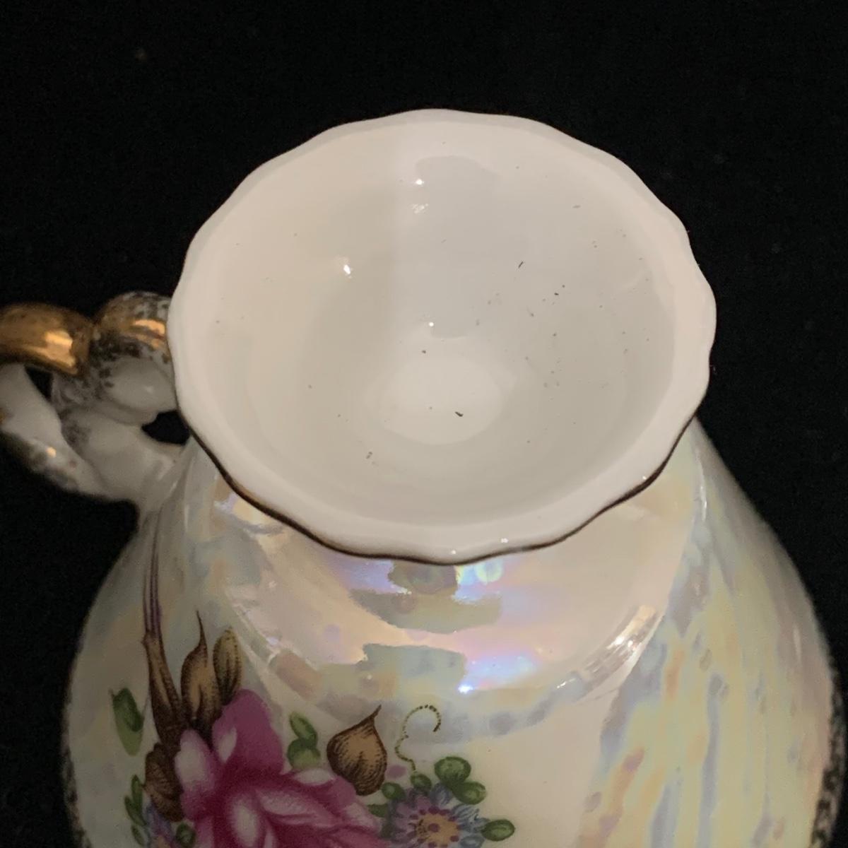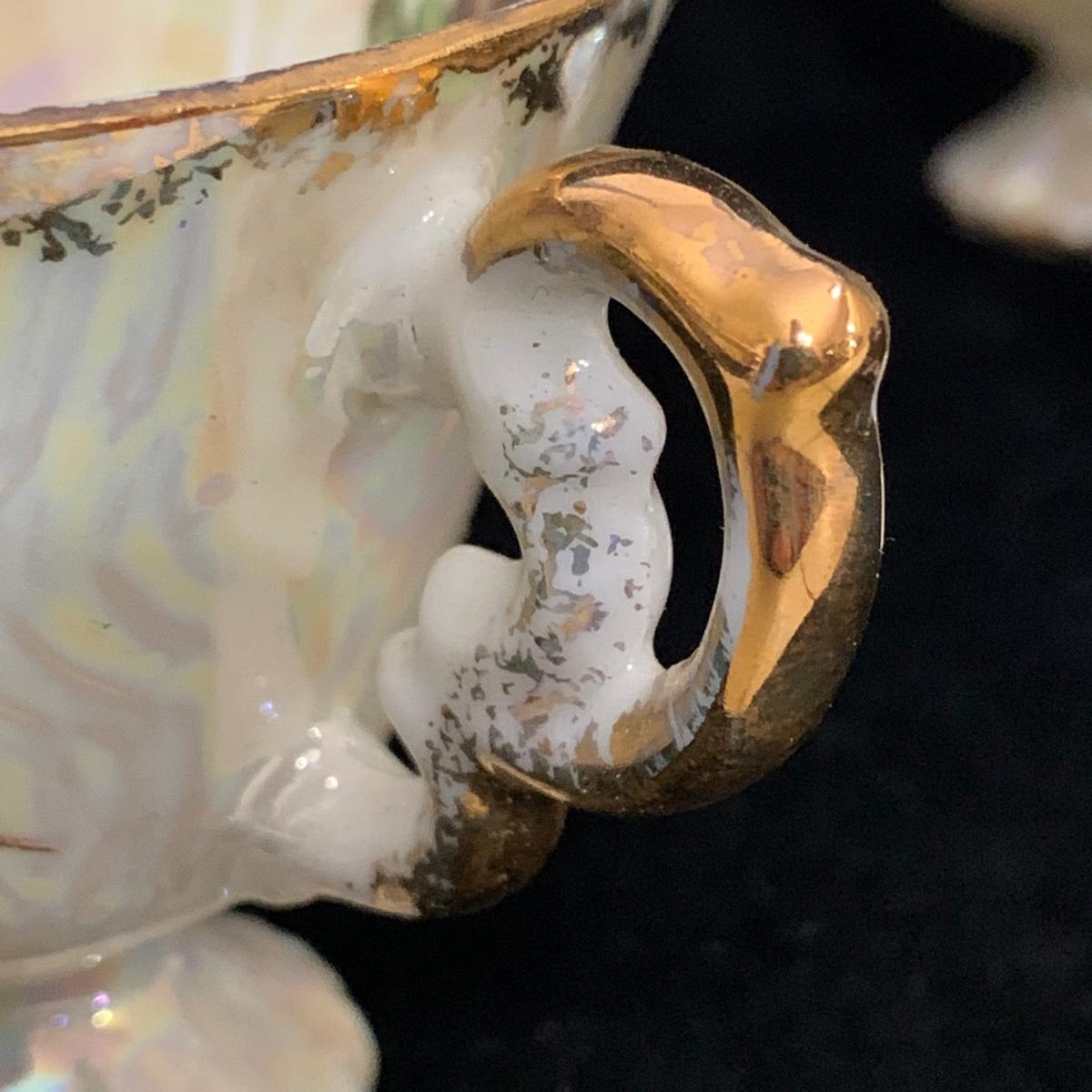 Set of six teacups and saucers with a rose motif on top of an iridescent background and gold rim accents. Saucers are just under 5”d. Set is in good condition. There is gentle wear on the design on just a couple of the cups and saucers. There is no maker’s mark or brand name.