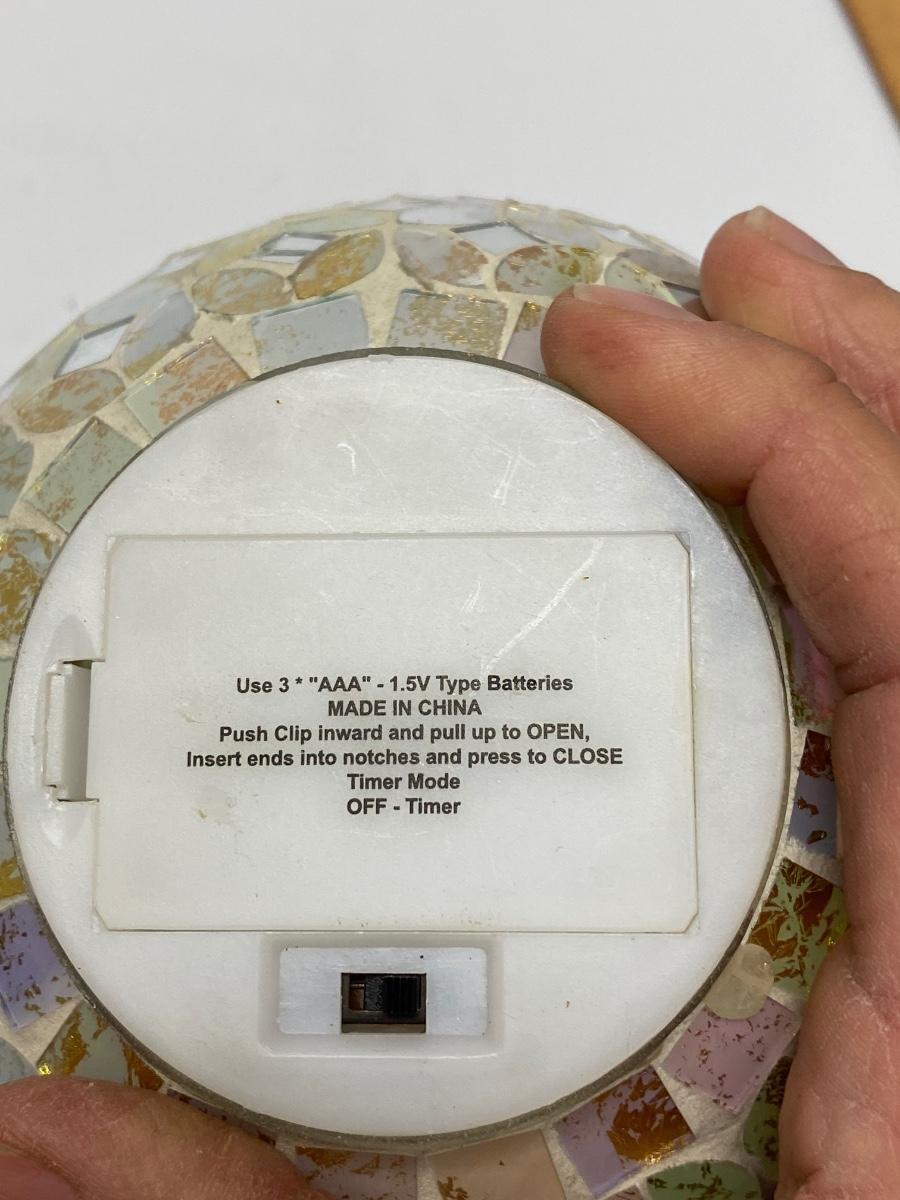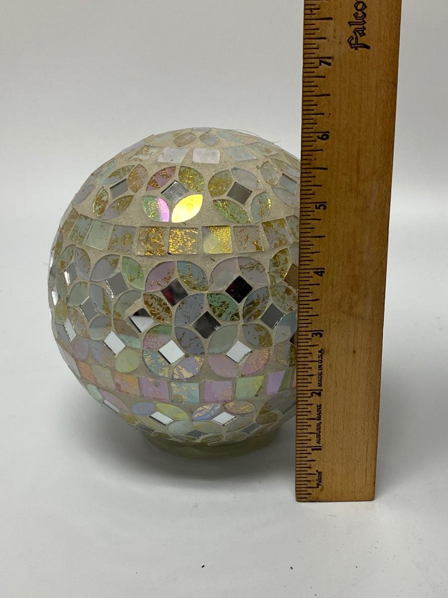Iridescent mosaic glass battery operated light up orb. Glass has a gold shimmer to it. Untested, no batteries. About 6" size.