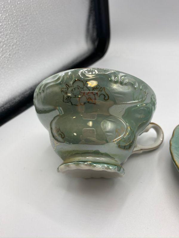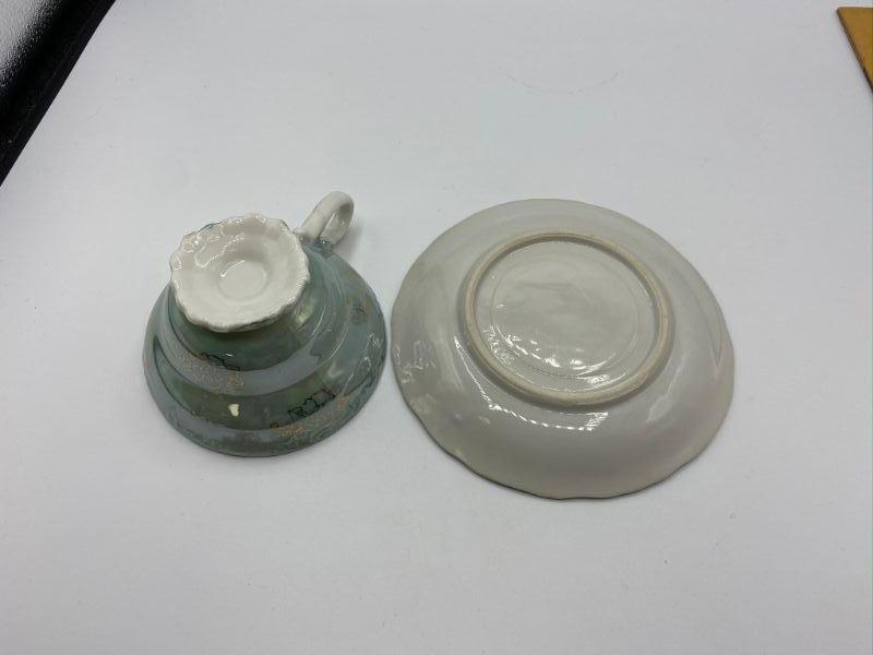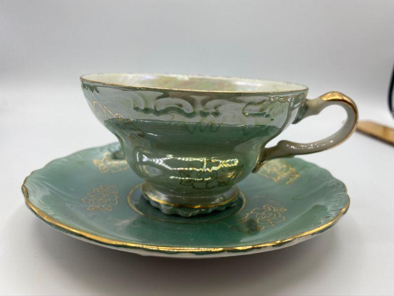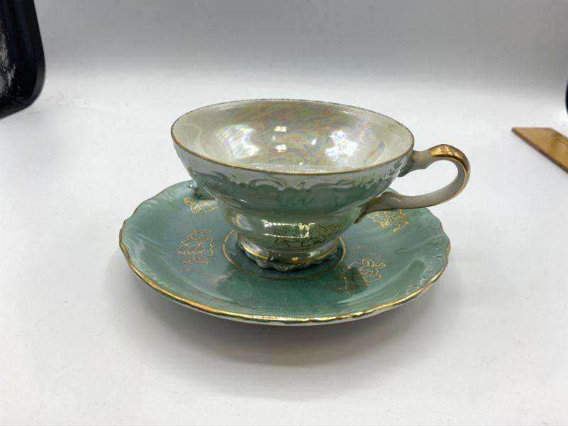 Beautiful sage green iridescent tea cup and saucer. Gold accents. No maker mark. Good condition, no chips.
