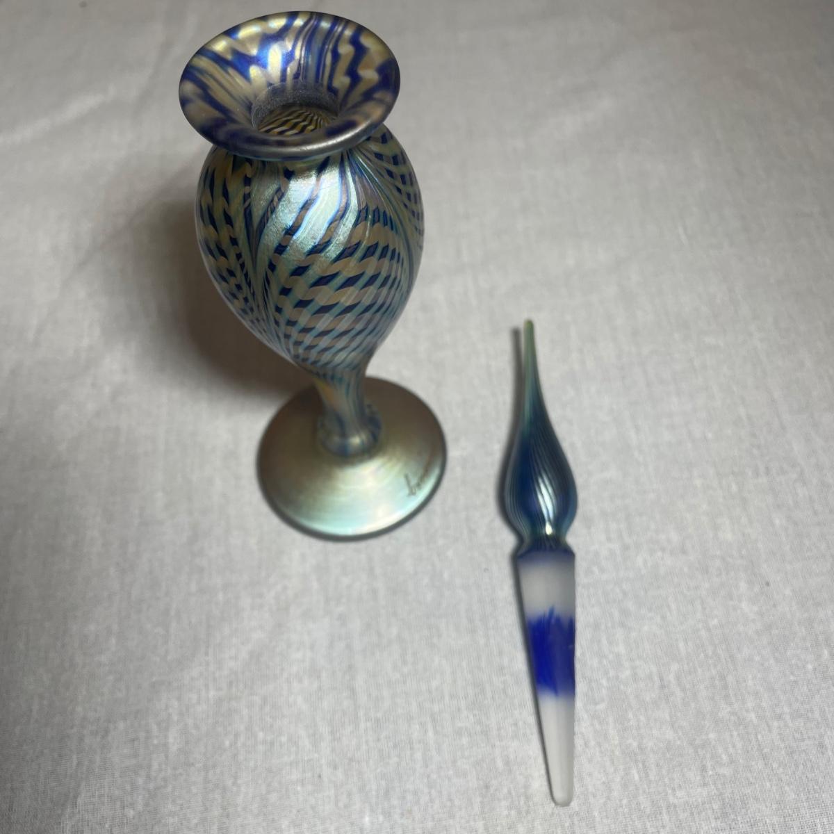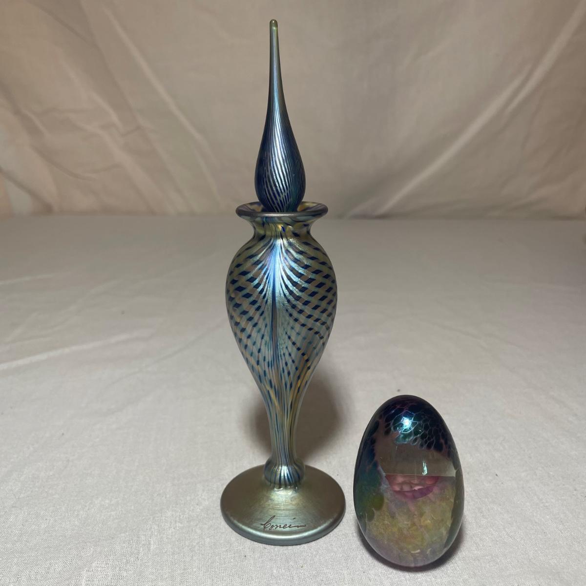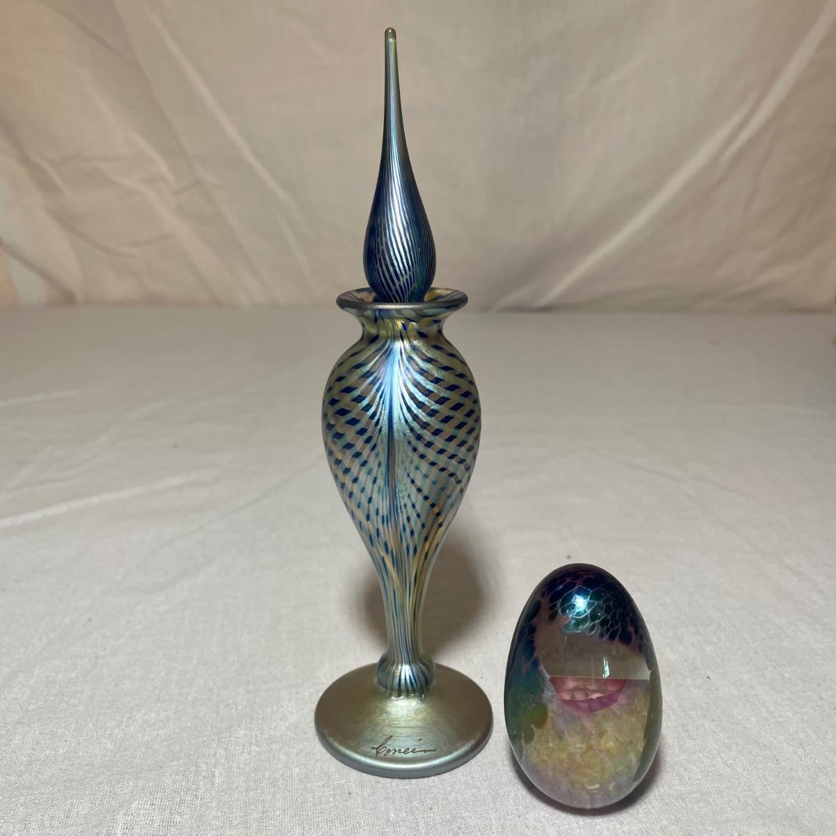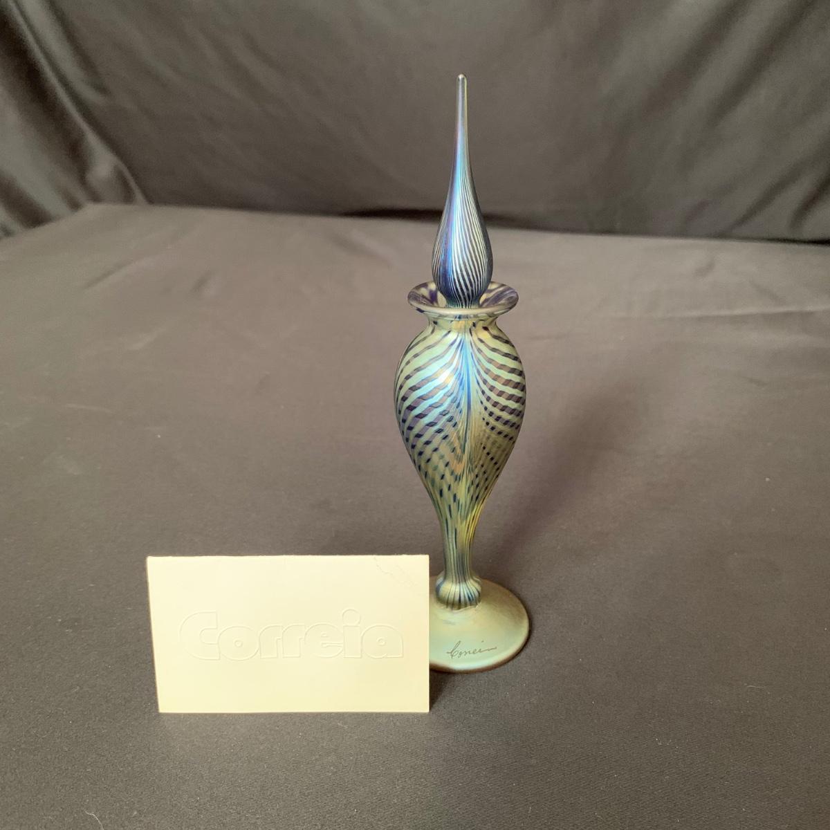 The 2 items in this lot are both very attractive iridescent glass and are in very good condition. The Correia Art Glass netted perfume bottle with stopper has a “˜pulled feather’ design and has a signature (Correia) on the top of the base and another that reads YPNCCL 31.82.8 on the bottom, which is its registration number, see images. Bottle measures 1.5” D (base) x 7” H. Artisan egg stands 2” H.
