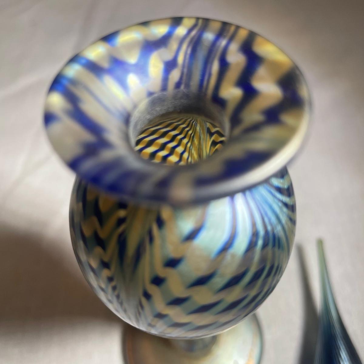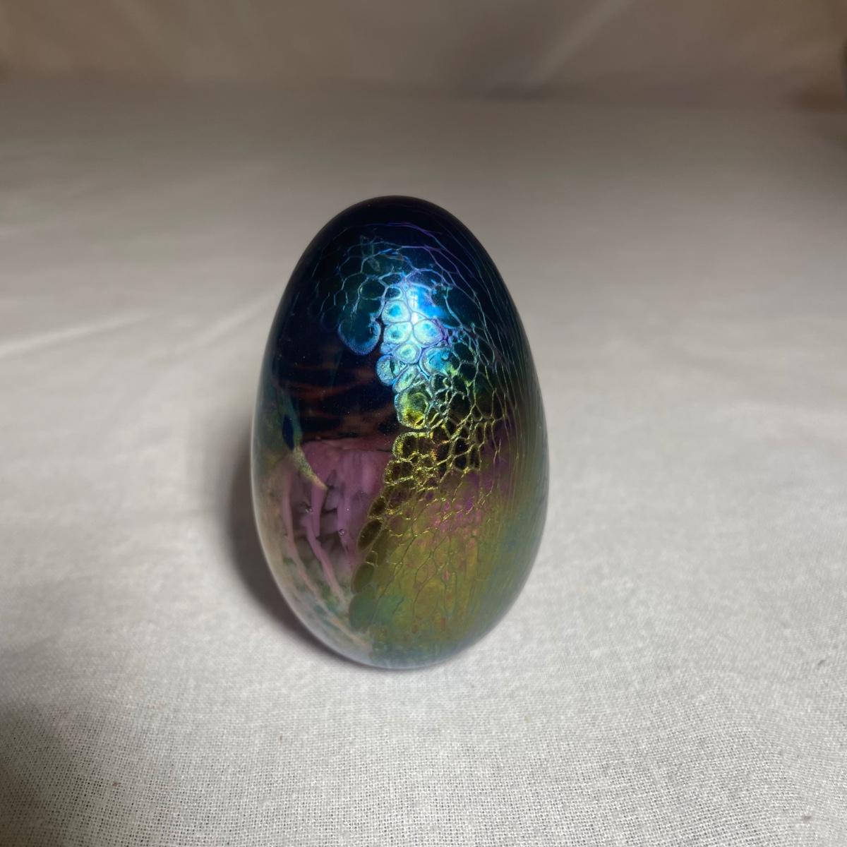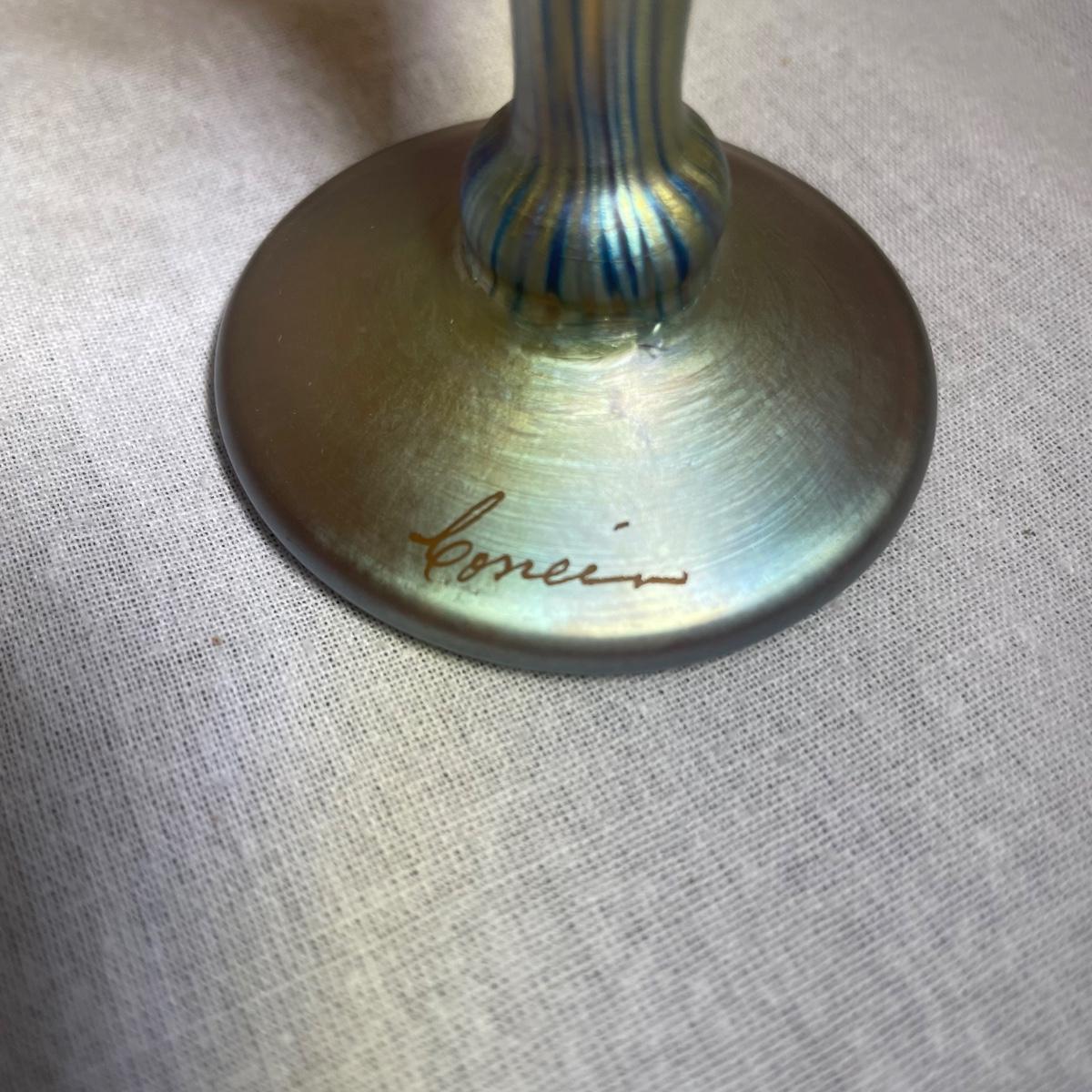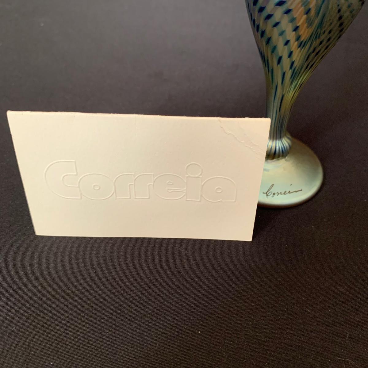 The 2 items in this lot are both very attractive iridescent glass and are in very good condition. The Correia Art Glass netted perfume bottle with stopper has a “˜pulled feather’ design and has a signature (Correia) on the top of the base and another that reads YPNCCL 31.82.8 on the bottom, which is its registration number, see images. Bottle measures 1.5” D (base) x 7” H. Artisan egg stands 2” H.