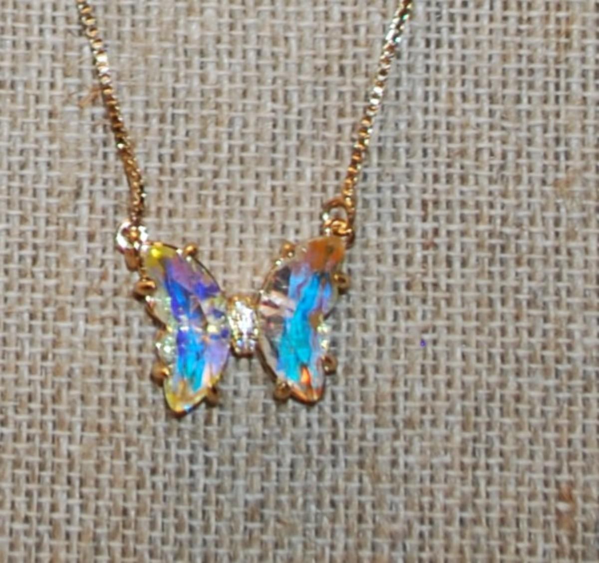 Iridescent Yellow/Blue Butterfly PENDANT (¾" x ¾") on a Gold Tone Necklace Chain 18" L