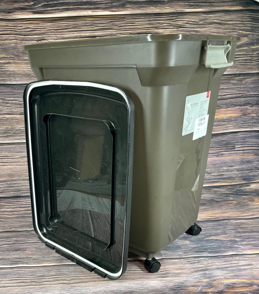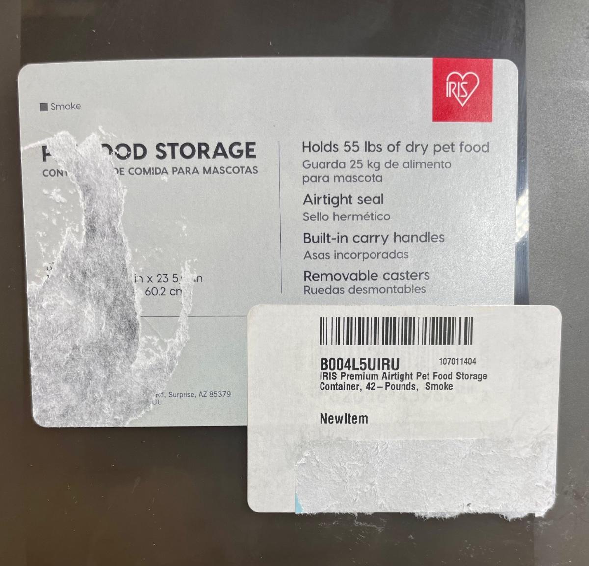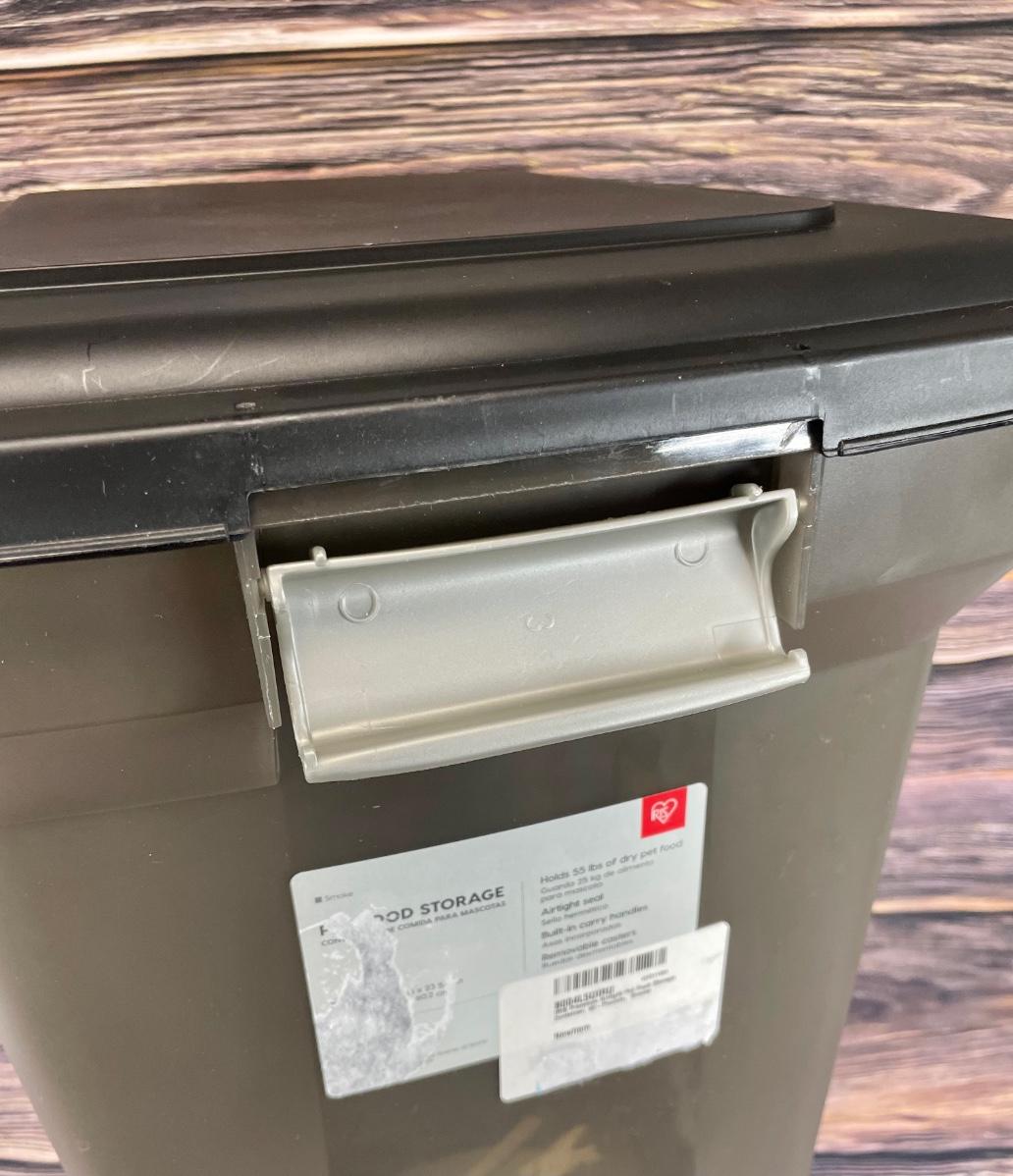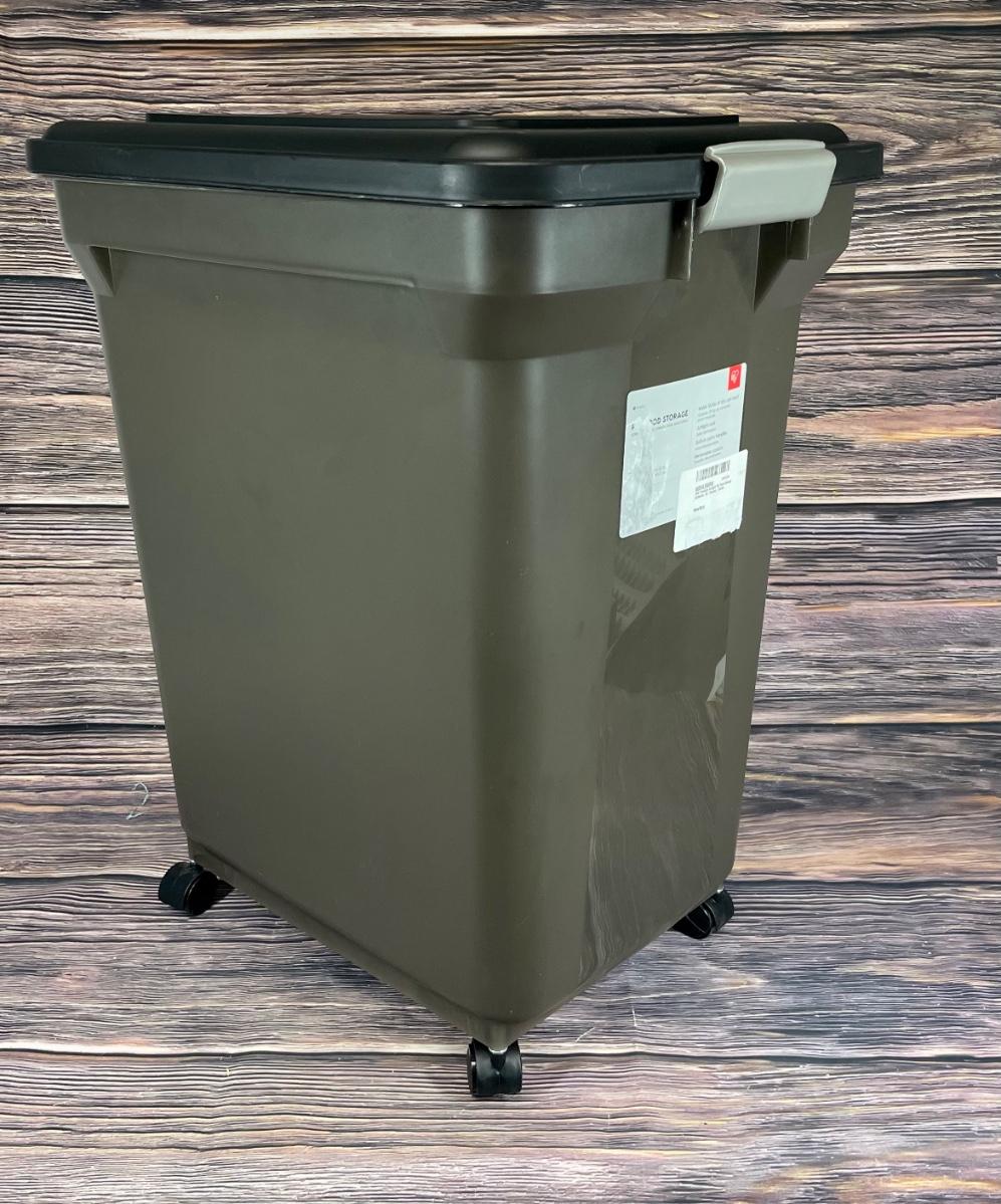 Plastic 42 lb (55 qt) pet food container with casters on bottom. Holds 42 lbs of food (55 qt by volume) and is smoke gray with a black lid. Lid retainer clips in back are broken, see photos for details. 23” tall, approx. 18” deep and 14” wide.