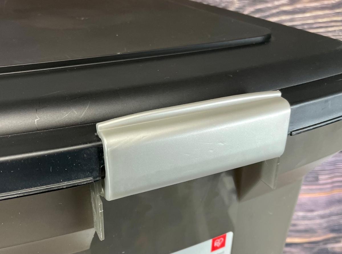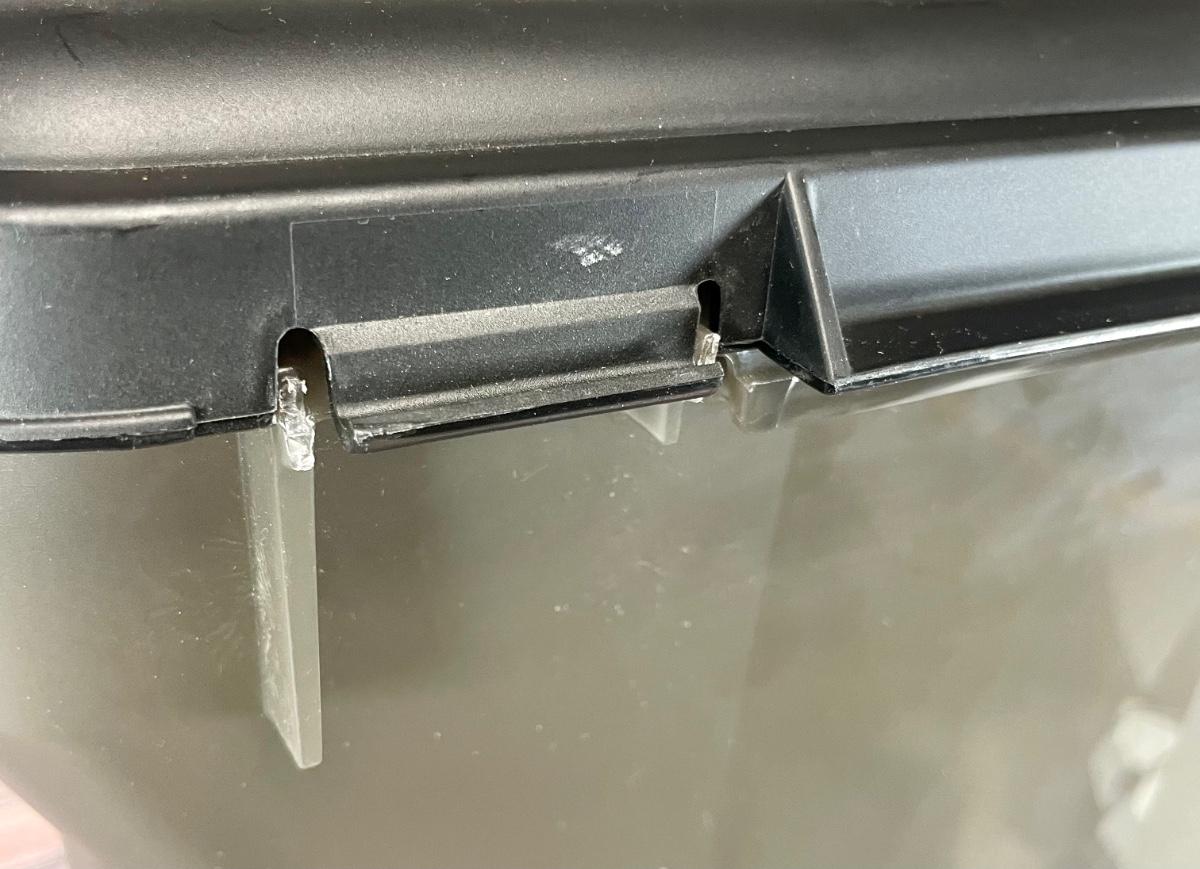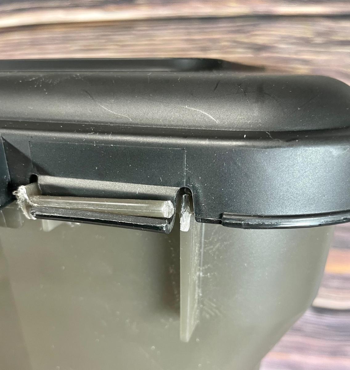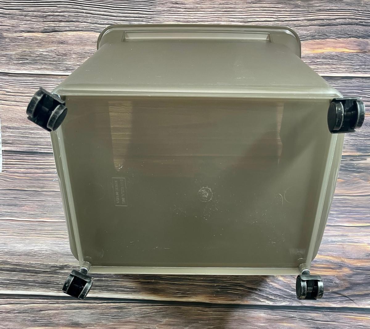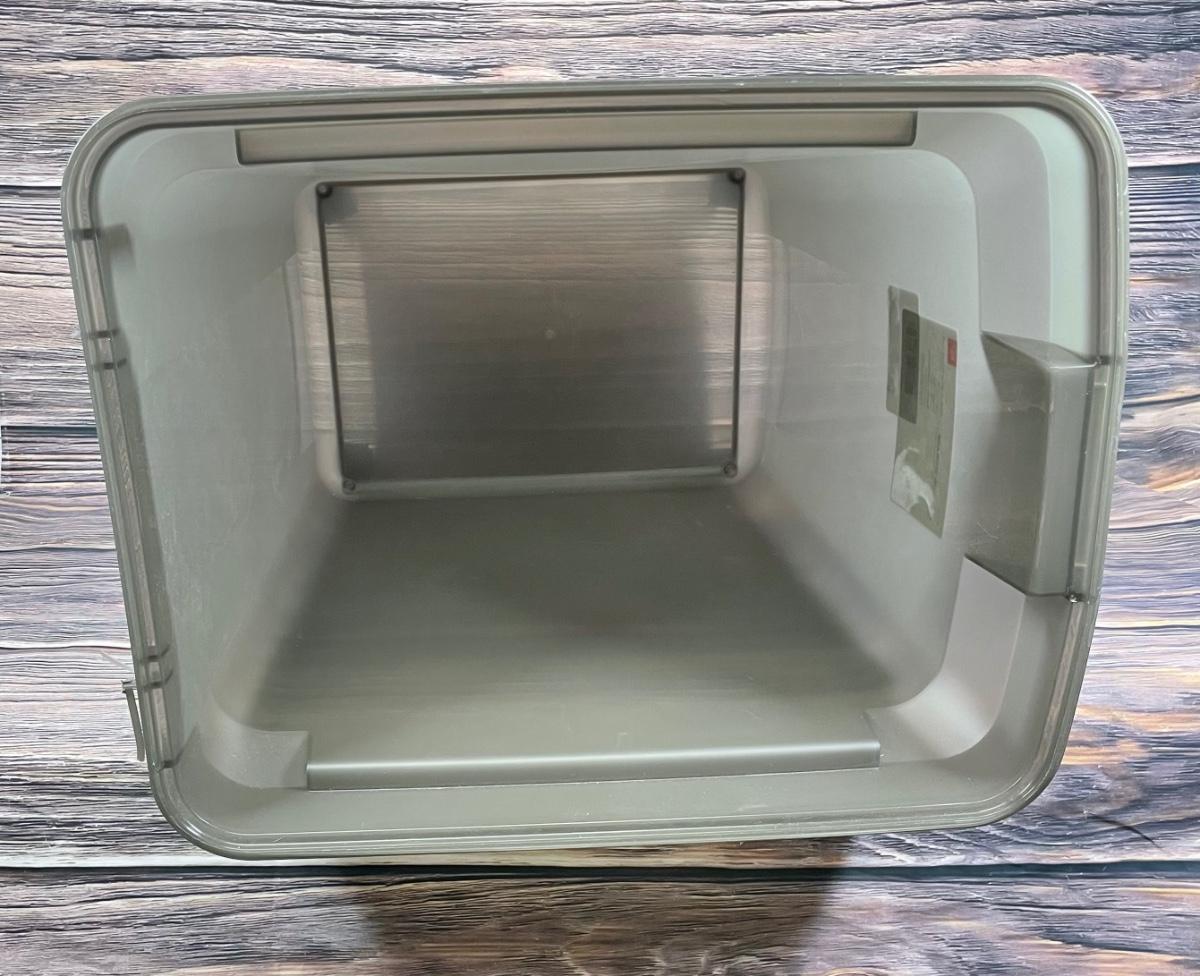 Plastic 42 lb (55 qt) pet food container with casters on bottom. Holds 42 lbs of food (55 qt by volume) and is smoke gray with a black lid. Lid retainer clips in back are broken, see photos for details. 23” tall, approx. 18” deep and 14” wide.