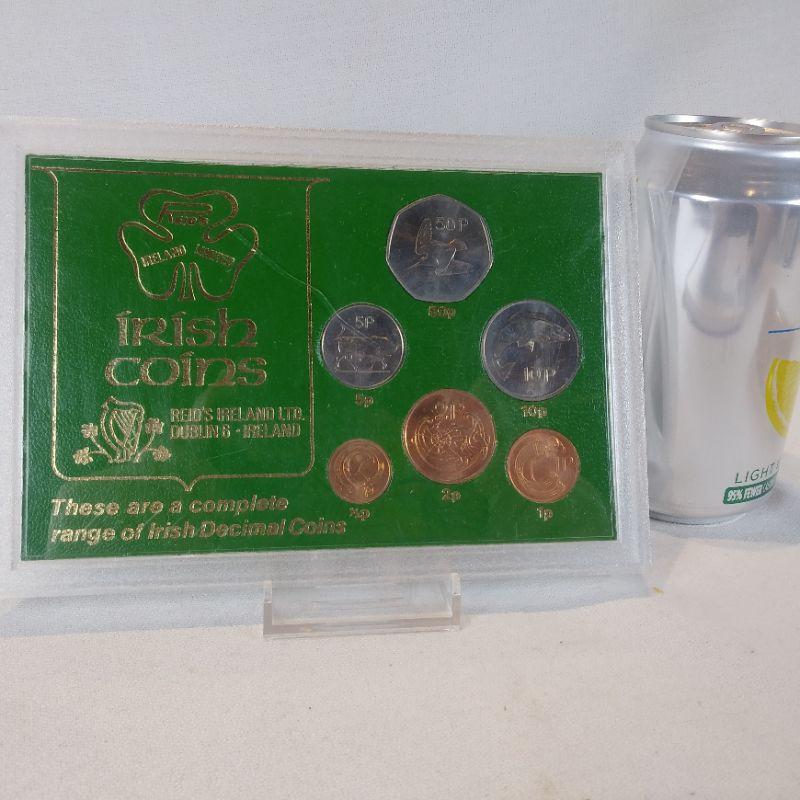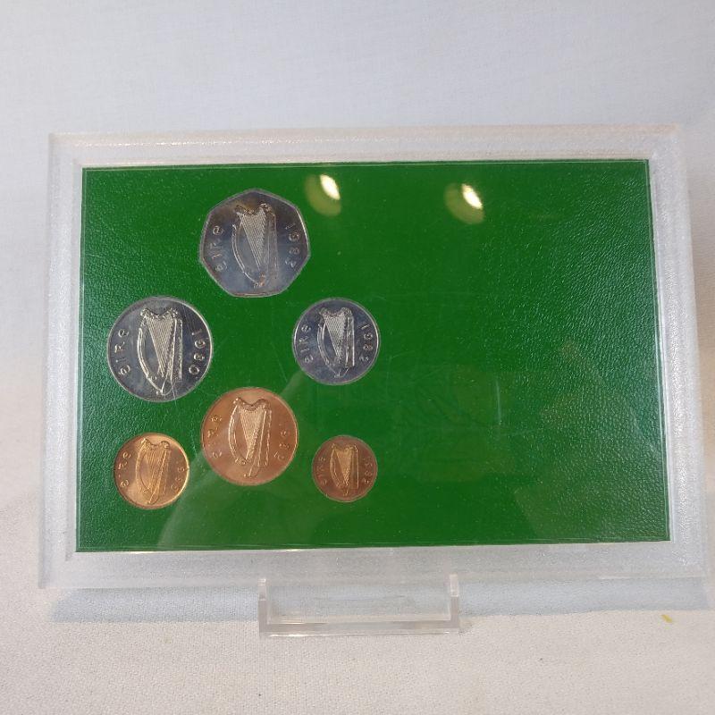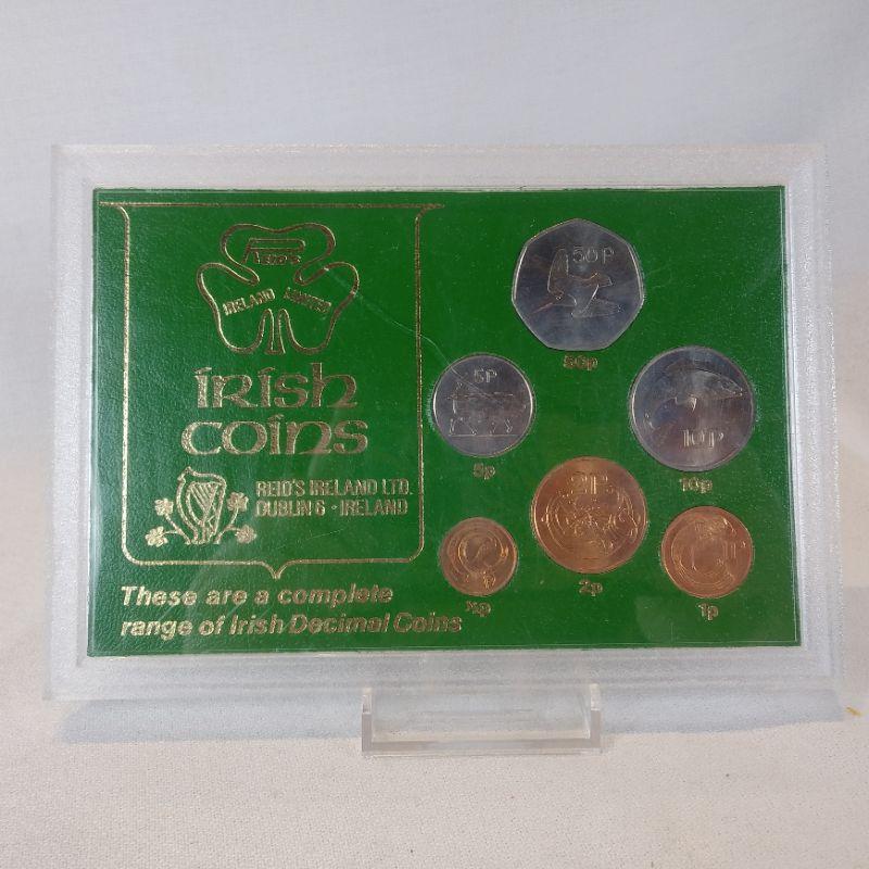 This collector set is encased in acrylic for protection and posterity. It is a complete range of Irish Decimal Coins - 1980-1985. Case has some light scratches. Nice set to add to or start a foreign coin collection. Or just something your favorite leprechaun might enjoy.