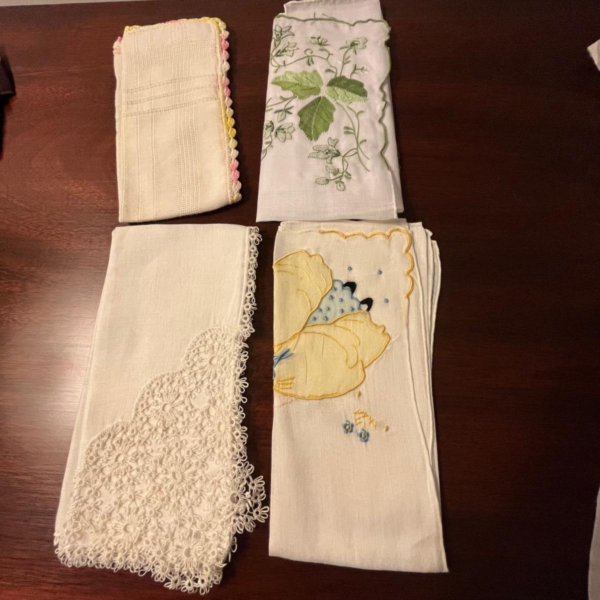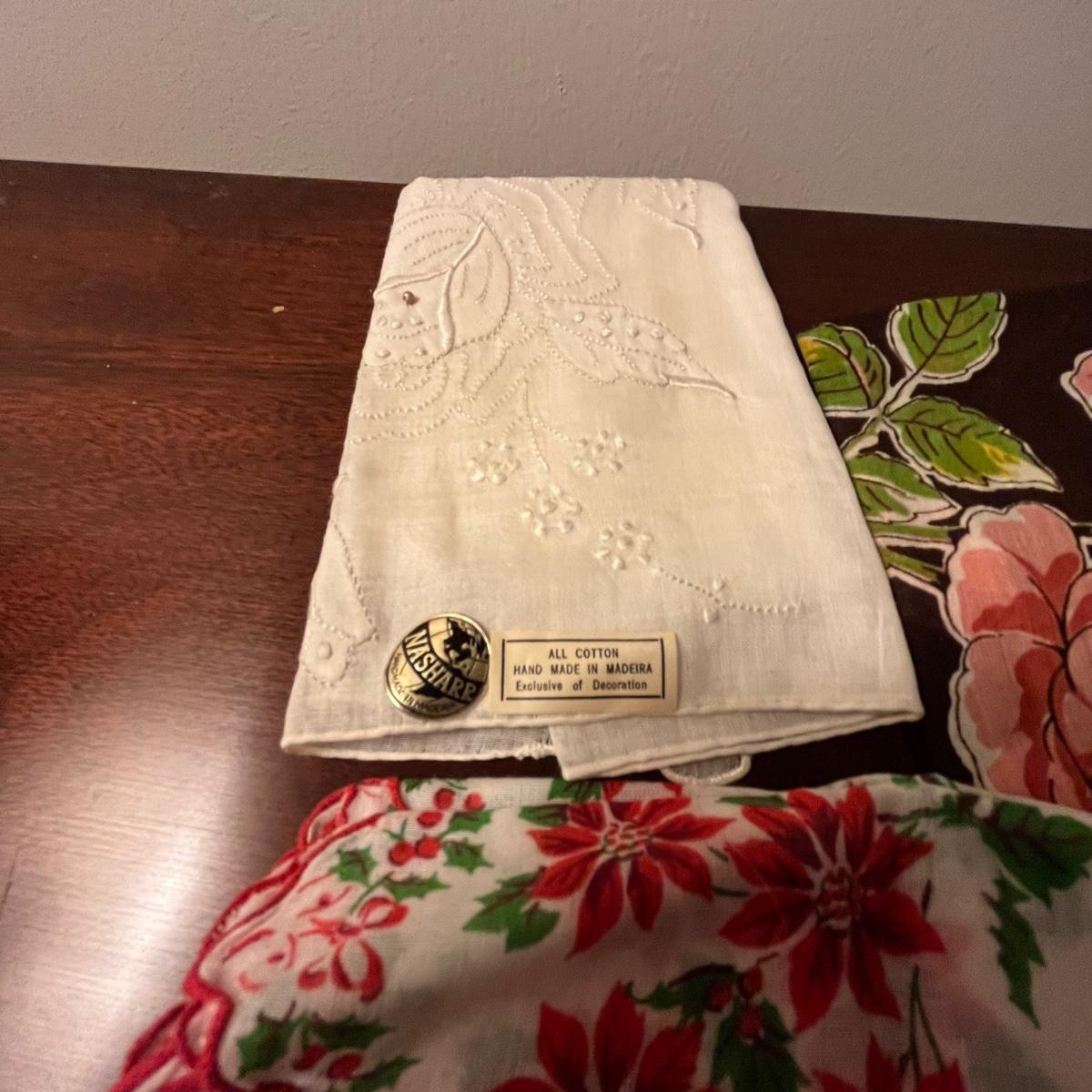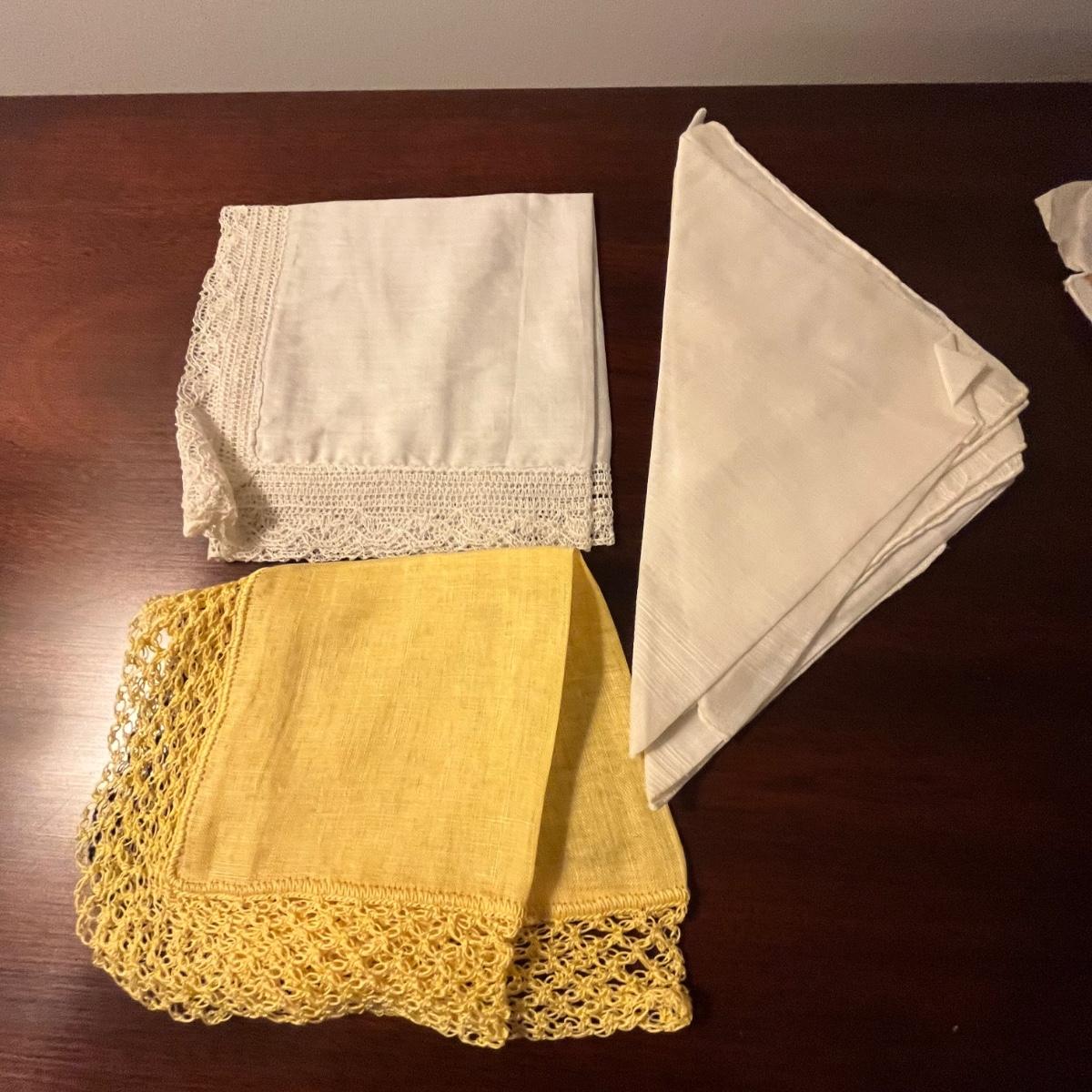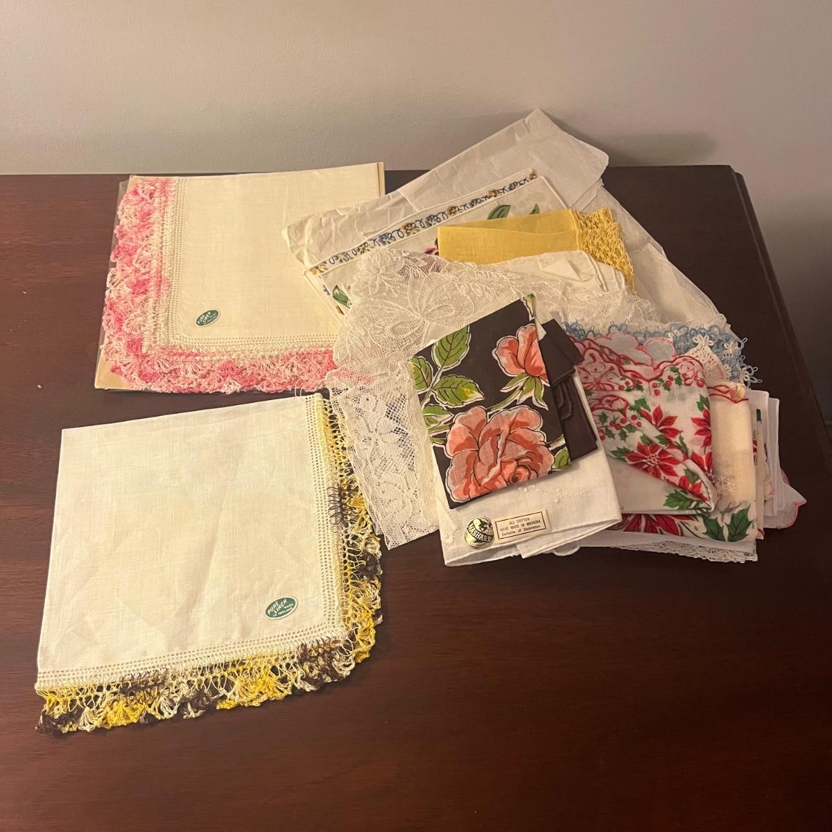 Lot includes five hankies marked Irish linen, one Madeiran linen and the rest are unmarked. Largest piece measures 12” x 12”.