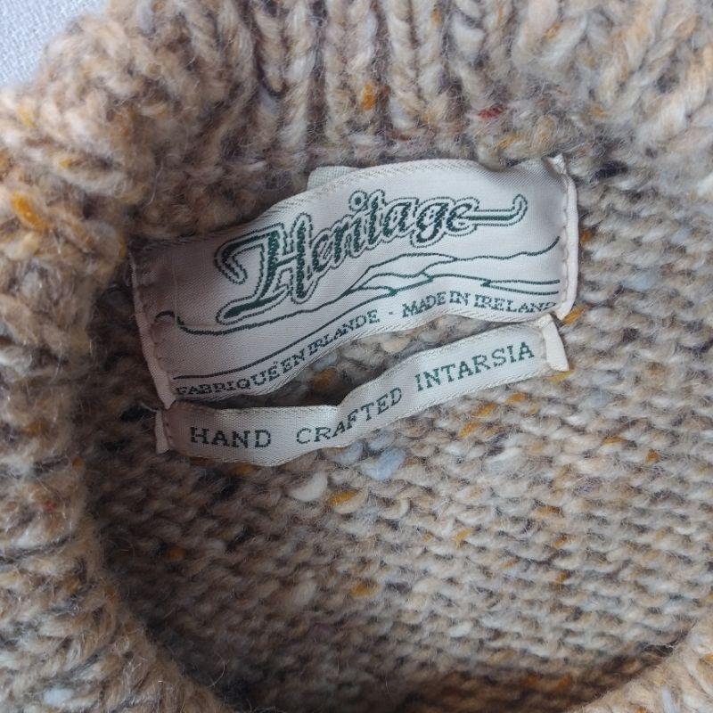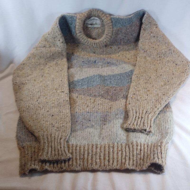 Beautiful Irish Wool Sweater. Made in Ireland of virgin Irish wool. Size 42. Never worn. Brown flecked with blue and grey wedge shapes. Handcrafted Intrasia - also known as picture knitting. Intarsia is a difficult skill that enables knitters to create isolated chunks of color and/or motifs of multiple colors. Intarsia earns its picture knitting nickname particularly when you consider statement sweaters such as this one.