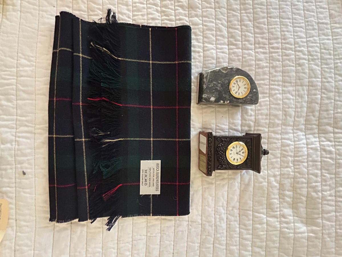 Clocks and scarf all made in Ireland. Clocks say it time for a pint.