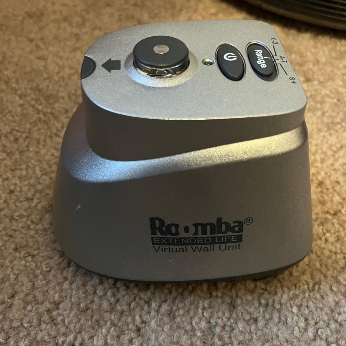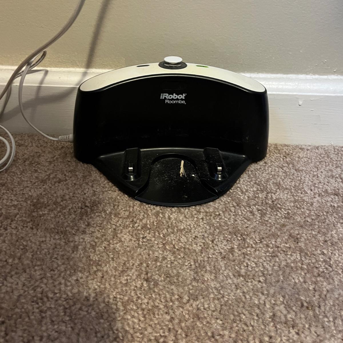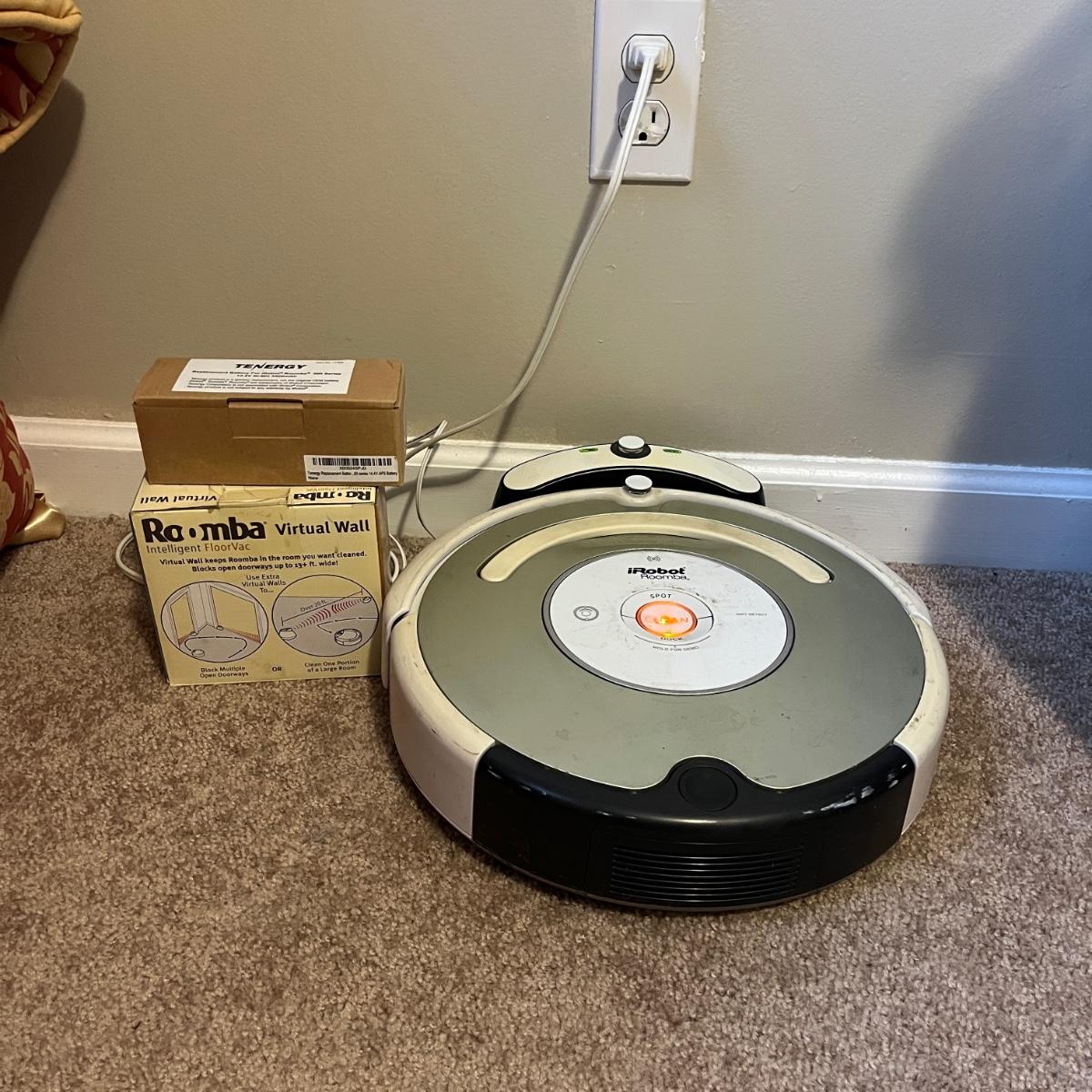 Lot includes a IRobot Roomba with docking base, virtual wall and replacement battery. Machine powered on when plugged in.