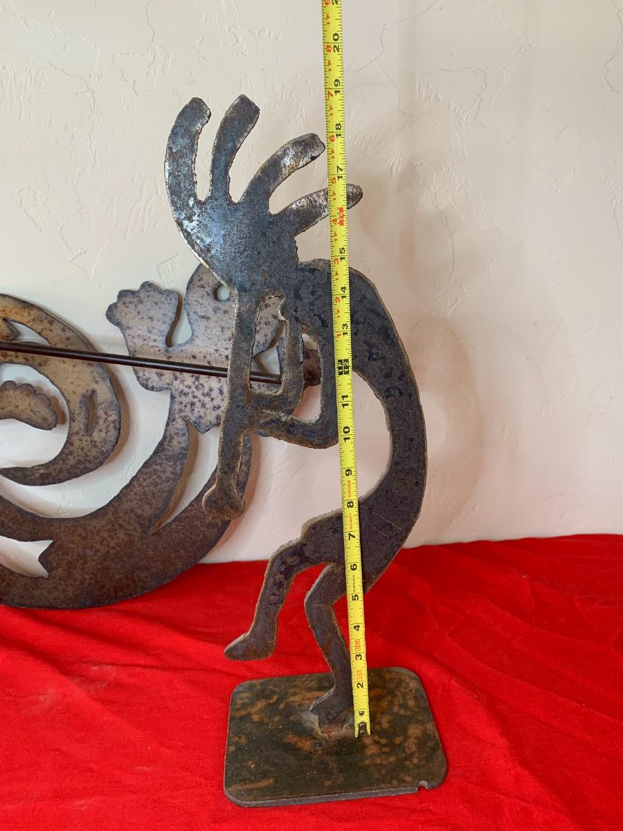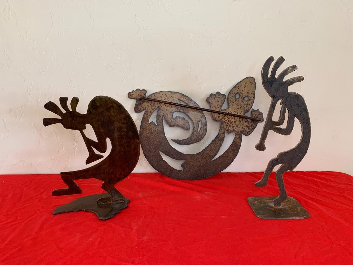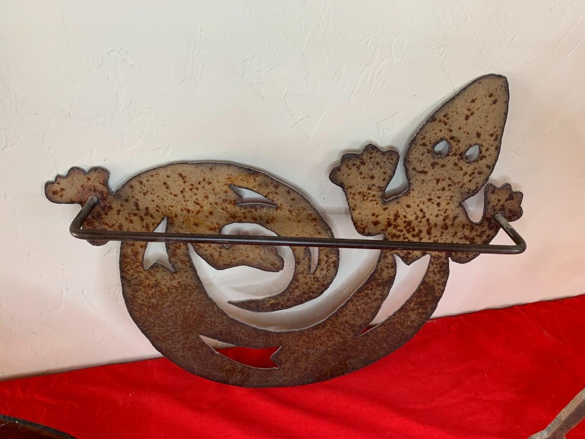 Three iron metal decor pieces including two metal kokopelli (large 20 inches in height) figures and one large iron gecko towel bar (22 inches across)