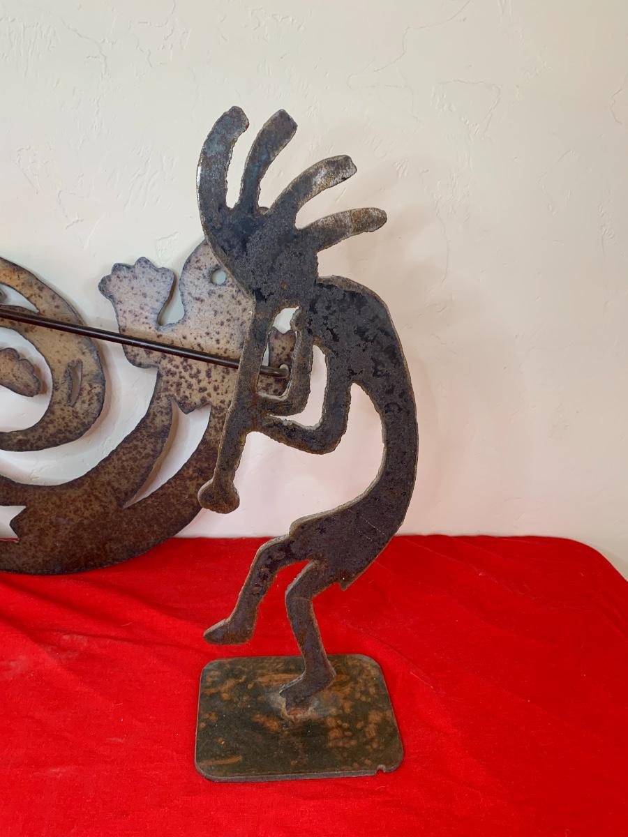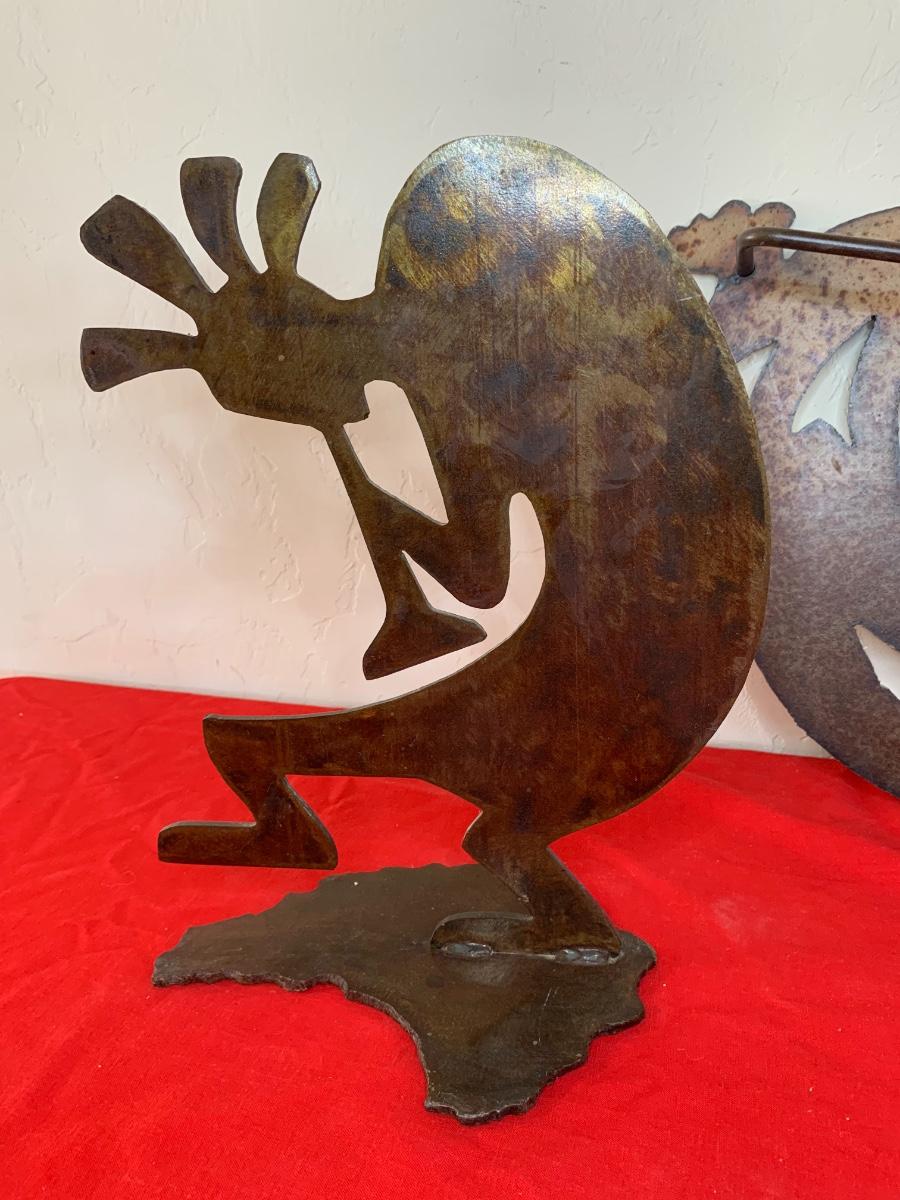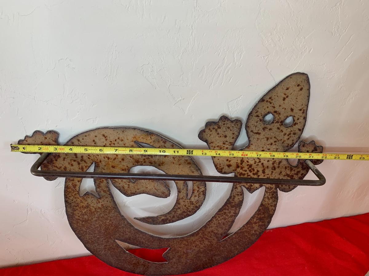 Three iron metal decor pieces including two metal kokopelli (large 20 inches in height) figures and one large iron gecko towel bar (22 inches across)