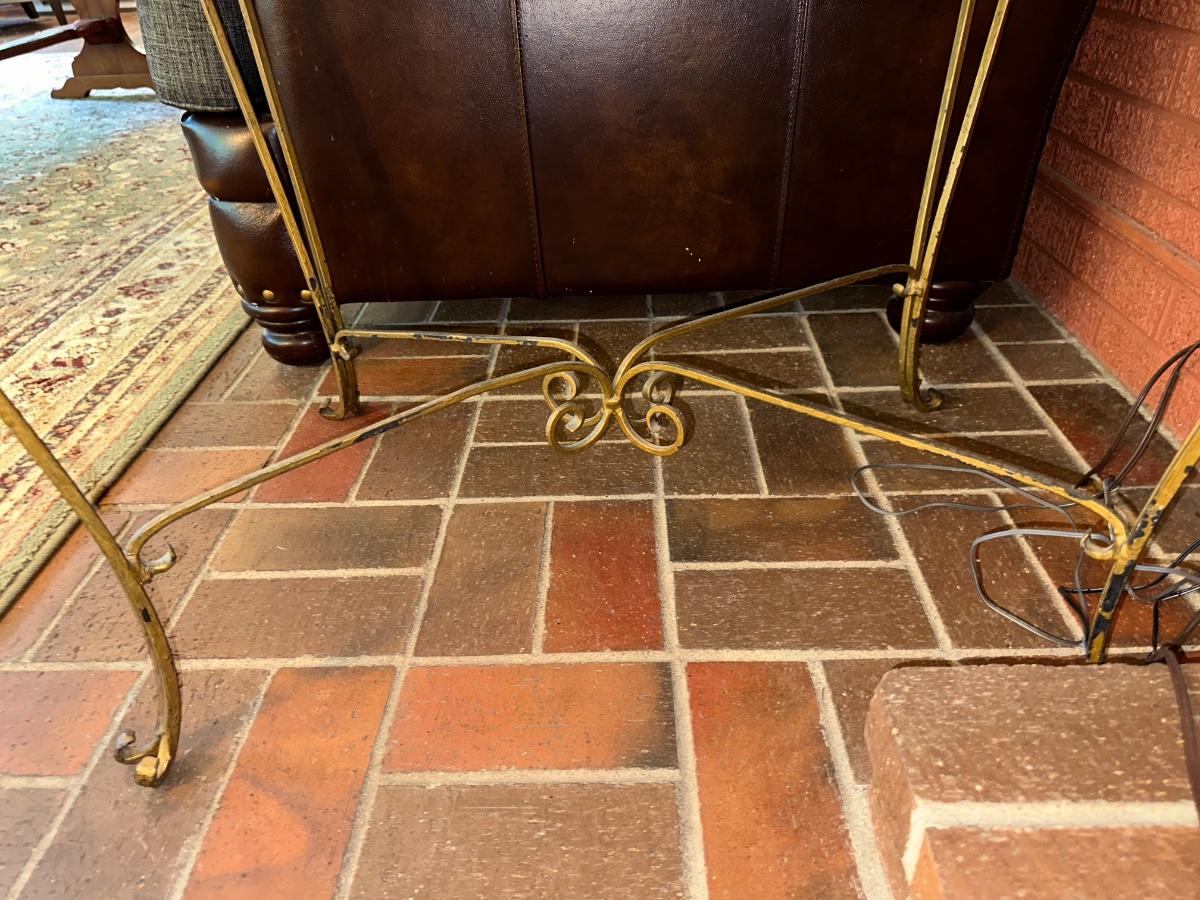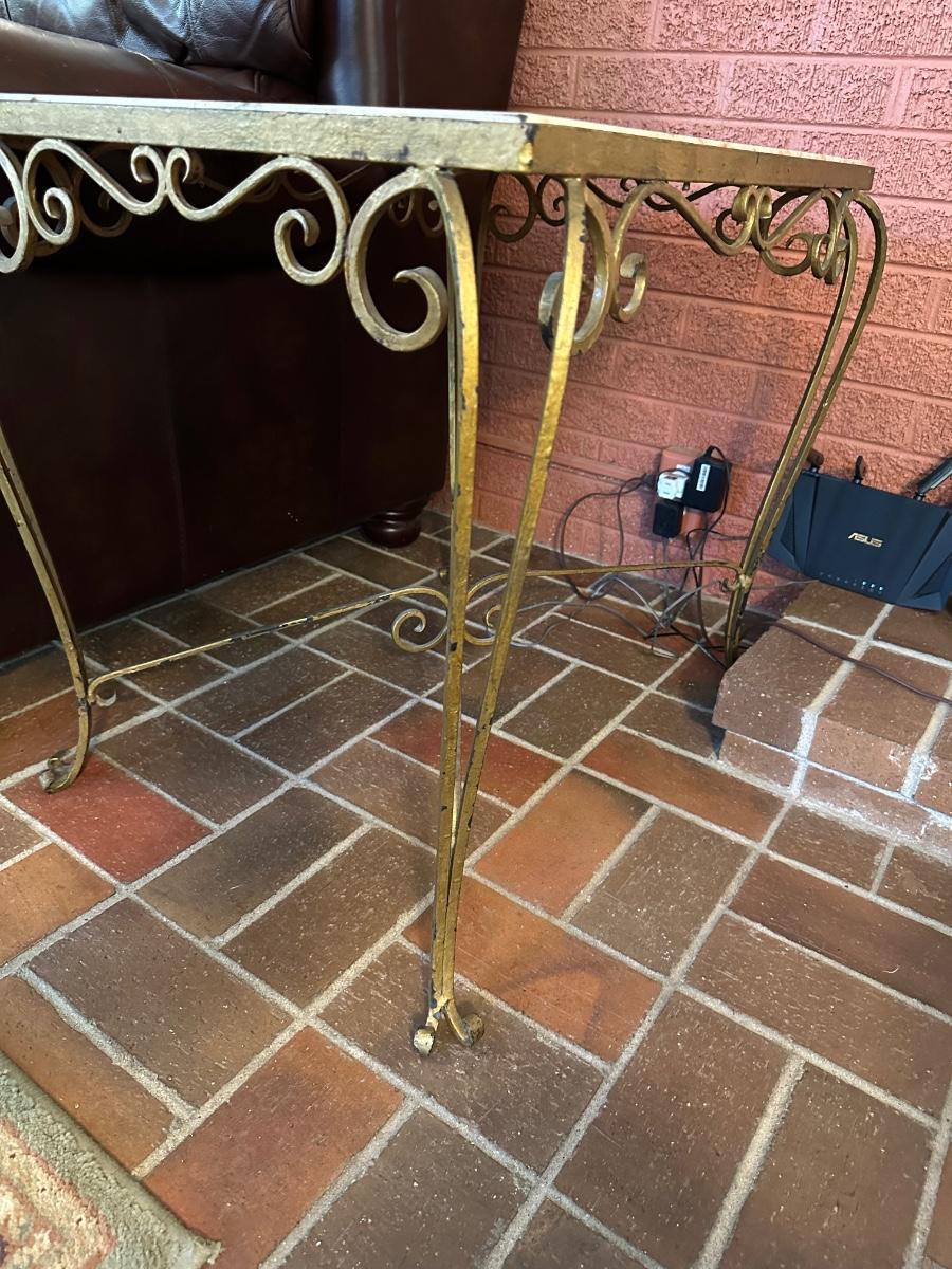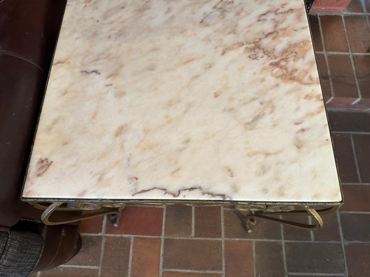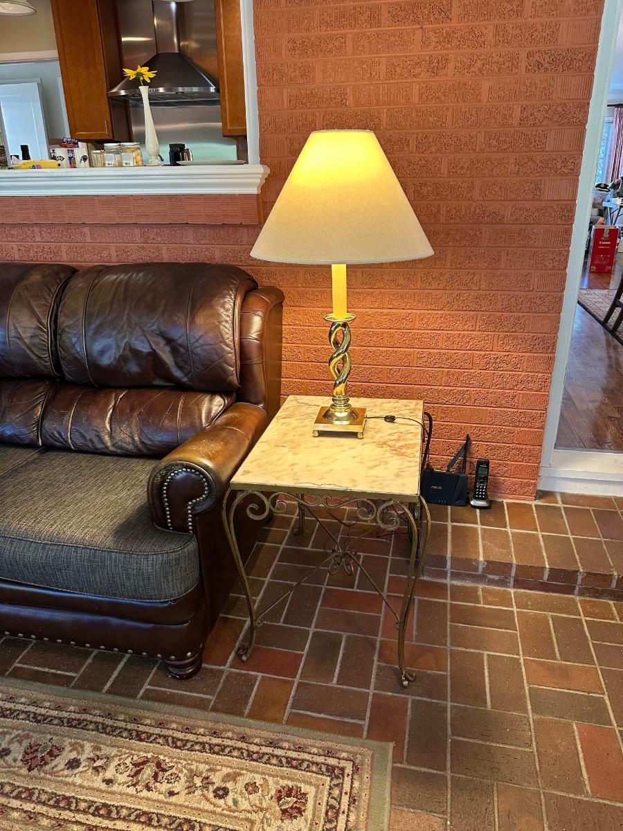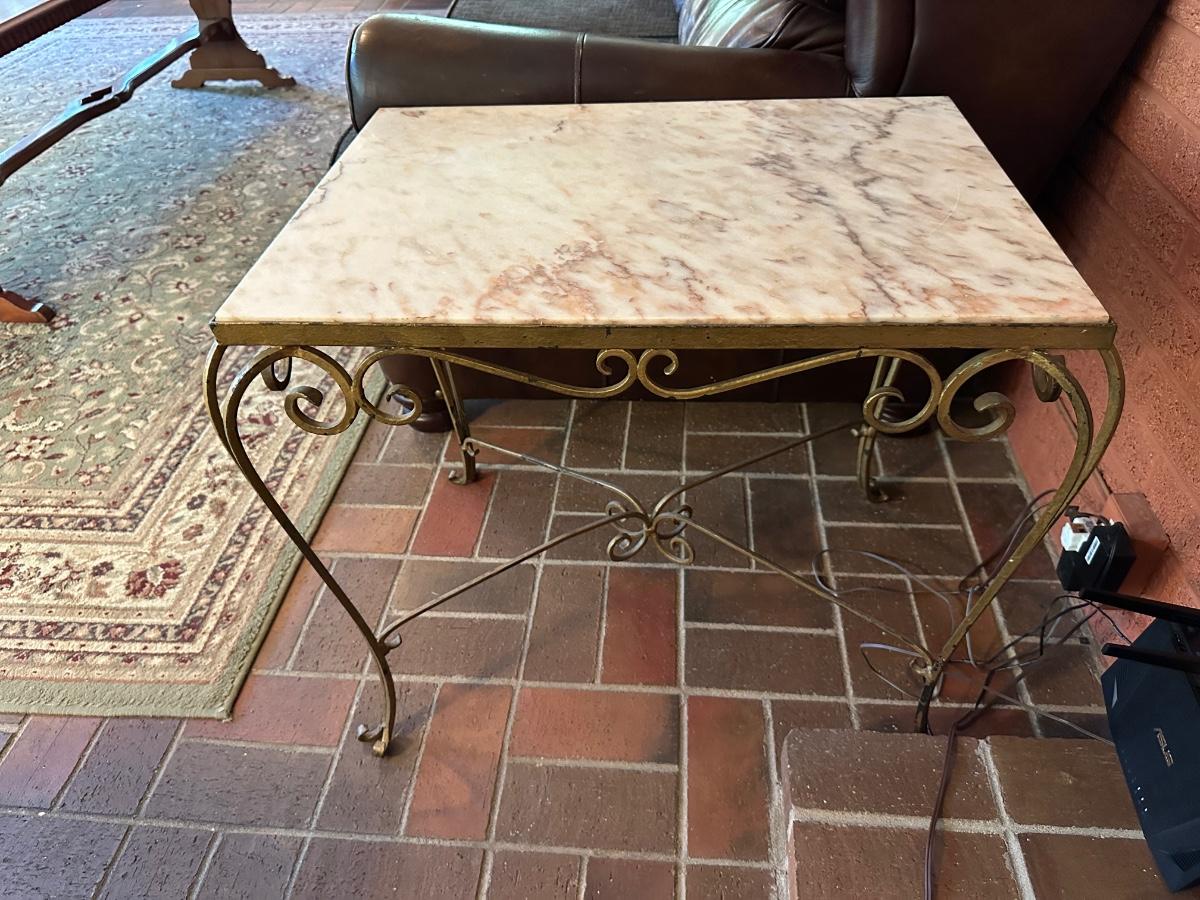 IRON BASE, MARBLE TOP END TABLE AND A TABLE LAMP