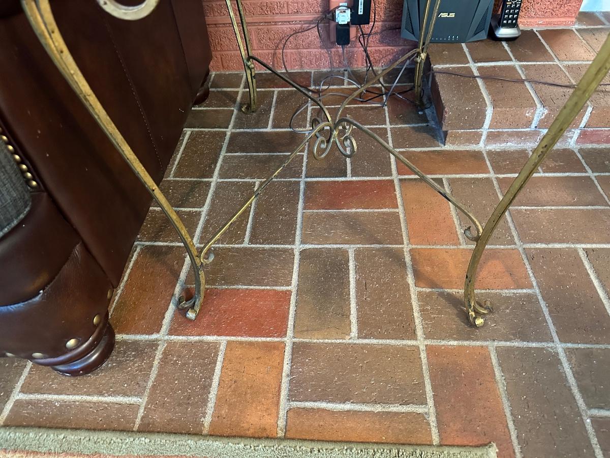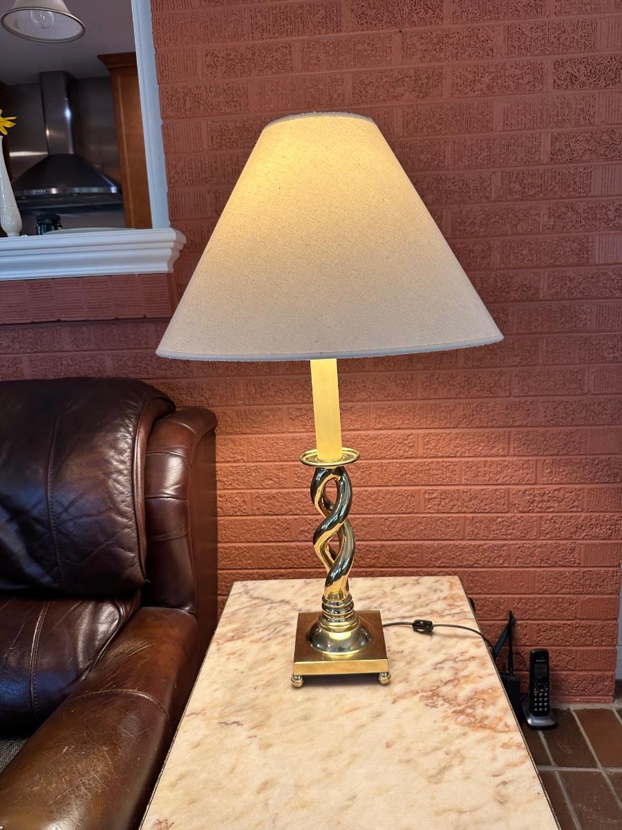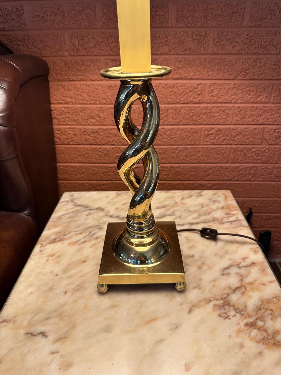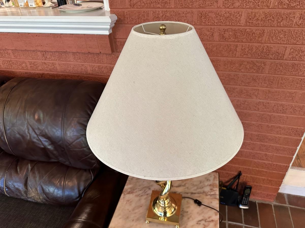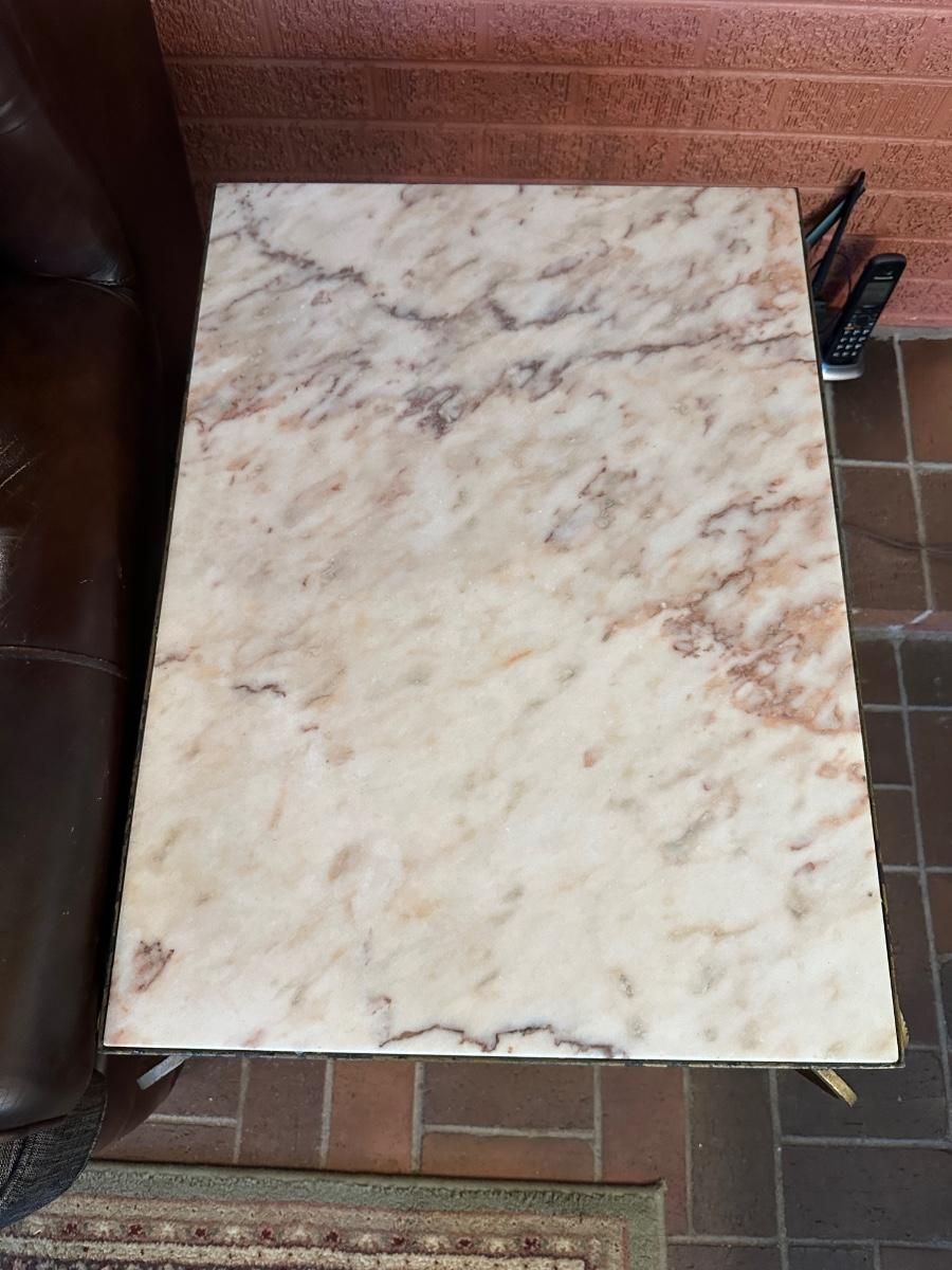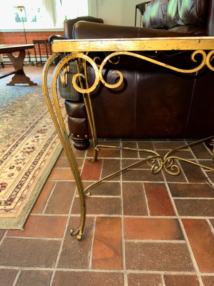IRON BASE, MARBLE TOP END TABLE AND A TABLE LAMP