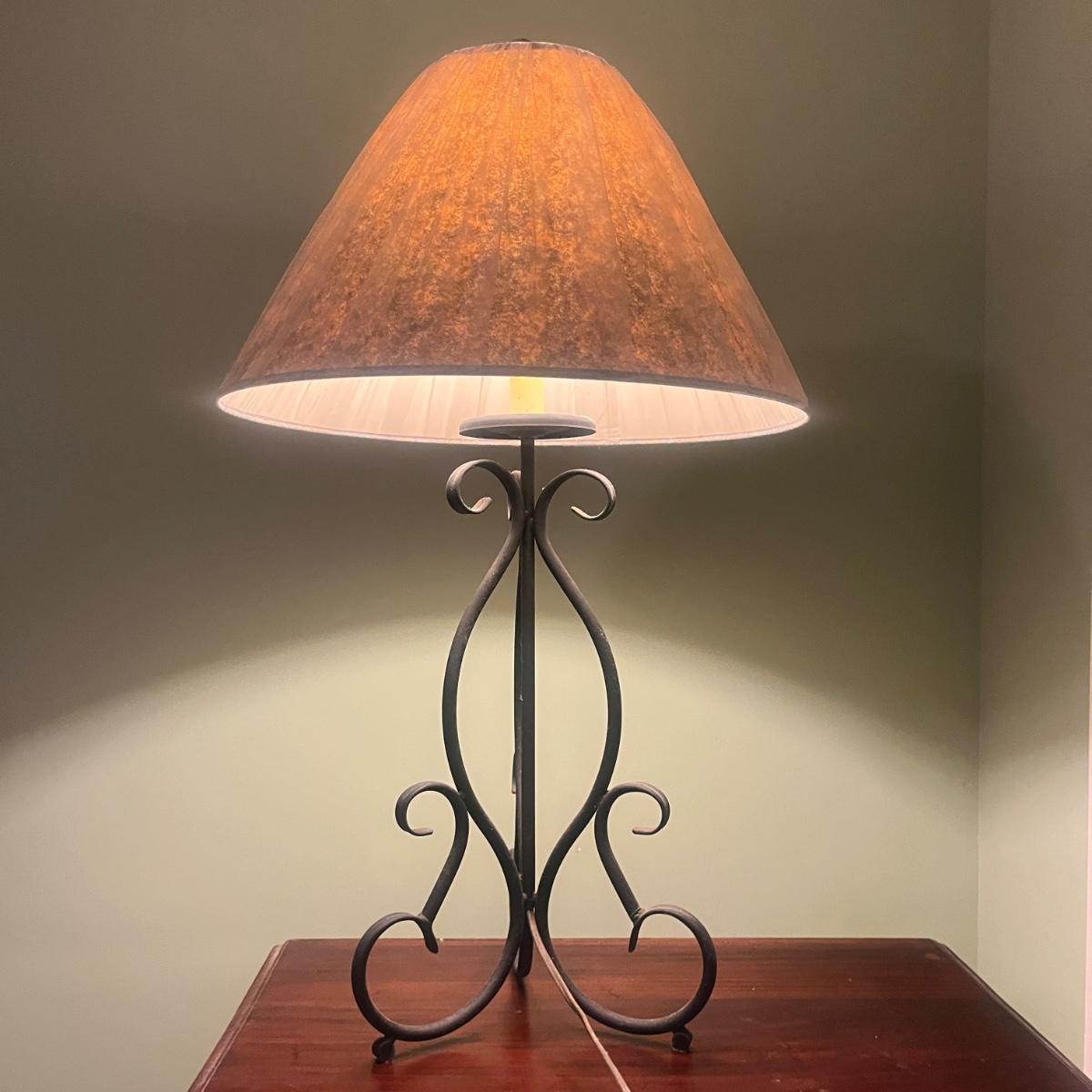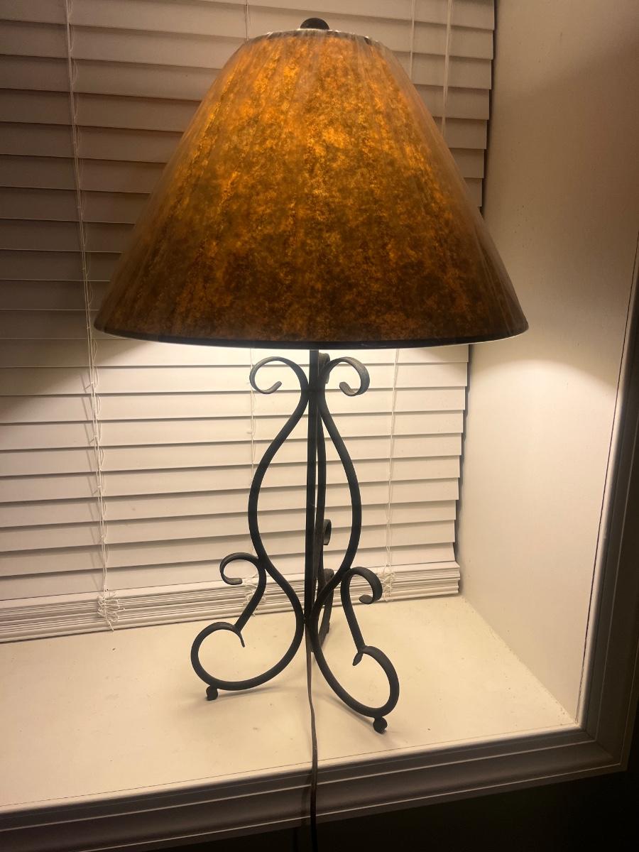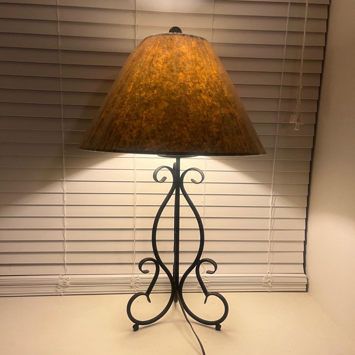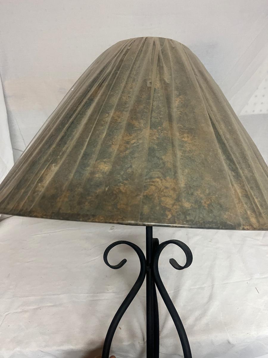 This table lamp has an iron base and measures 20”D x 35”H including shade, whichbis decorative paper. Light has 3-way switch.