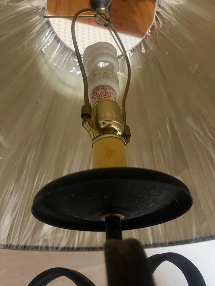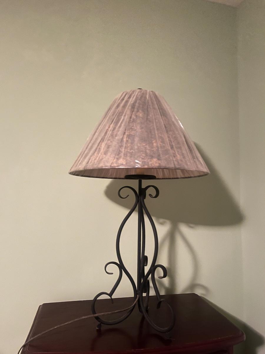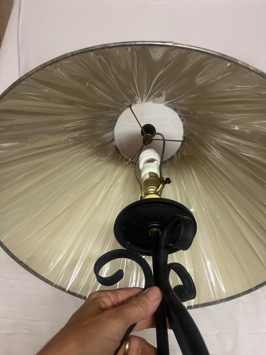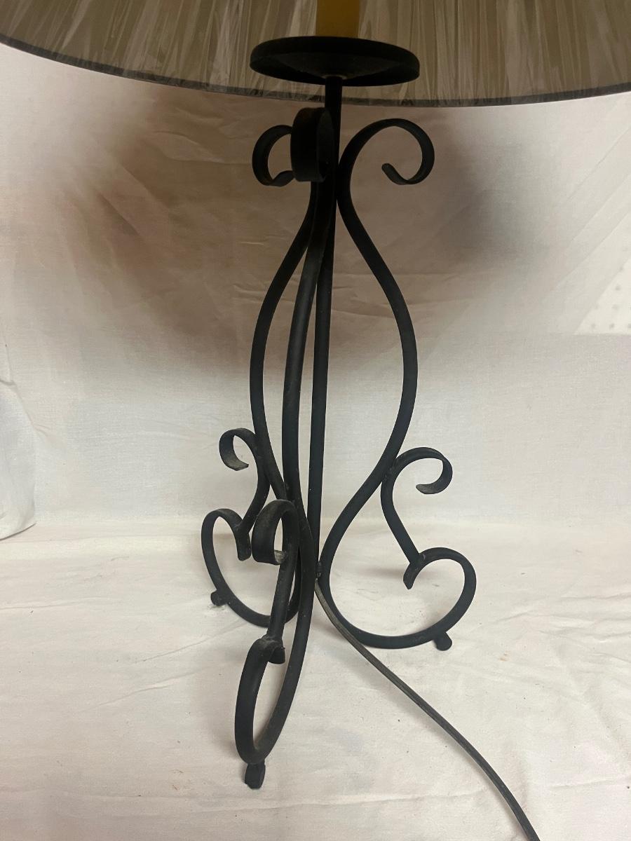This table lamp has an iron base and measures 20”D x 35”H including shade, whichbis decorative paper. Light has 3-way switch.