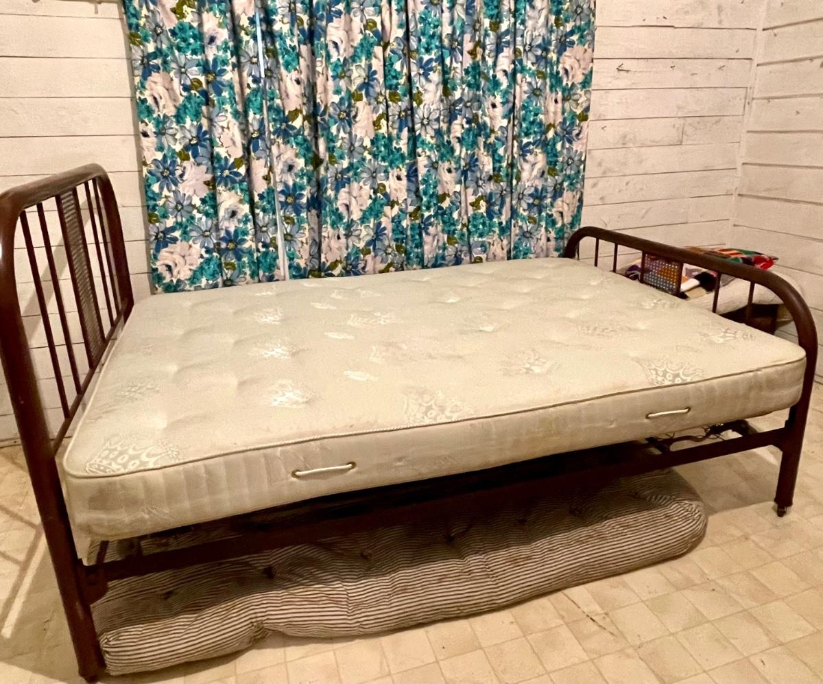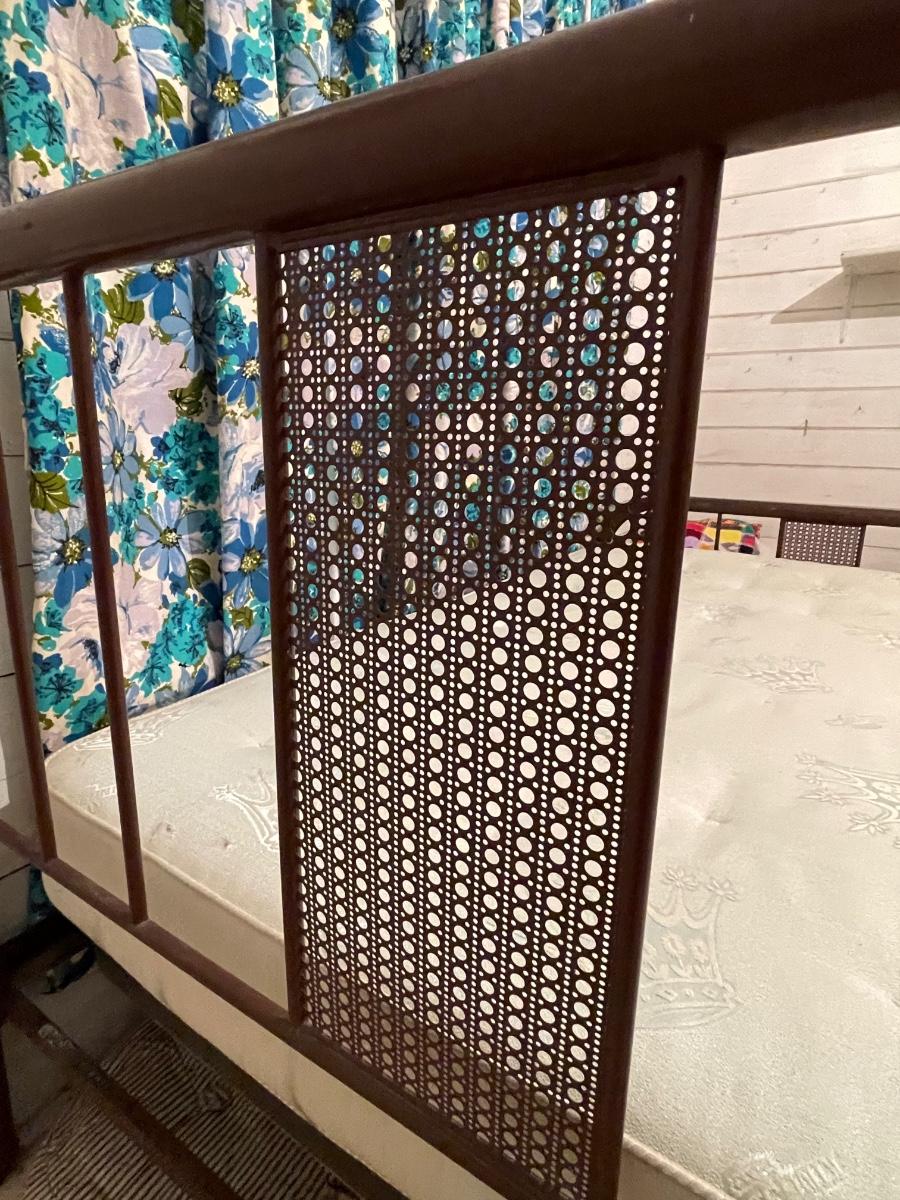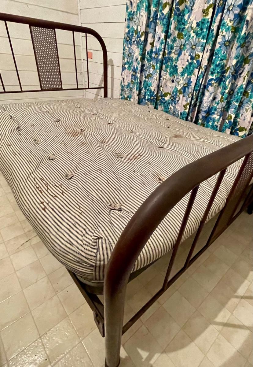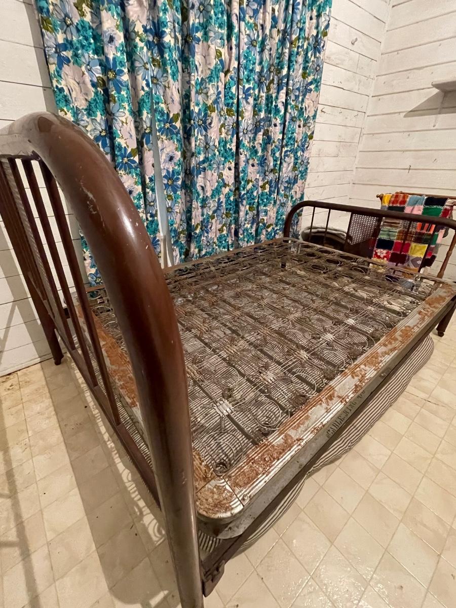 This is a nice old bed. It had 2 mattresses on it. Mattresses are optional. Would make a nice addition to a vintage space. Double bed with the metal springs. Could be a great display in a shop for all of your linens, spreads, afghans and towels.