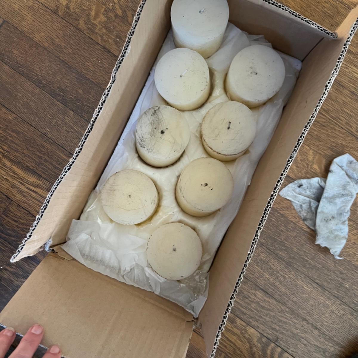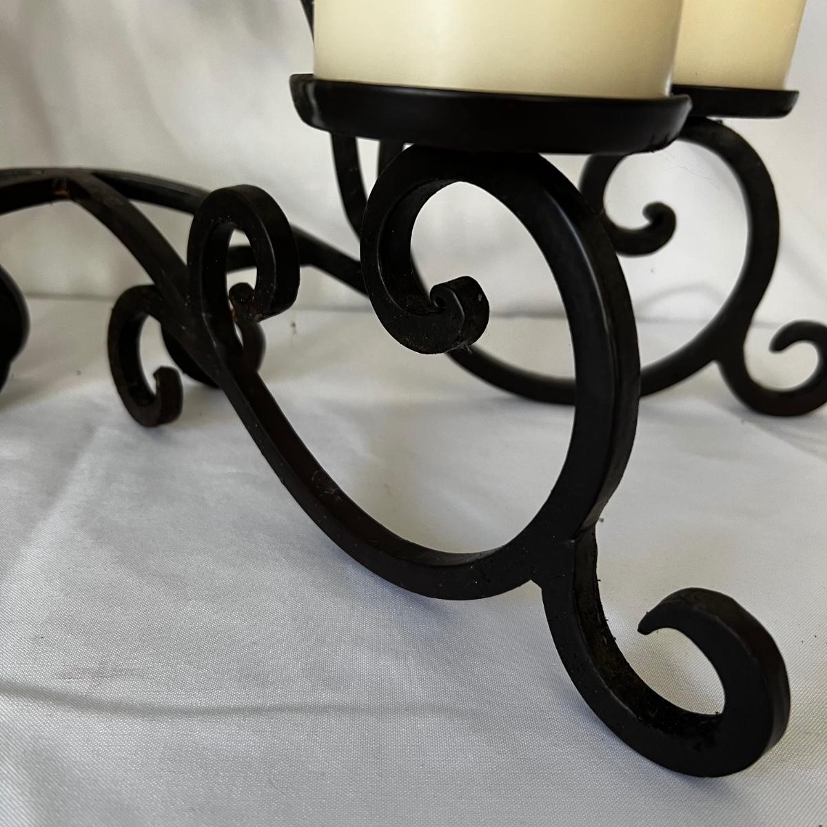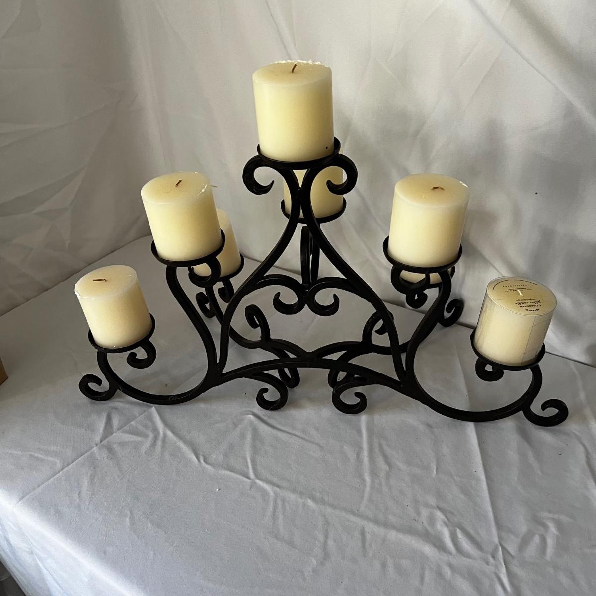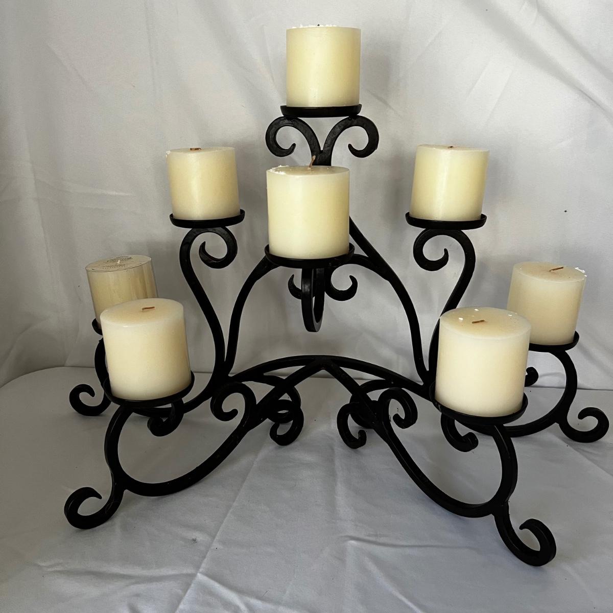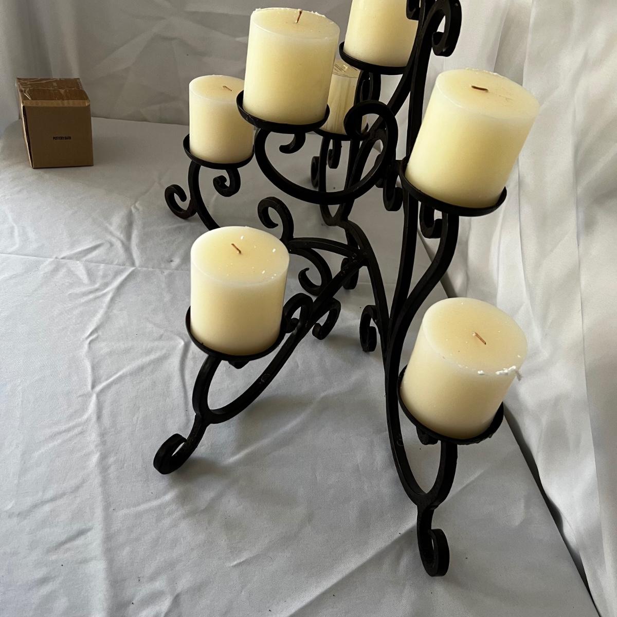 This sturdy metal candle holder has a black finish and holds eight candles. An additional nine replacement candles are included. Note that although none of the candles have been used, the eight in the box are dirty with what looks like soot from a fireplace. One additional candle is new in box from Pottery Barn.