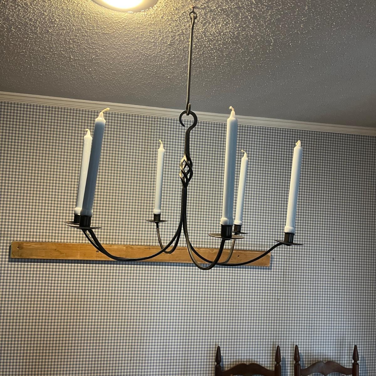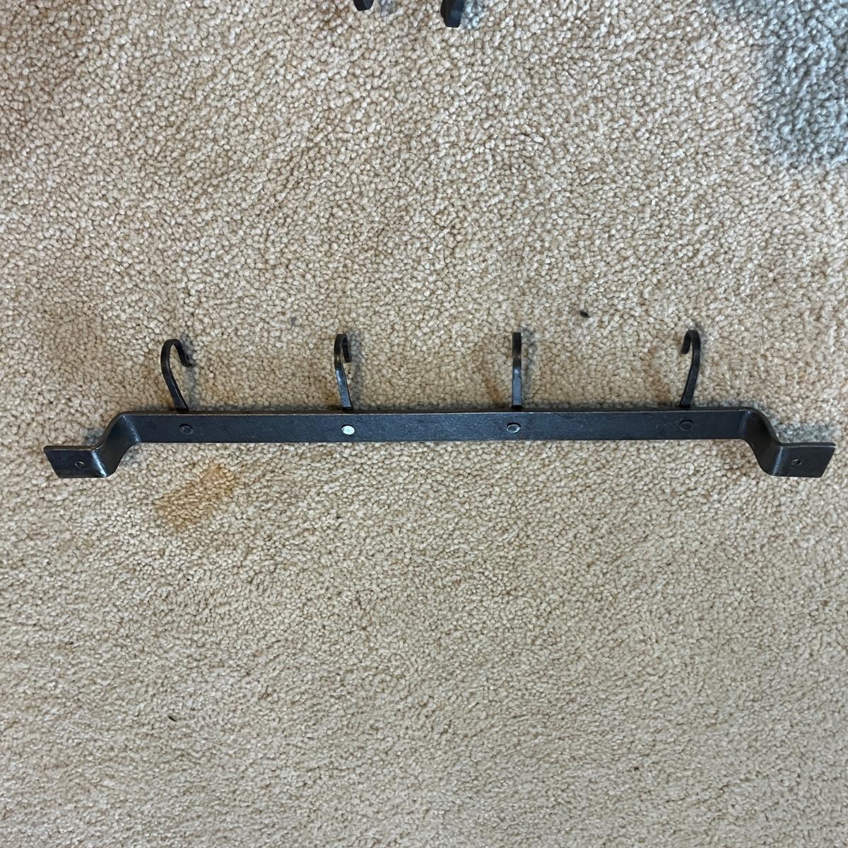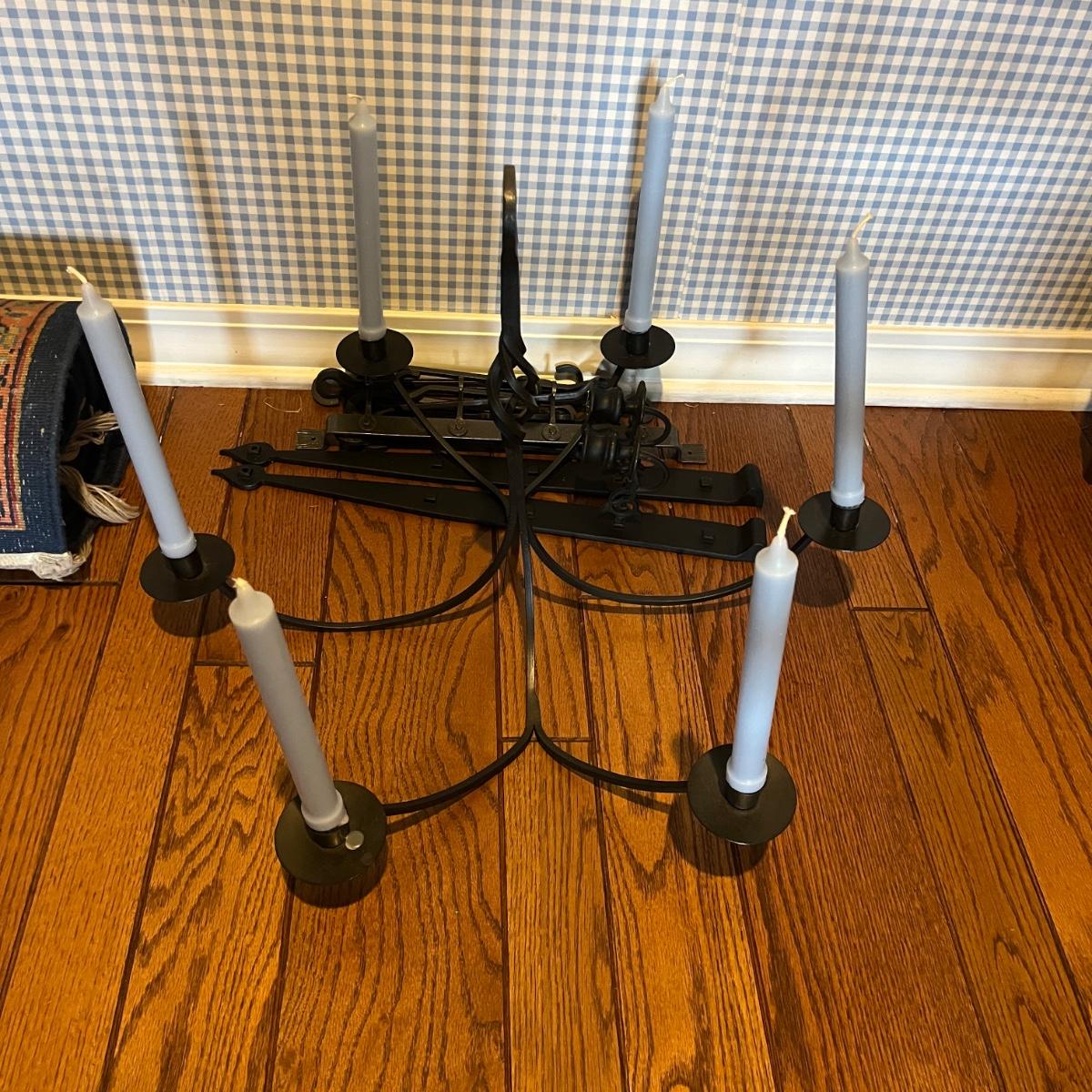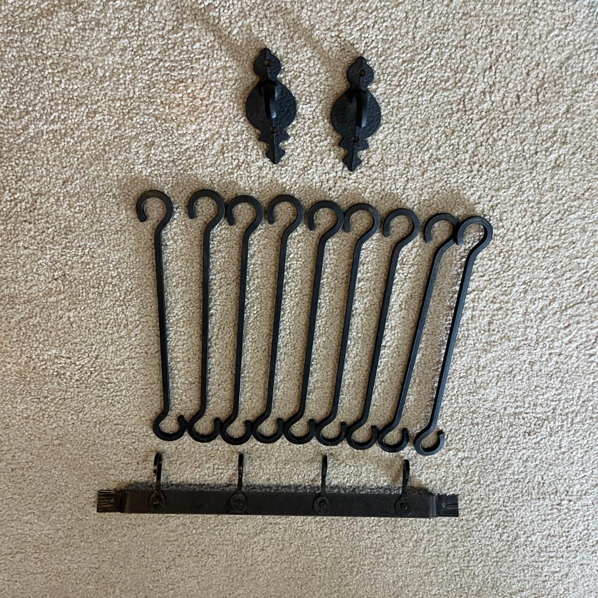 Lot contains an iron chandelier with six candles, two iron candleholders, nine iron hooks, and a wall mount four hook rack. Chandelier measures 26”D x 17”H and candleholders measure 1.75” x 5” x 21.5”H.