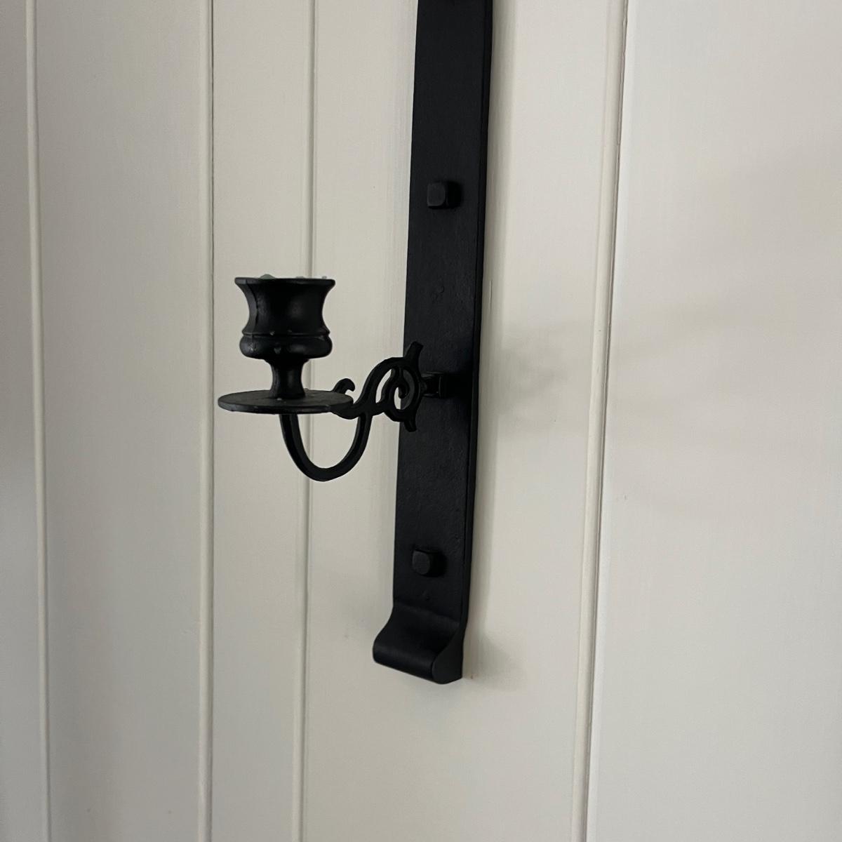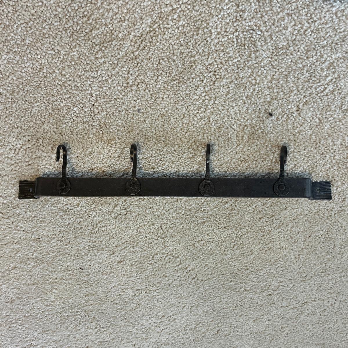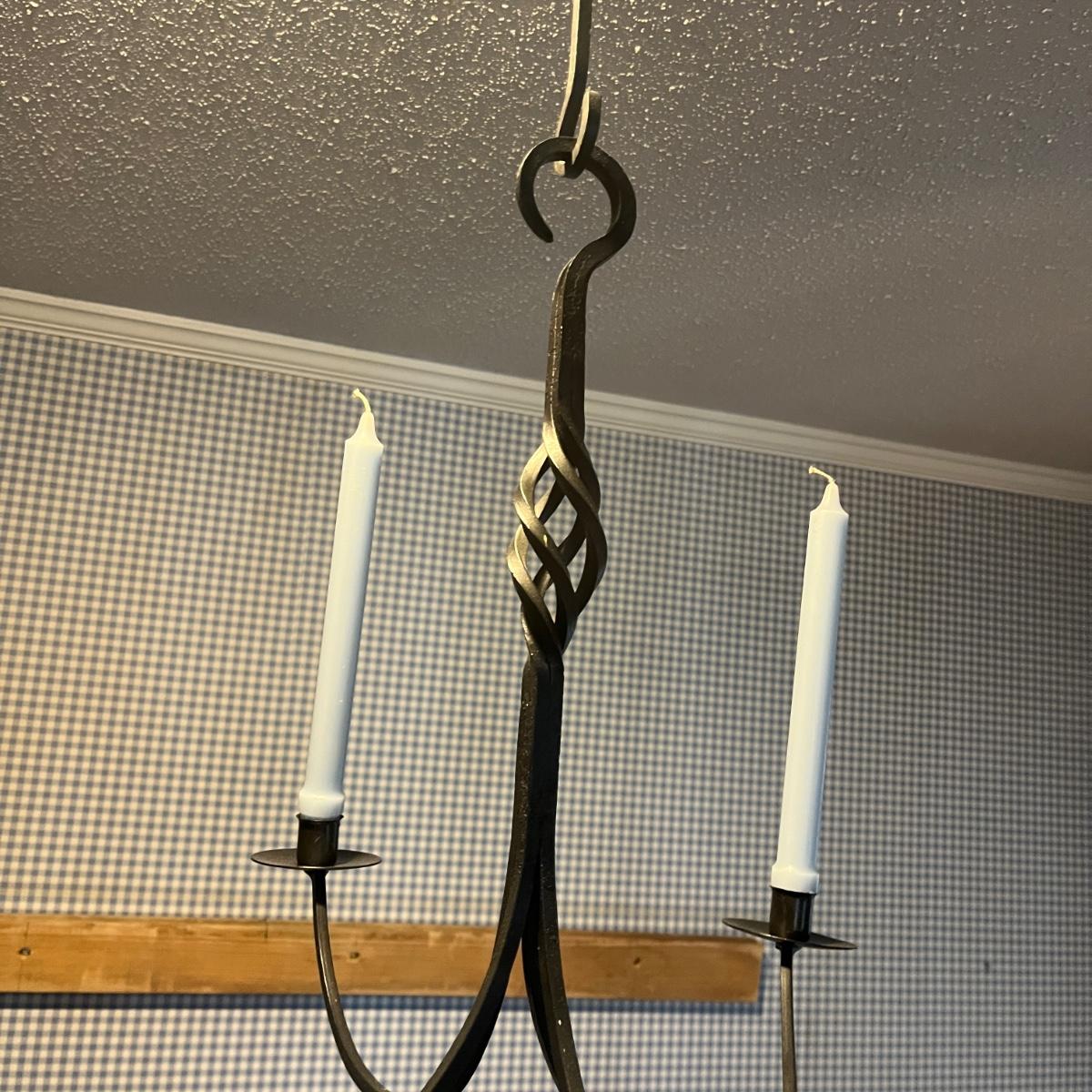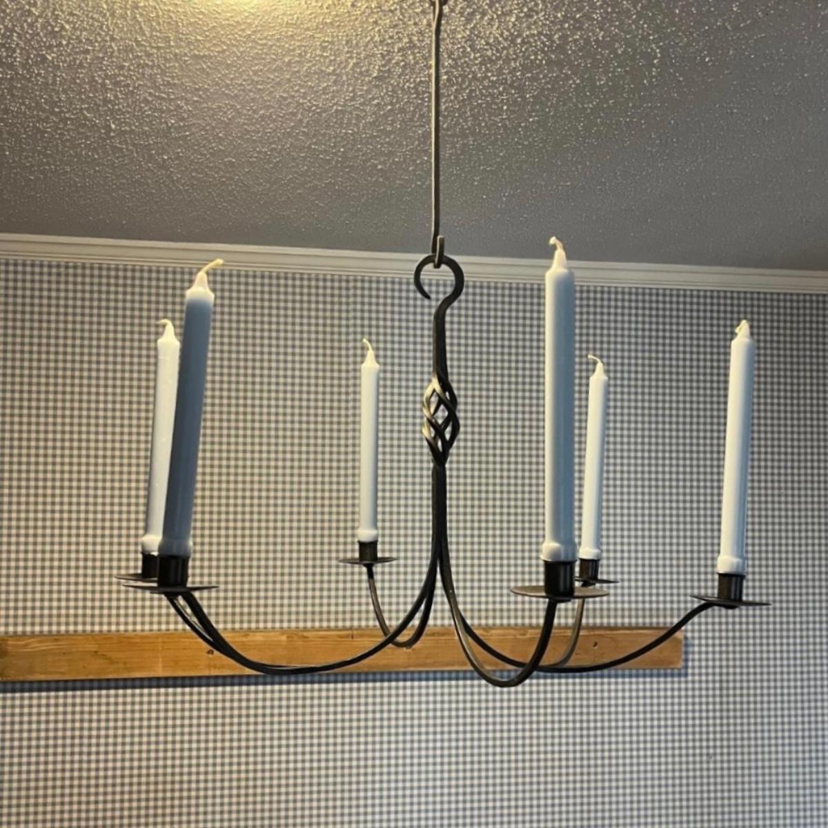 Lot contains an iron chandelier with six candles, two iron candleholders, nine iron hooks, and a wall mount four hook rack. Chandelier measures 26”D x 17”H and candleholders measure 1.75” x 5” x 21.5”H.