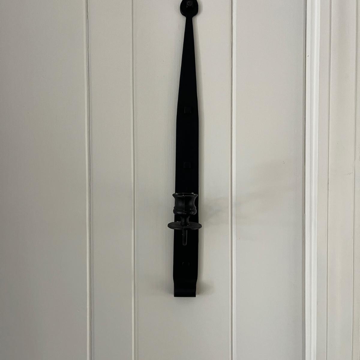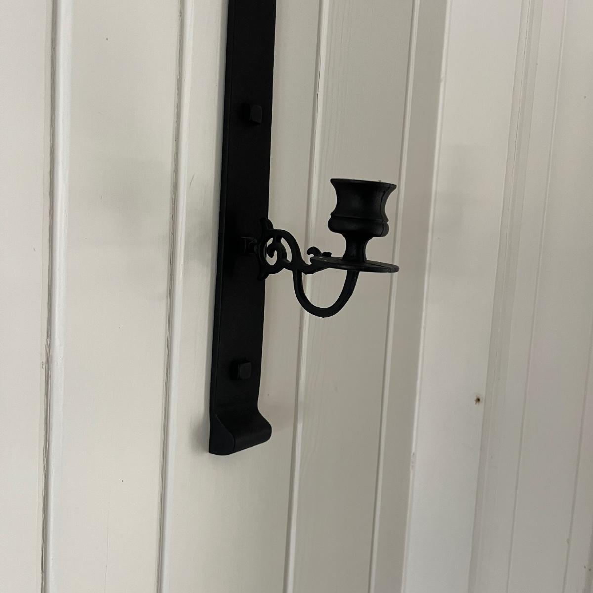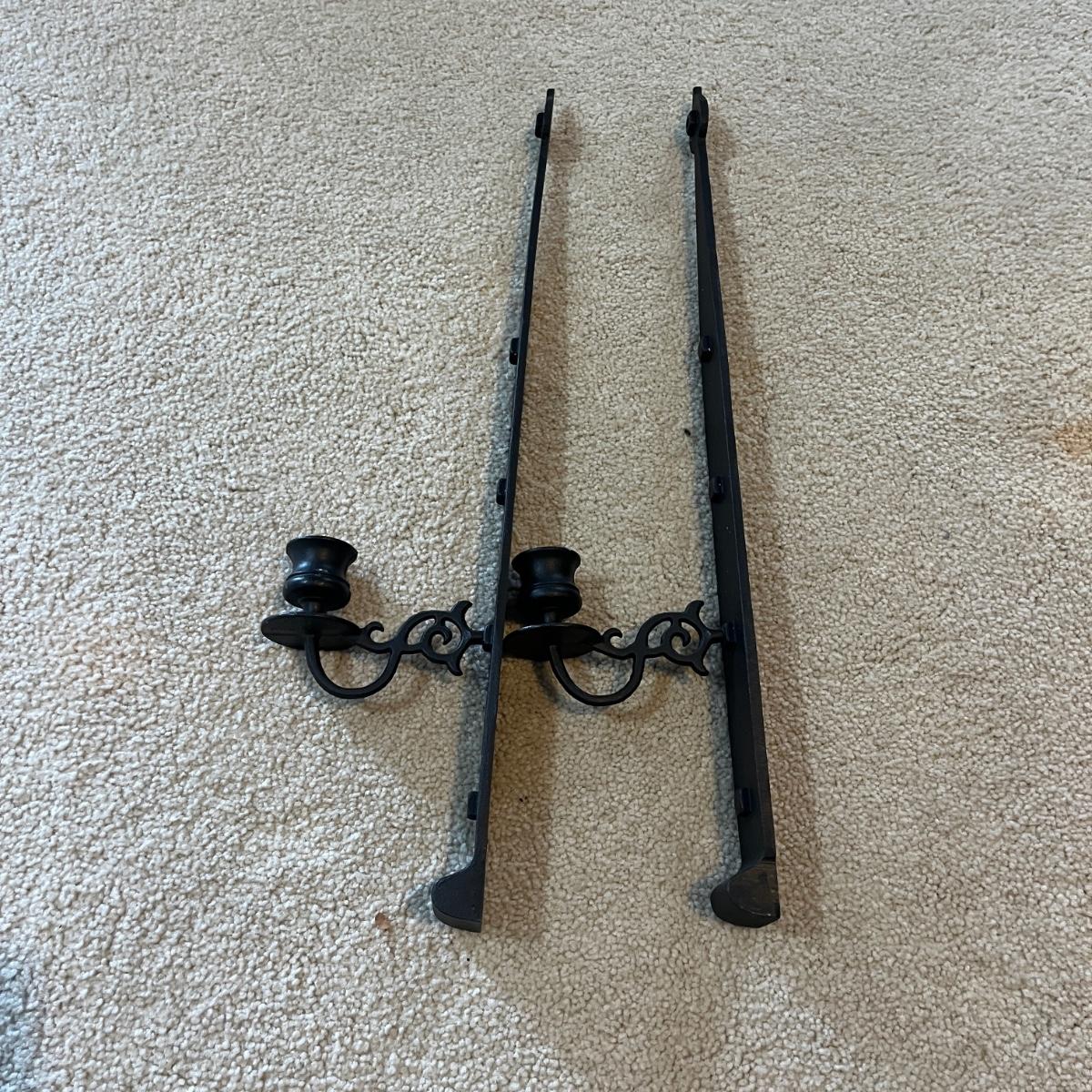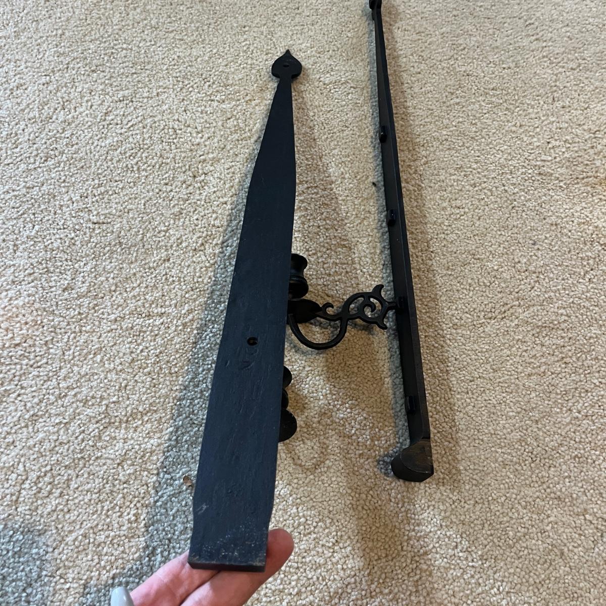 Lot contains an iron chandelier with six candles, two iron candleholders, nine iron hooks, and a wall mount four hook rack. Chandelier measures 26”D x 17”H and candleholders measure 1.75” x 5” x 21.5”H.