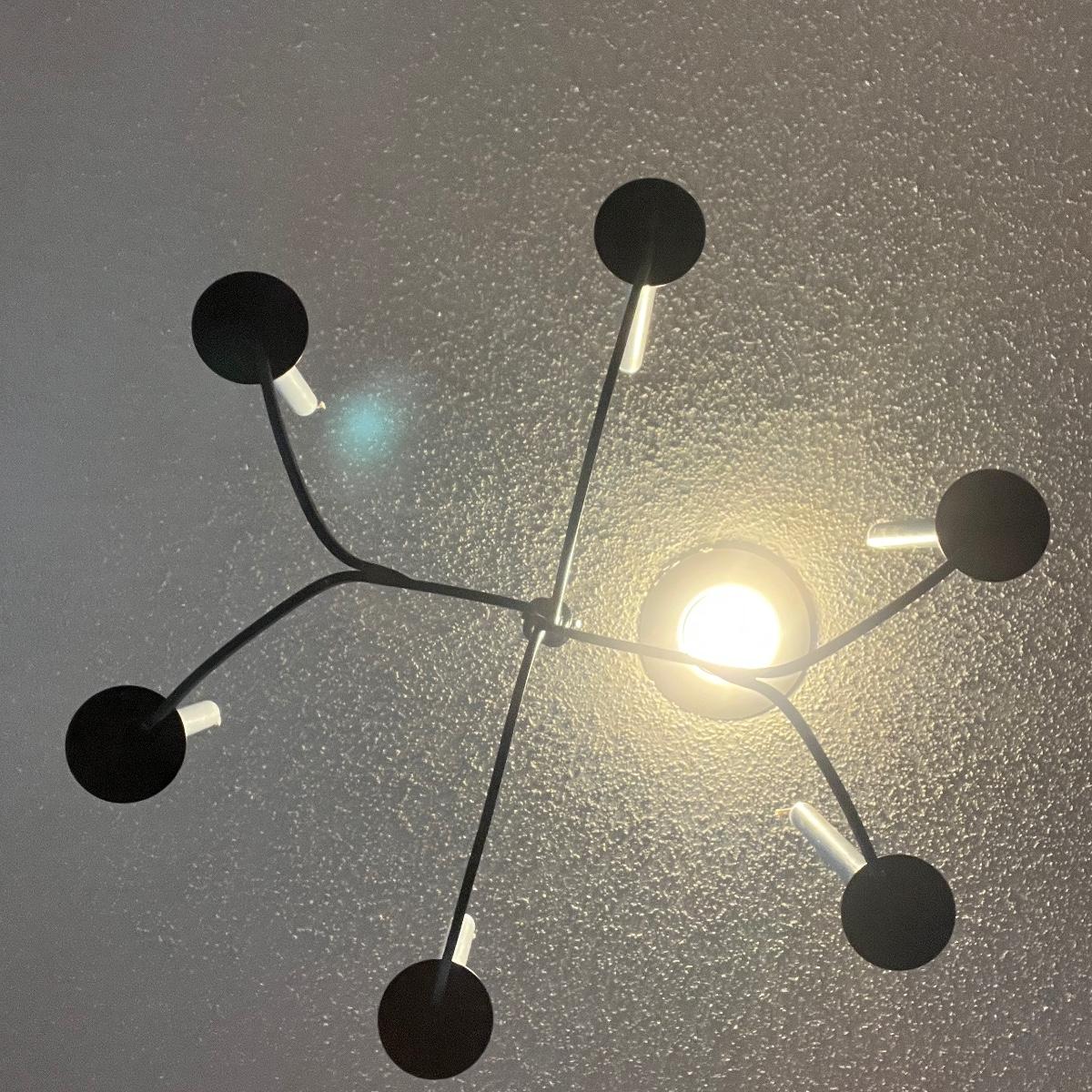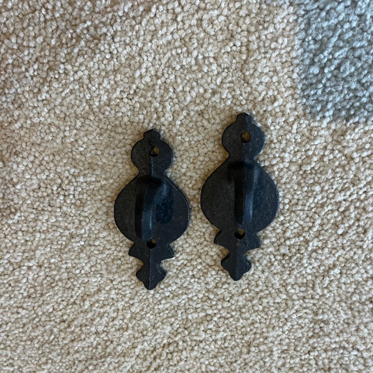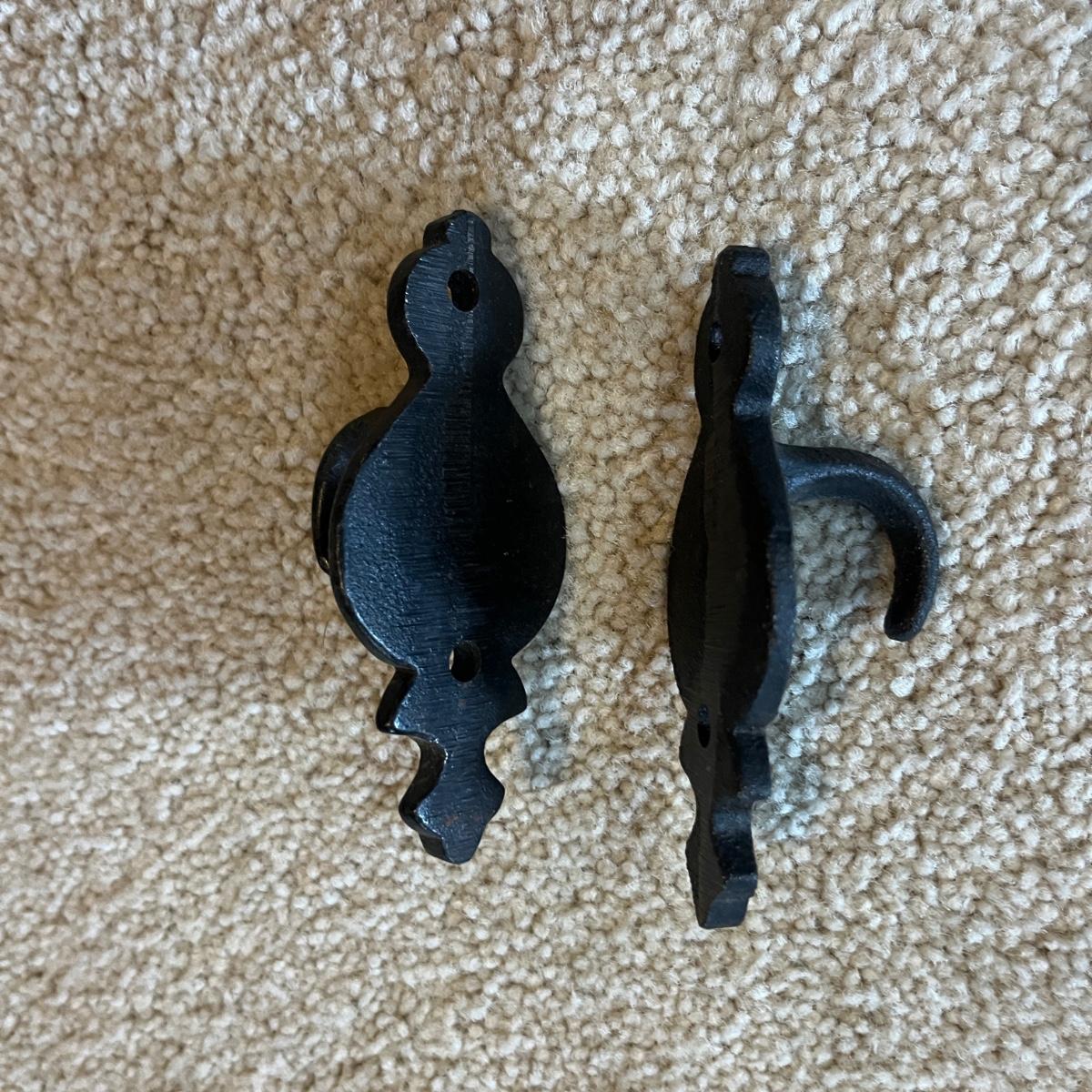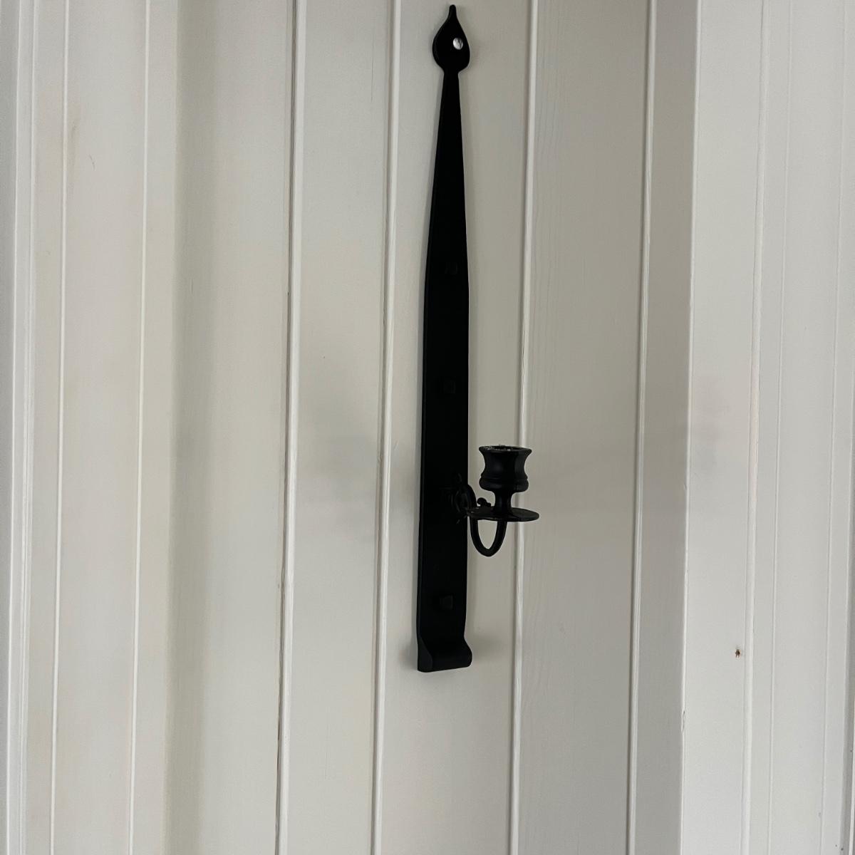 Lot contains an iron chandelier with six candles, two iron candleholders, nine iron hooks, and a wall mount four hook rack. Chandelier measures 26”D x 17”H and candleholders measure 1.75” x 5” x 21.5”H.