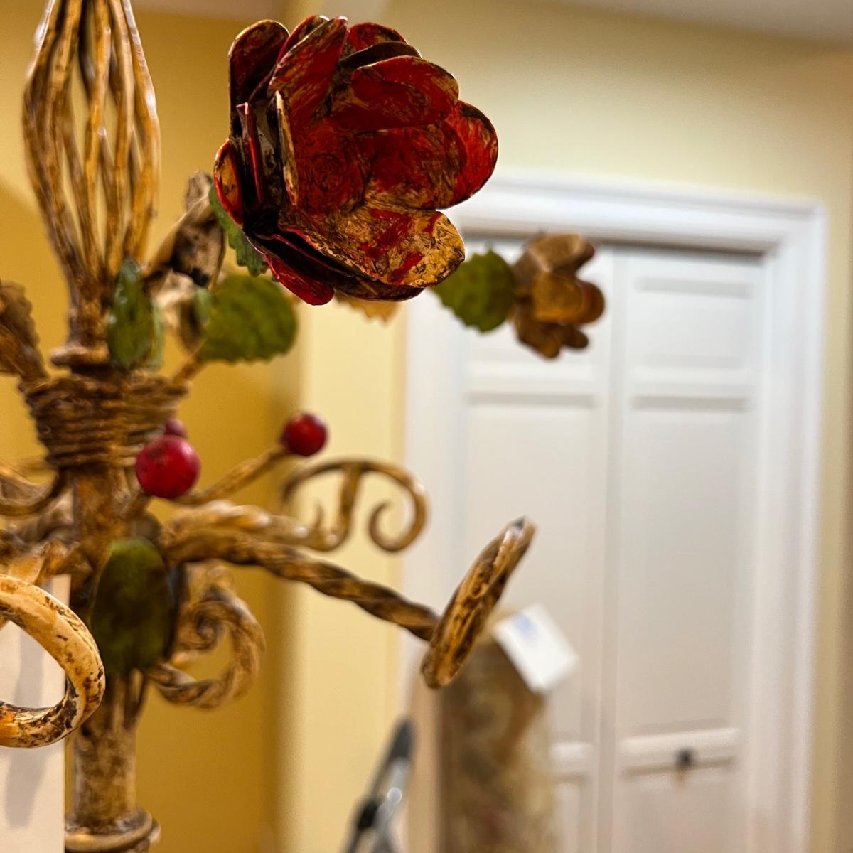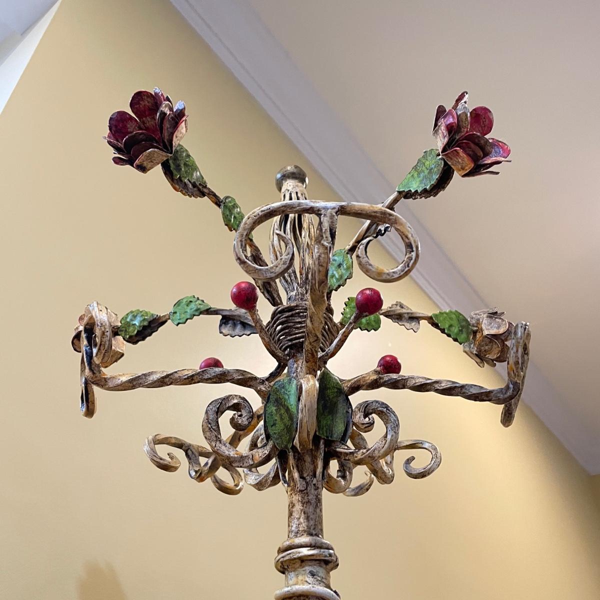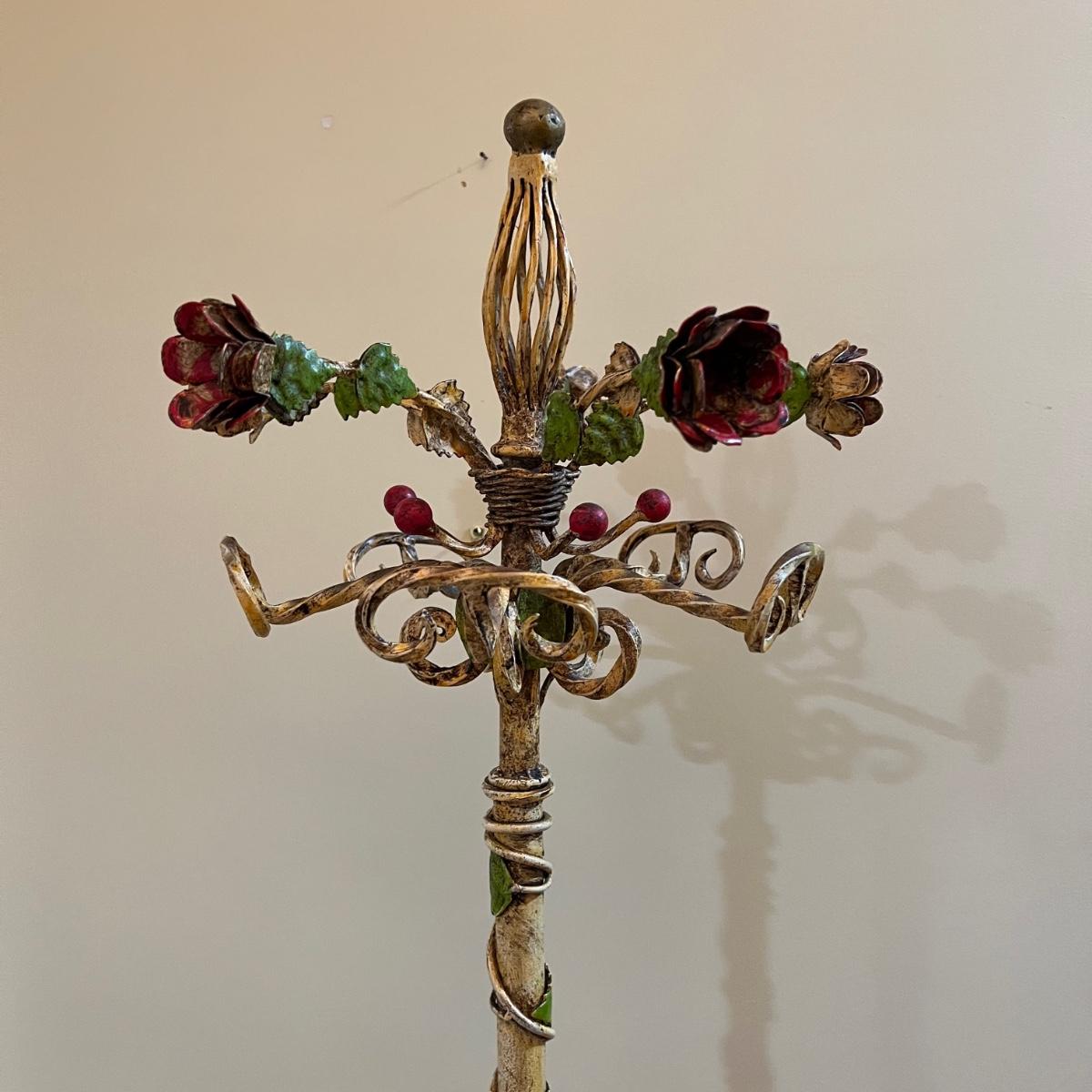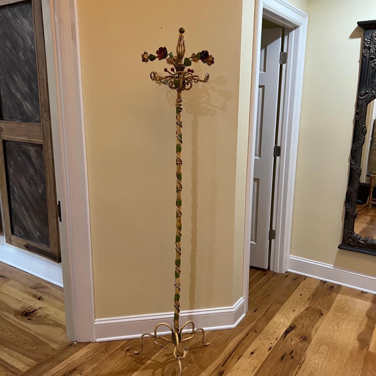 Iron metal coat rack decorated in rose shapes and painted gold. This piece measures 14.5” square x 6’1” H.