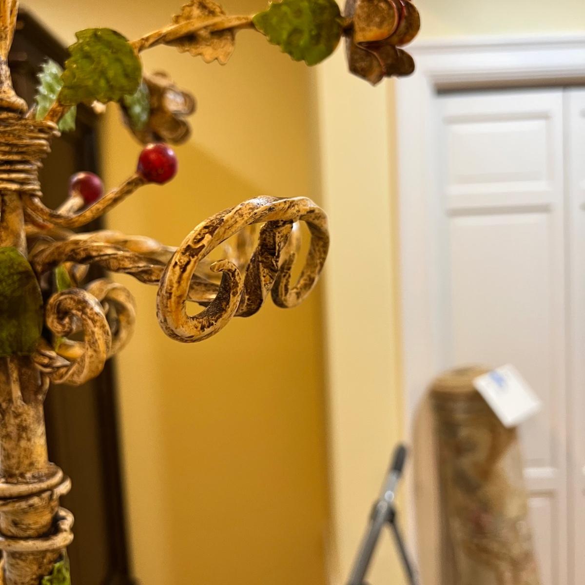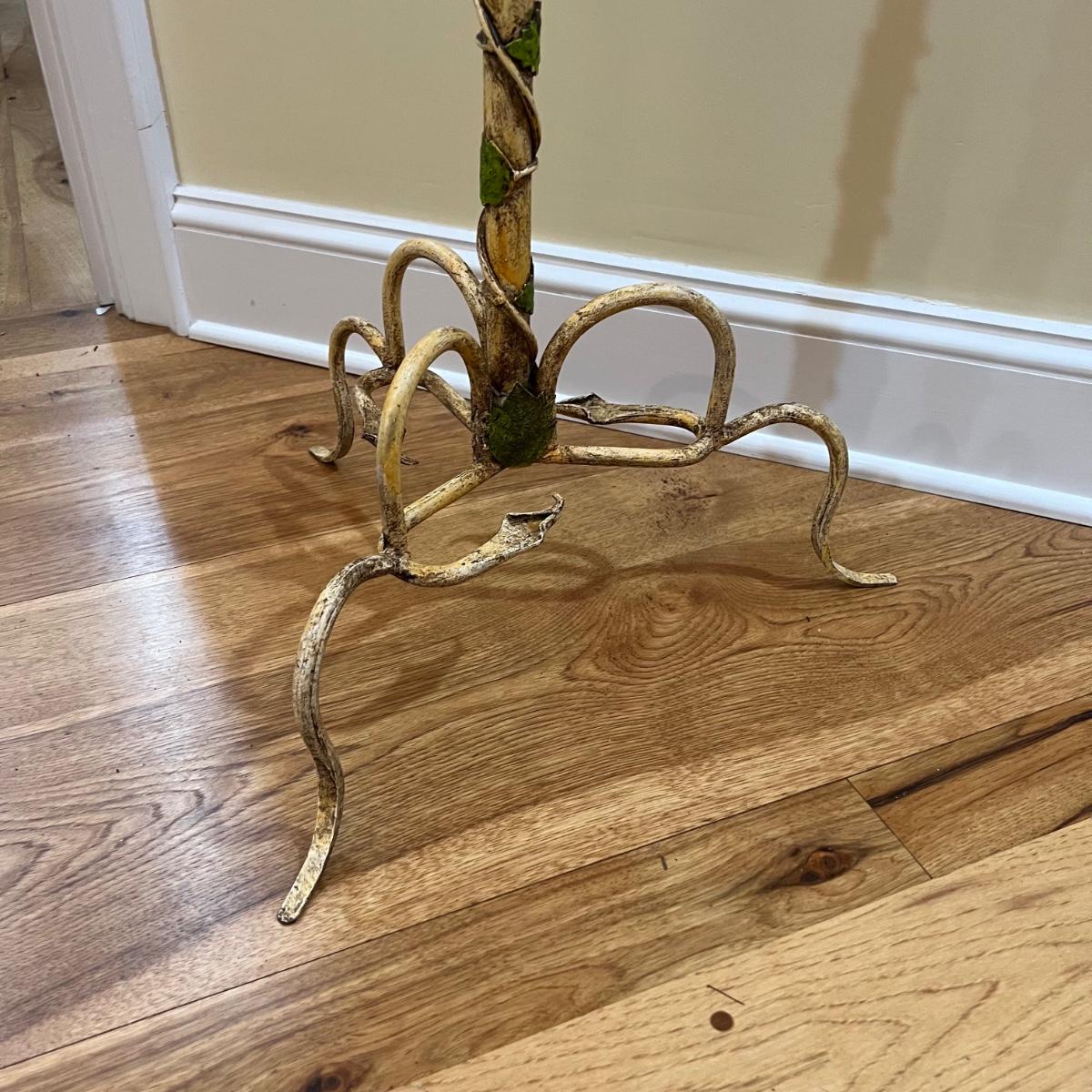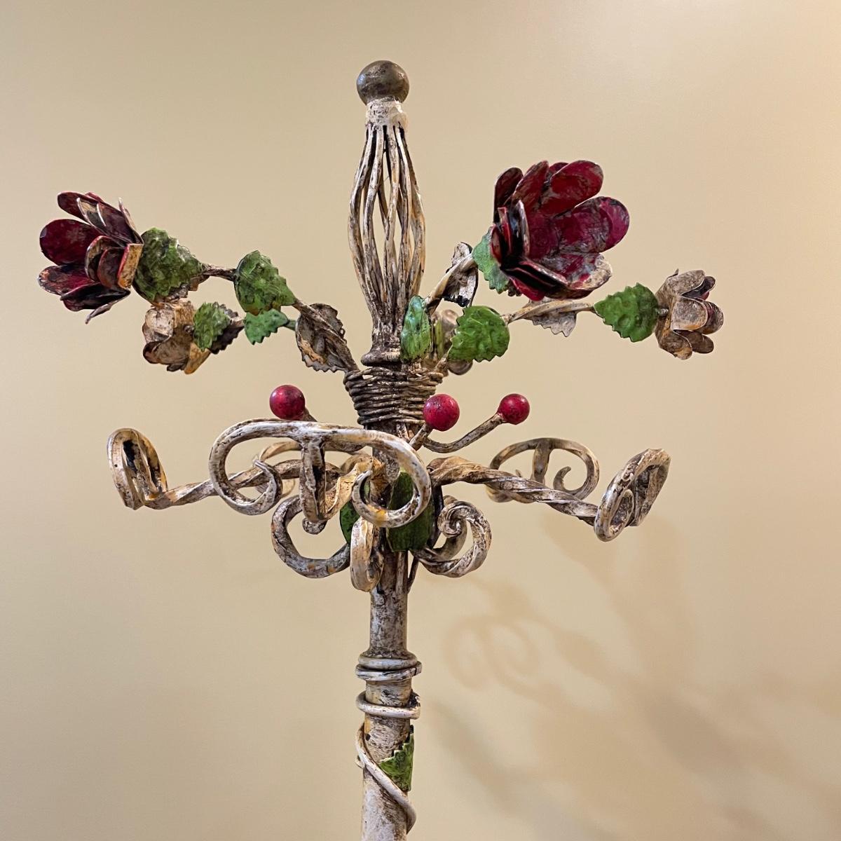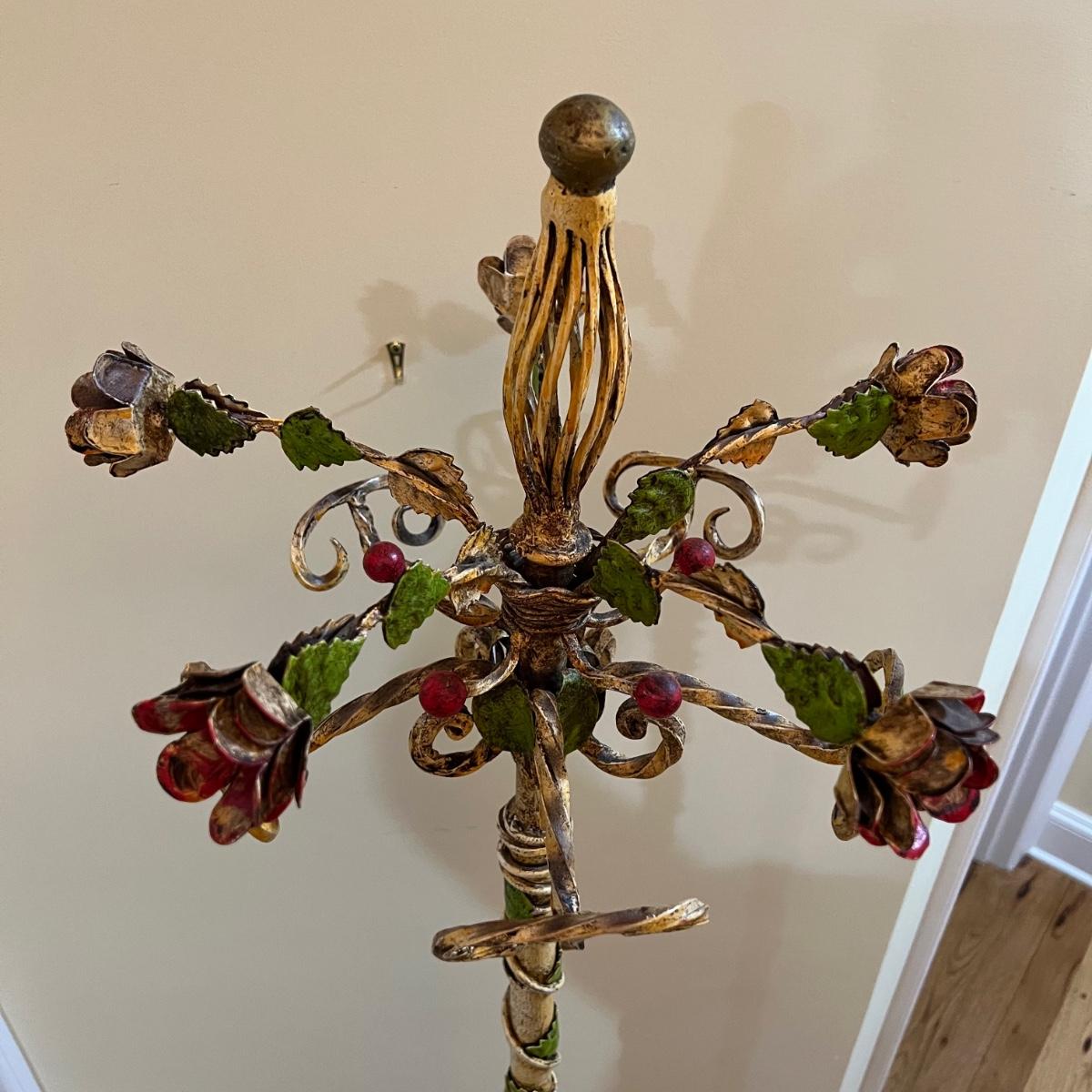 Iron metal coat rack decorated in rose shapes and painted gold. This piece measures 14.5” square x 6’1” H.