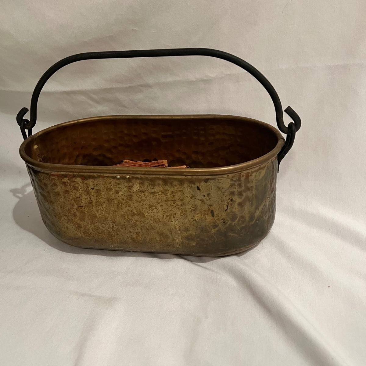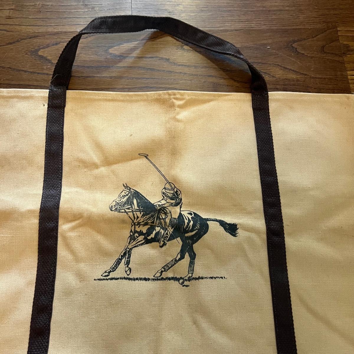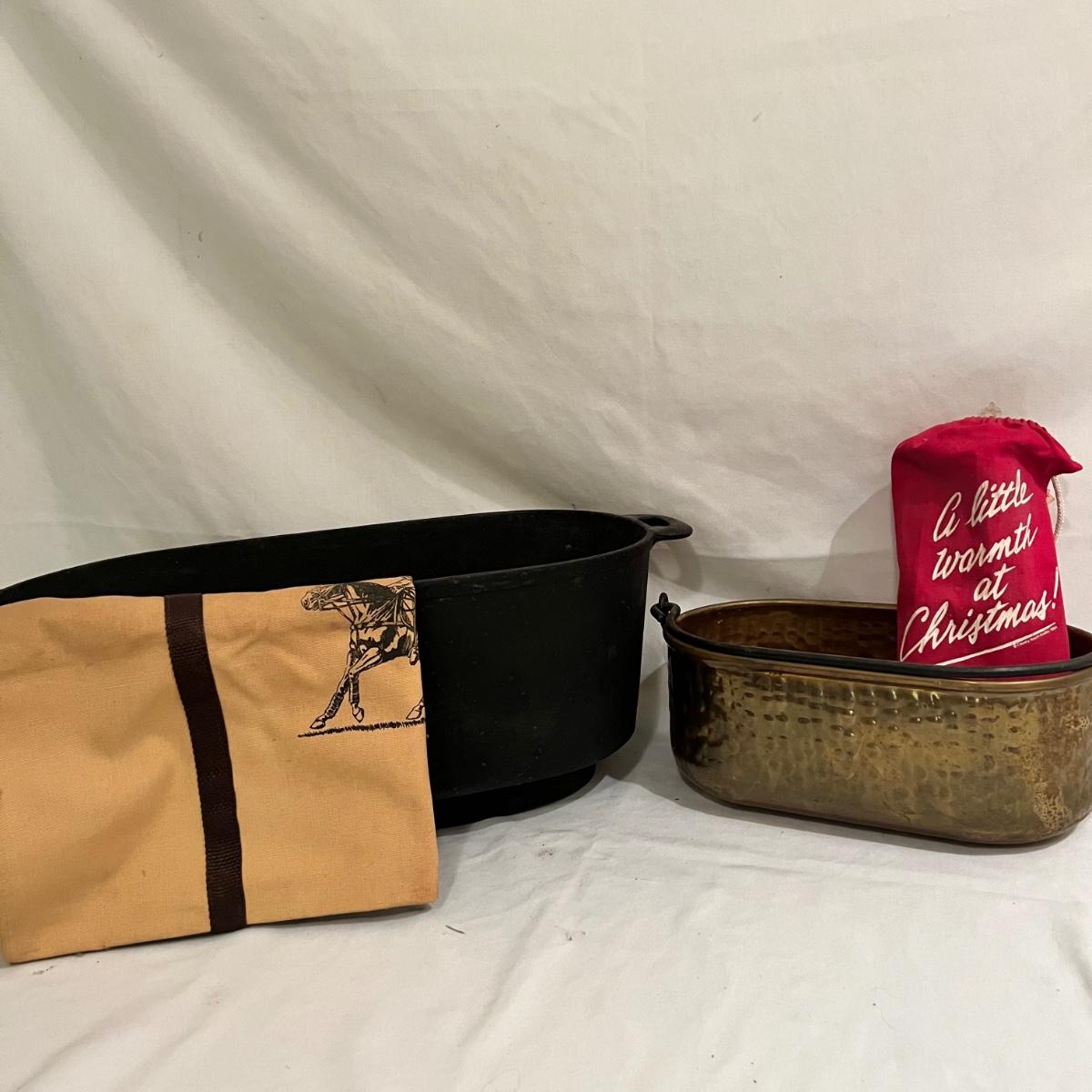 A large oval iron firewood holder with handles measures 25” x 10.5” x 9”H. The smaller oval copper colored wood holder measures 13.5” x 8” x 5.25”H. This holder is filled with what appears to be Fatwood Sticks. Also there is an extra bag with more fatwood sticks. Also, a polo character adorns a canvas wood carrier.