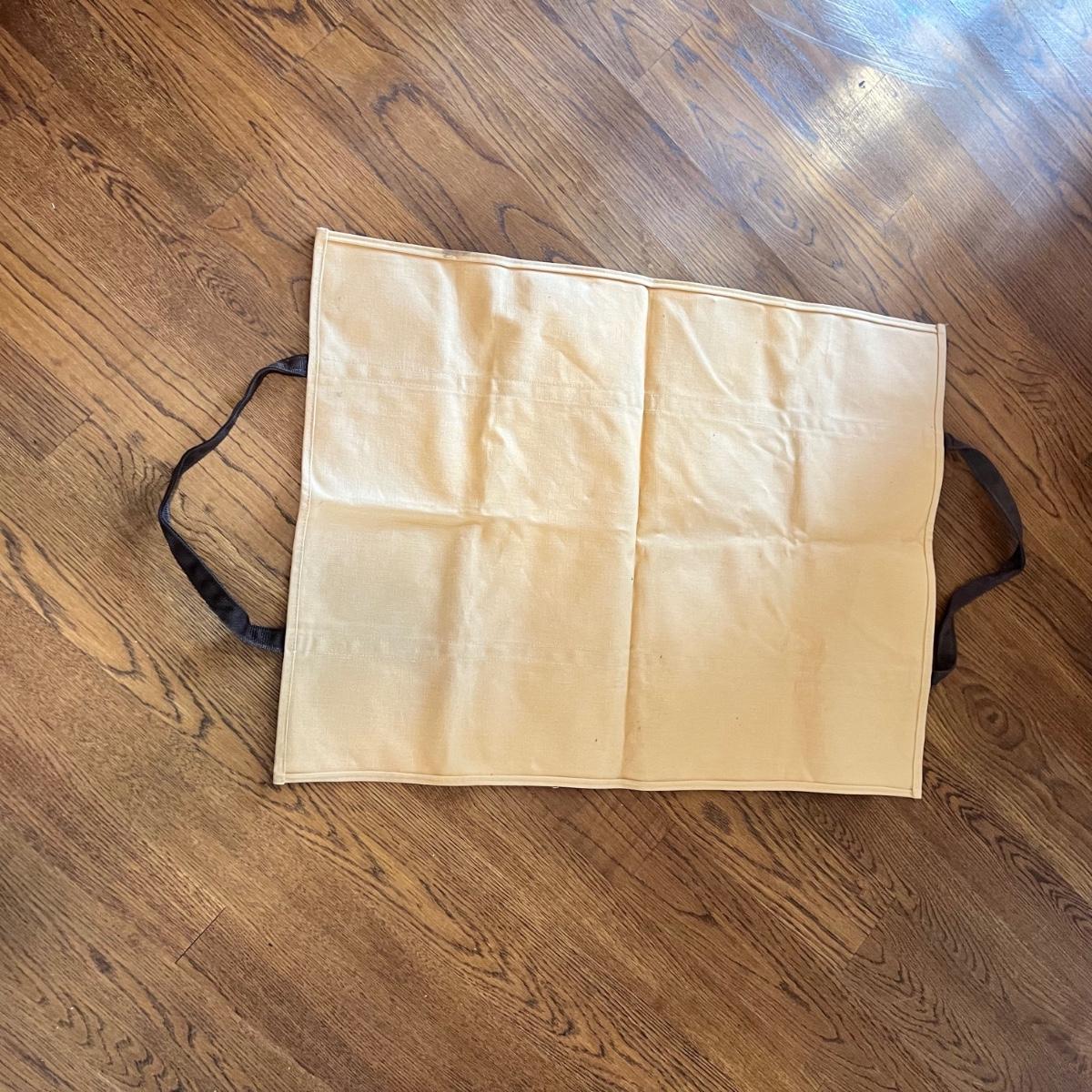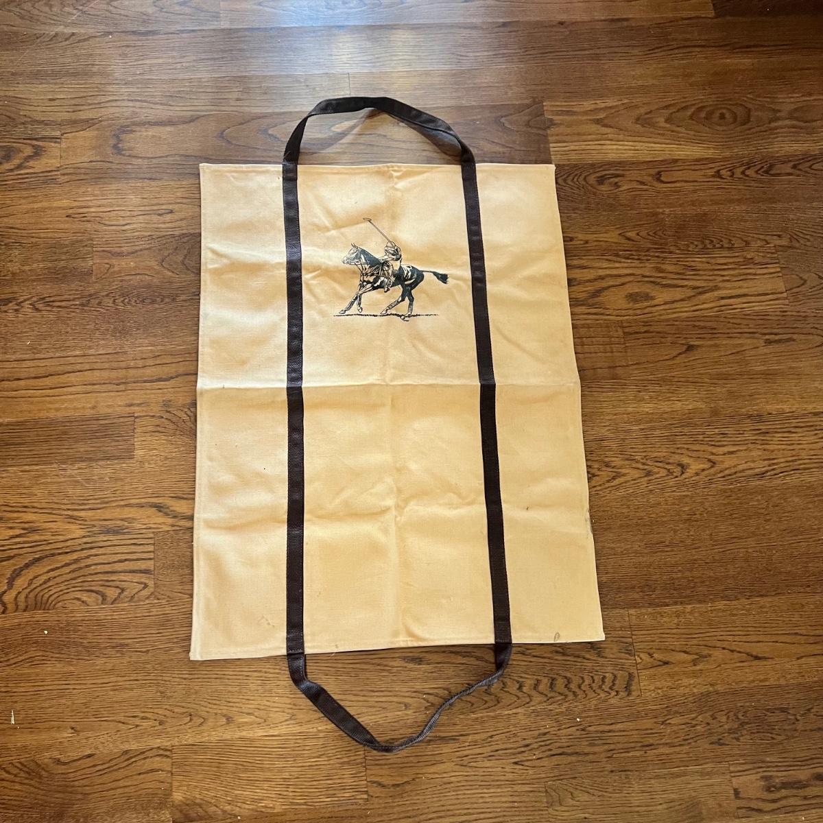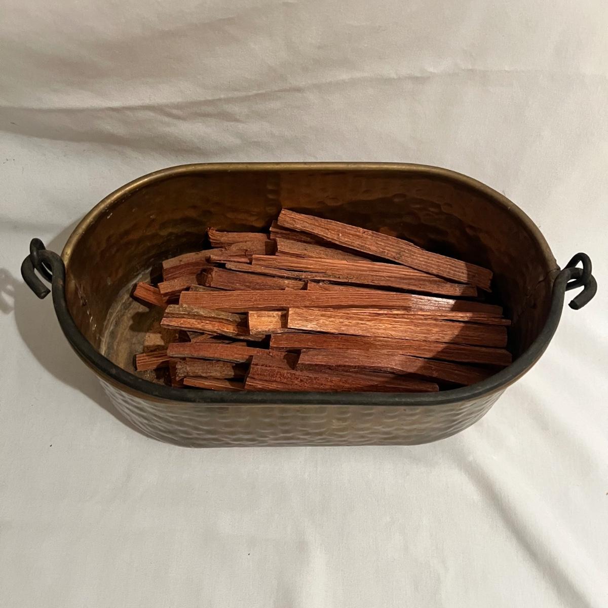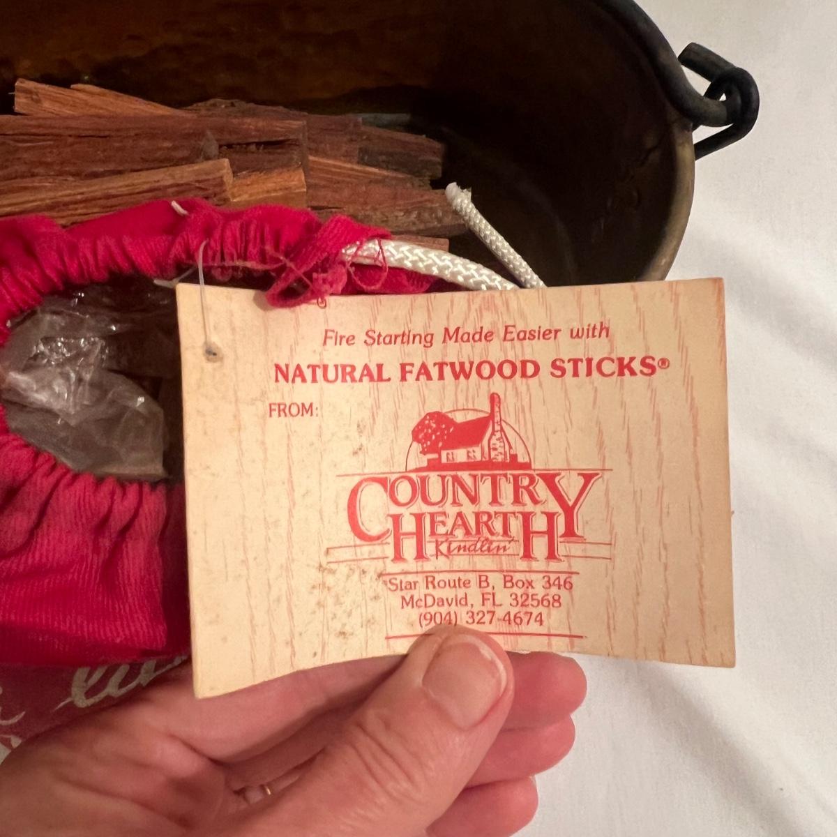 A large oval iron firewood holder with handles measures 25” x 10.5” x 9”H. The smaller oval copper colored wood holder measures 13.5” x 8” x 5.25”H. This holder is filled with what appears to be Fatwood Sticks. Also there is an extra bag with more fatwood sticks. Also, a polo character adorns a canvas wood carrier.