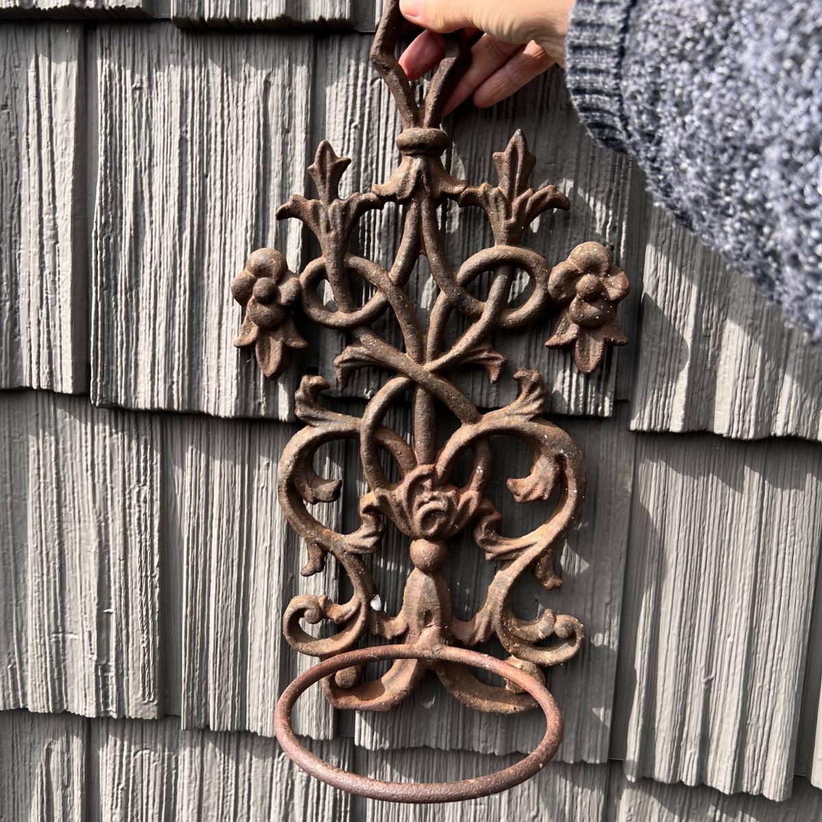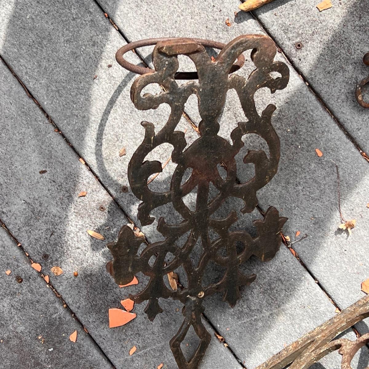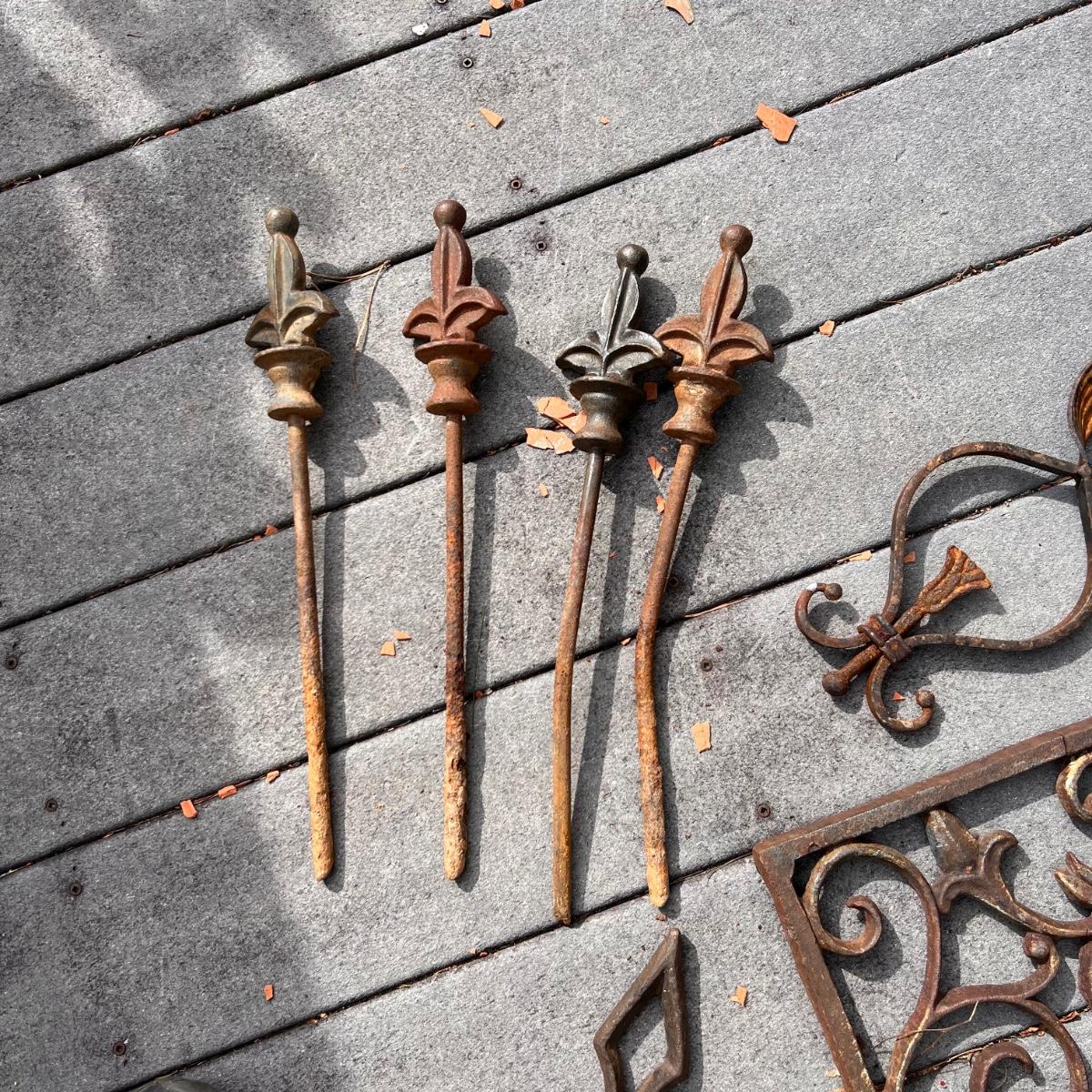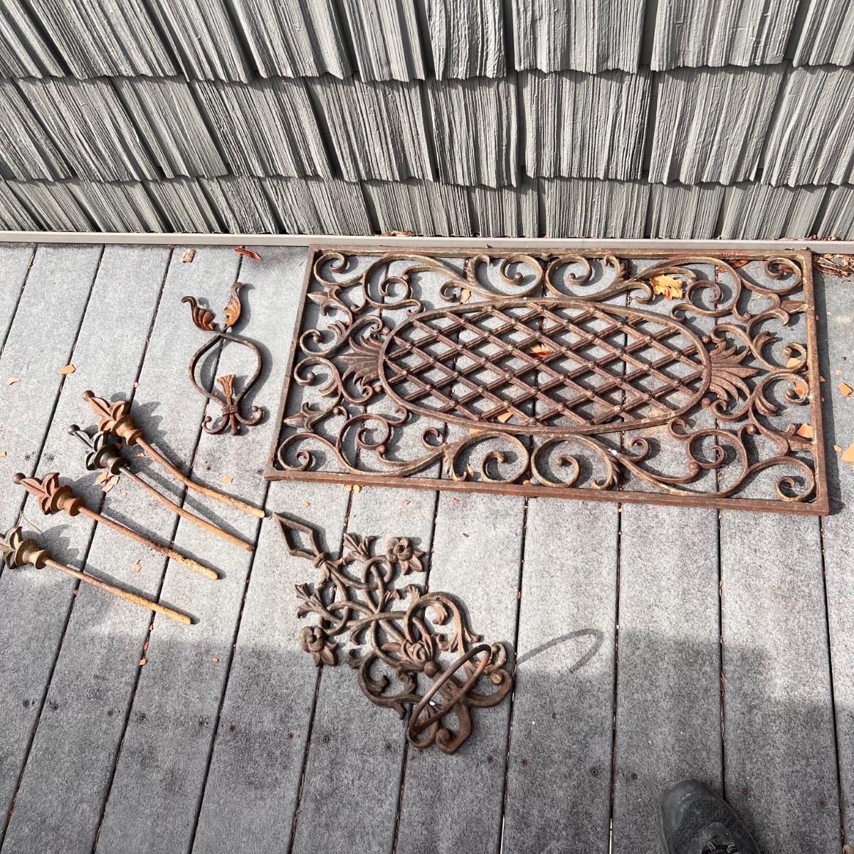 A nice assortment of iron yard decor includes a door mat, some fleur-de-lis stakes and a hanging potholder. All have a rust patina.