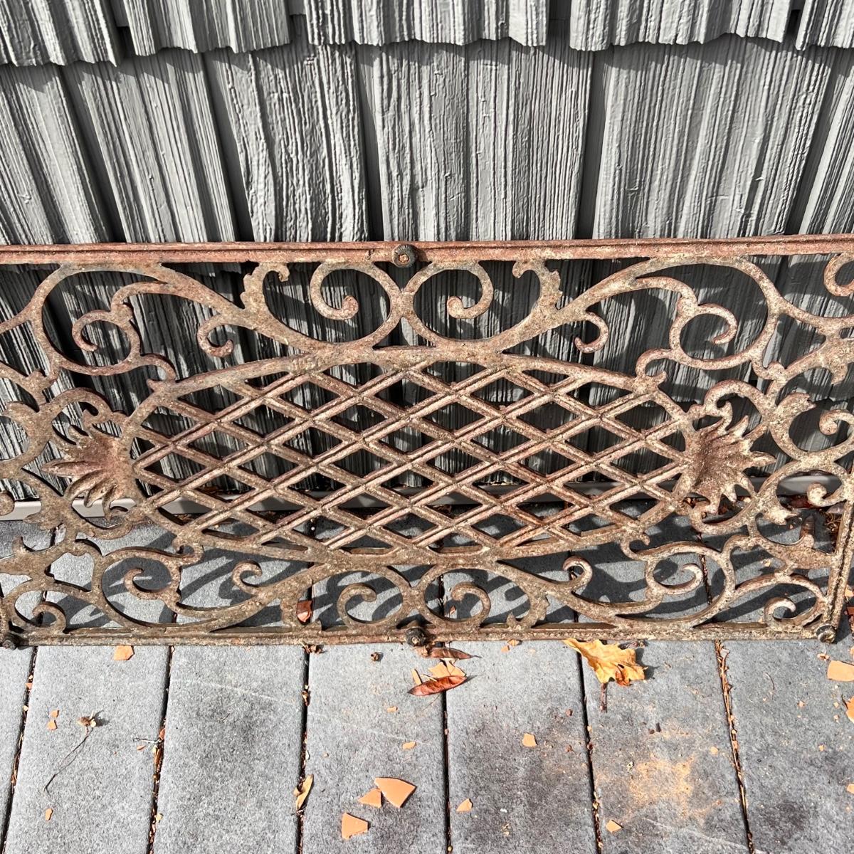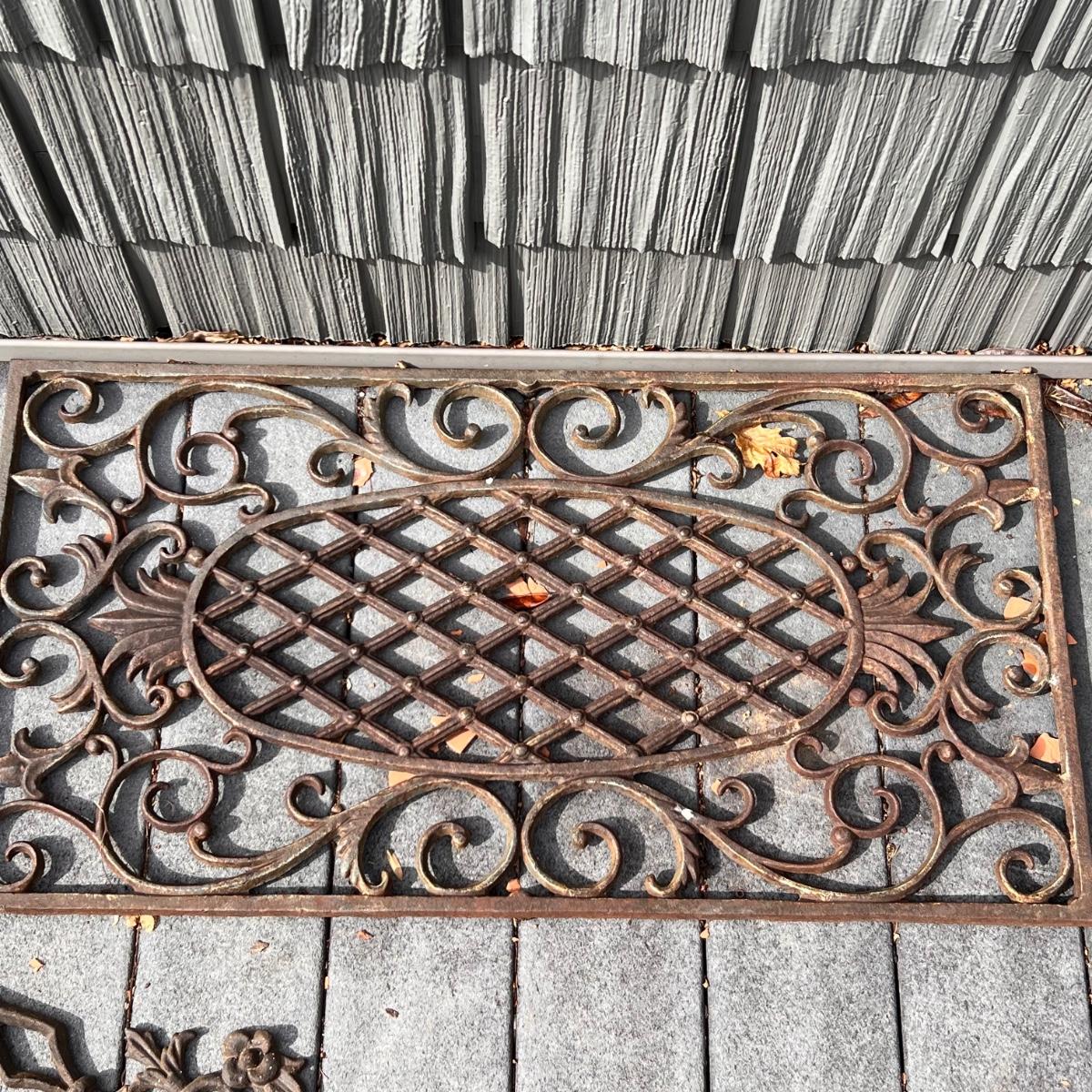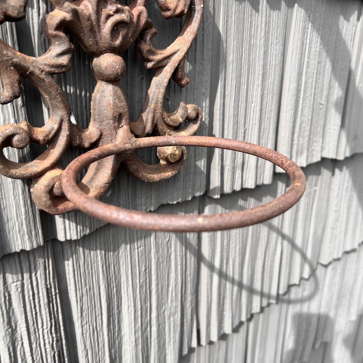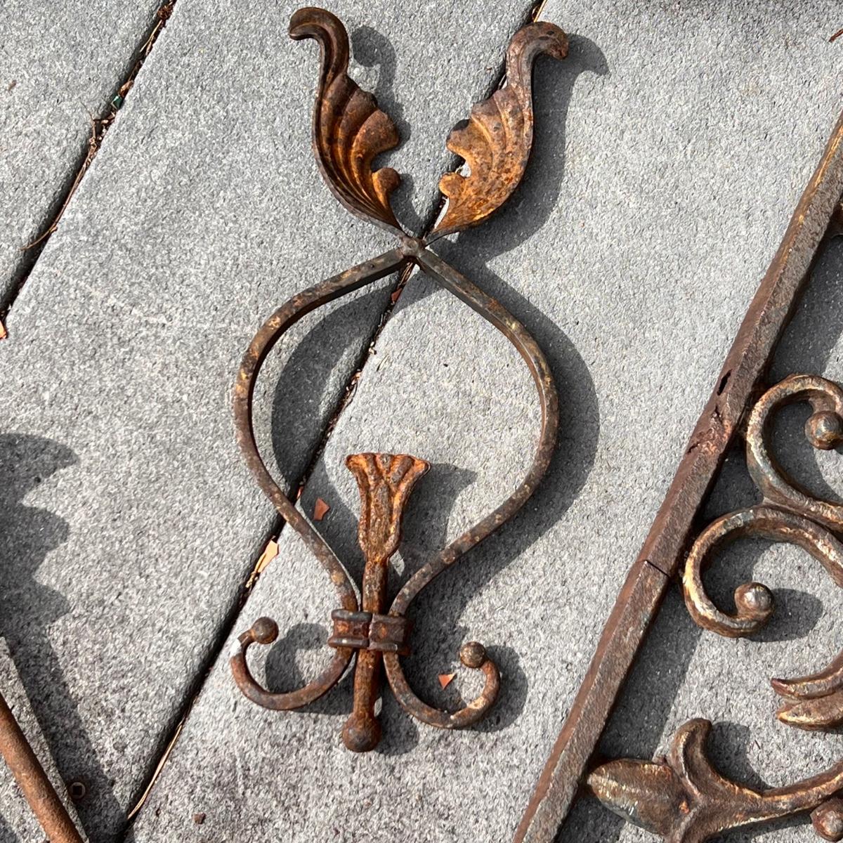 A nice assortment of iron yard decor includes a door mat, some fleur-de-lis stakes and a hanging potholder. All have a rust patina.